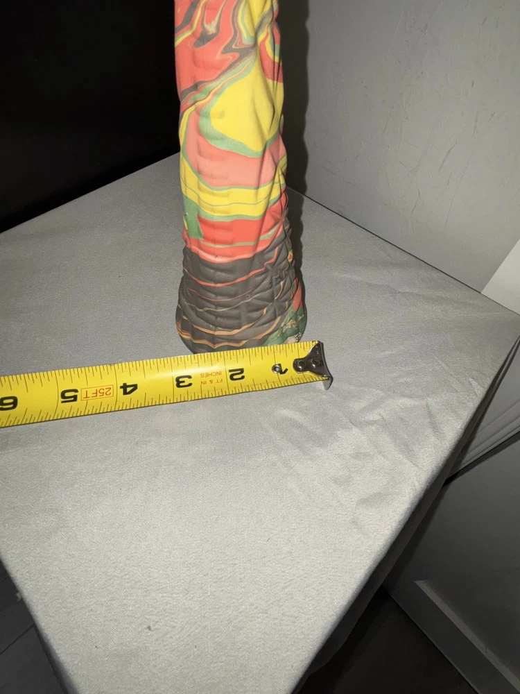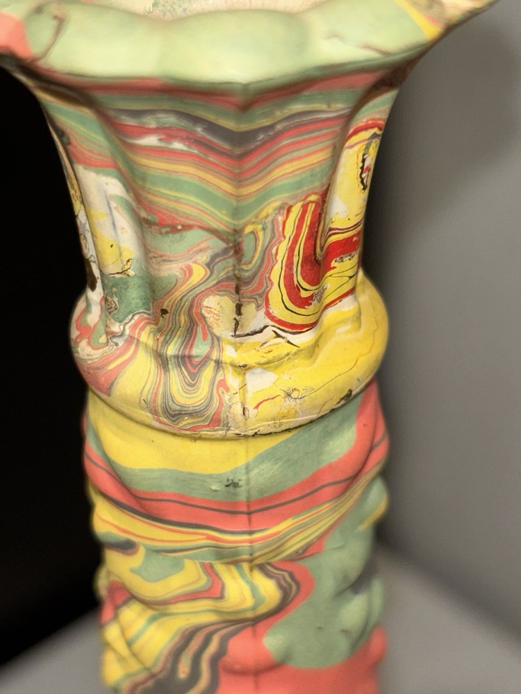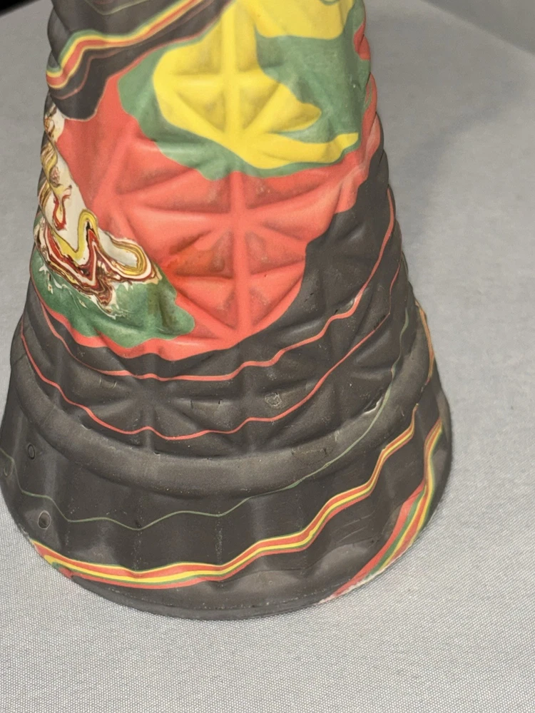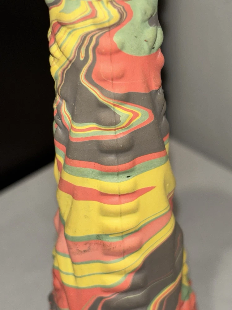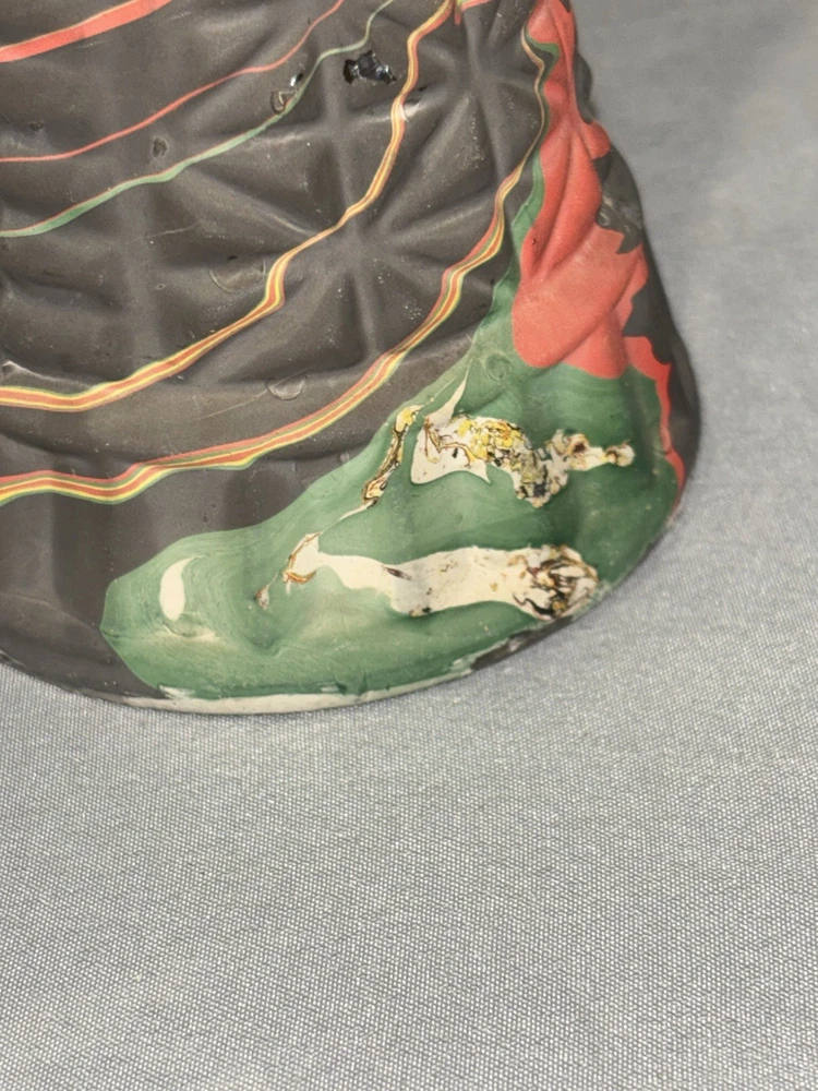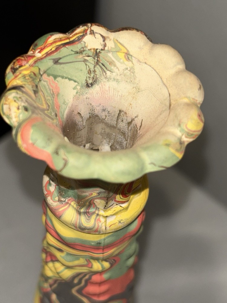 This vintage vase is a unique addition to any collection. The mid-century modern design, with its hand-painted details, makes it a one-of-a-kind piece. The ceramic vase stands at 9 inches tall and features a vibrant orange color. It is perfect for displaying flowers or as a standalone decorative item. The vase is unmarked but is likely from the Century product line.