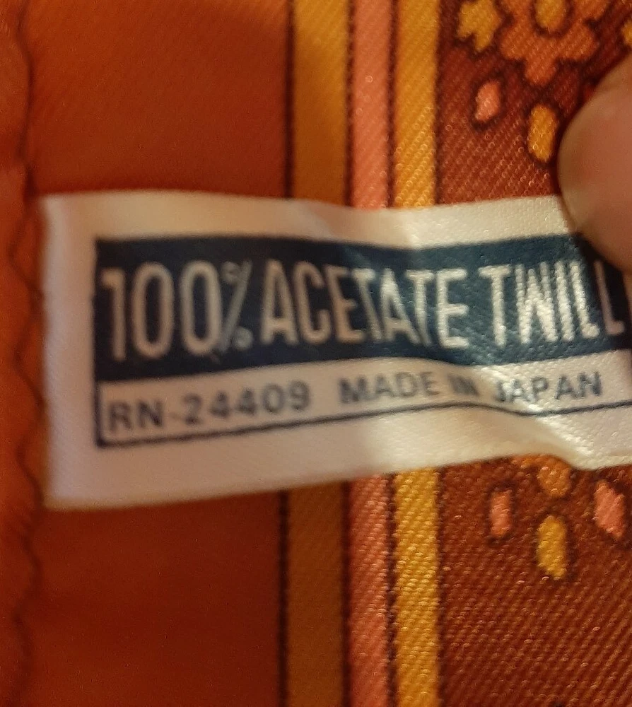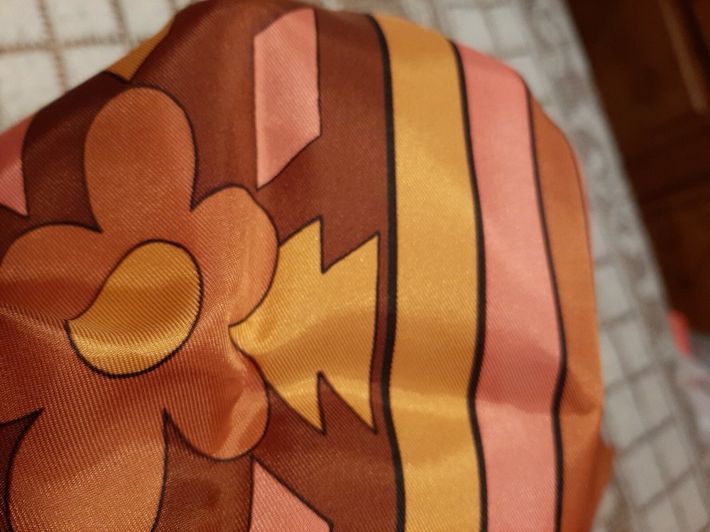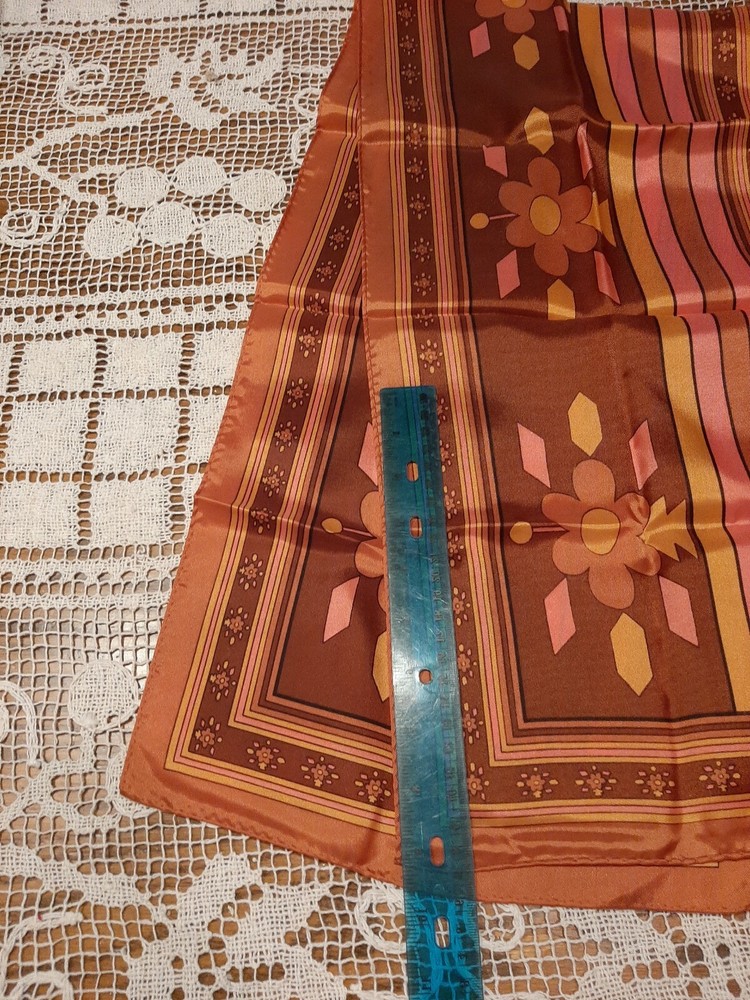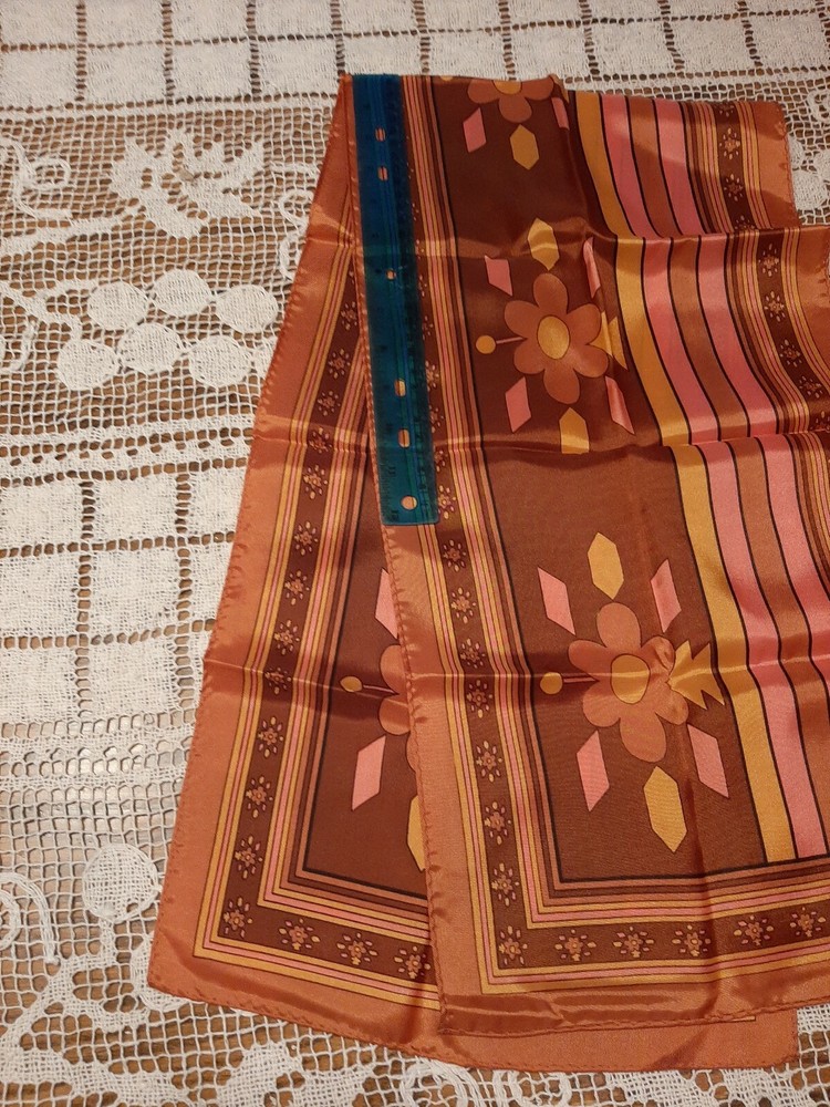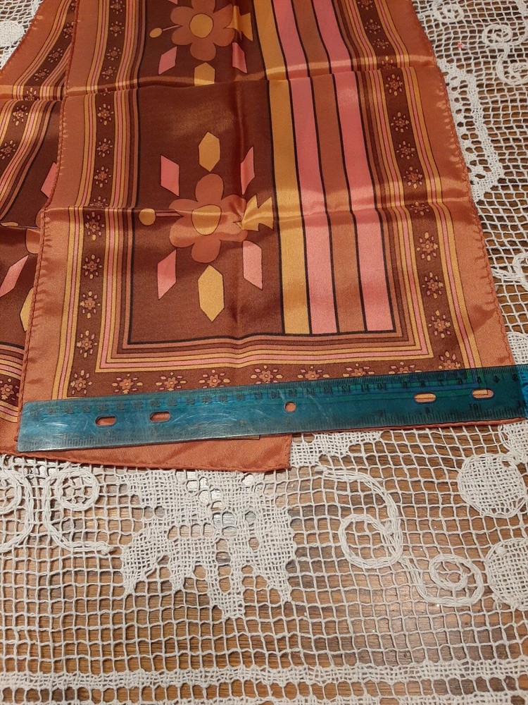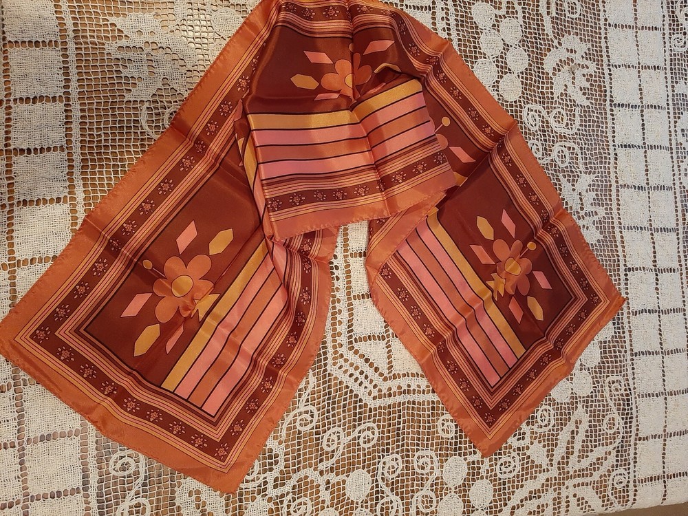 Mid Century Vintage Ladies Retro Scarf 43"x 11", stripes and floral burnt orange/pink,Japan. The scarf is in excellent condition with shiny finish and no stains or flaws. This item is being offered with one day handling. If you are not completely satisfied that this item is as described, you may return it within 30 days of delivery. Buyer pays return shipping and handling costs. Shipped with USPS Ground Advantage