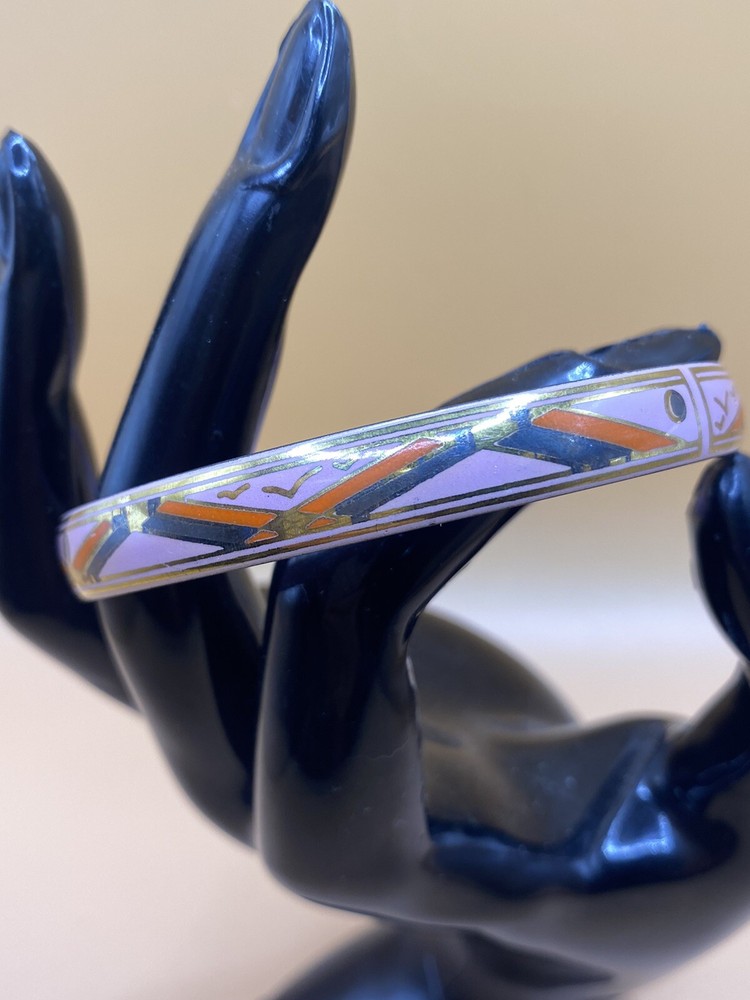 Add a touch of vintage charm to your jewelry collection with this beautiful Marlene enameled bangle bracelet. The round shape and unique combination of pink, gold, and orange colors make it a statement piece that will elevate any outfit. The bracelet is signed and features a bangle style that is perfect for women who love fashion and vintage jewelry. Made from high-quality enamel, this bracelet is durable and has a vintage feel that is sure to impress. It is a perfect addition to any jewelry collection and is ideal for those who love to make a statement with their accessories. The bracelet is a must-have for women who appreciate unique, one-of-a-kind pieces.