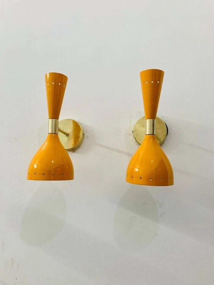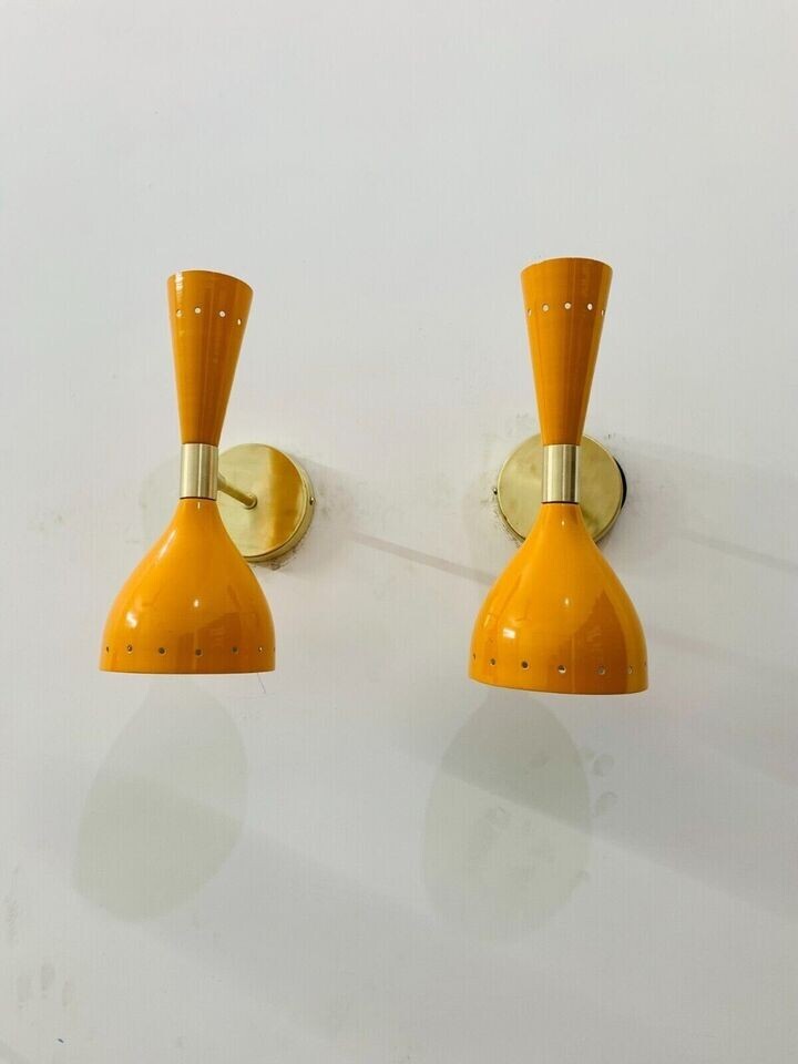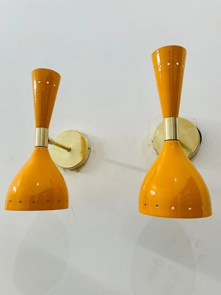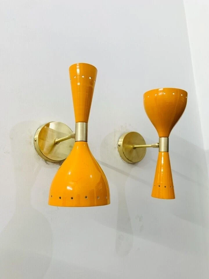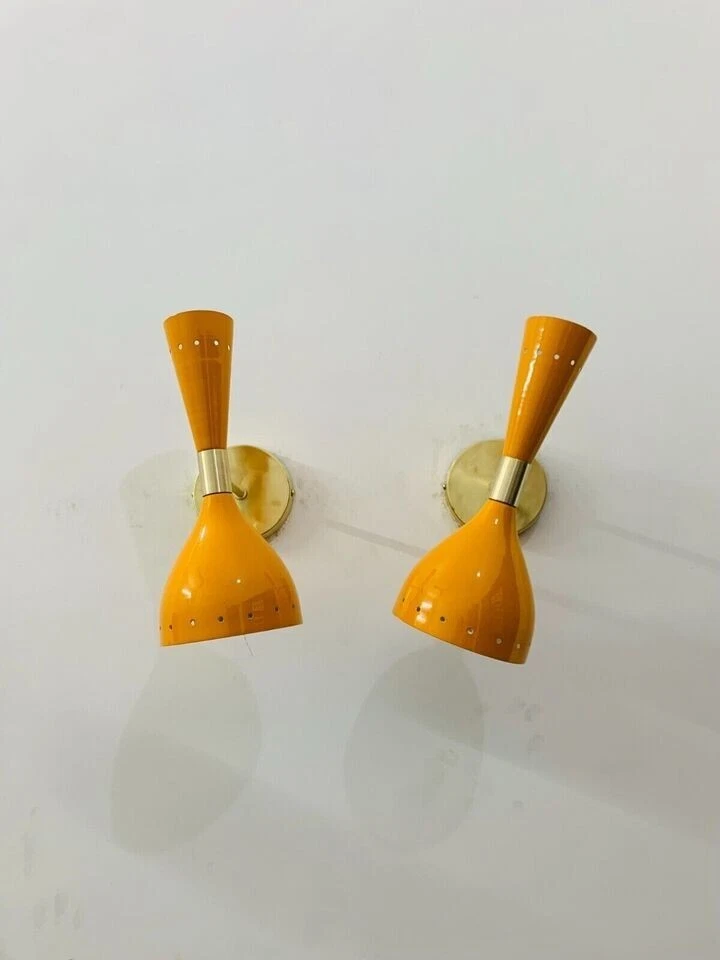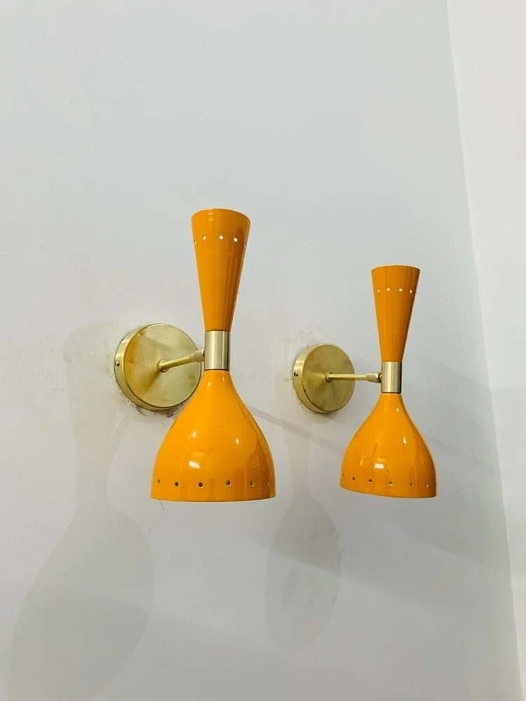Measurements is :L x 10.5 inch B x 5'' inch H x 8'' inch Wall canopy To Light Socket Edge • Set of Two Diabolo Wall Fixture • Orange Glass Finish • Wall Fixture used standard sconce E-12 or E-14 light bulbs. (not included) • Canopy 4''inch • Reproduction Production Not Sold Antique. MATERIALS: • Brass, Metal • All Components are UL approved. BULB TYPE: • Requires Four (4) 15 watt bulb type A (not included). • E-12 or E-14 socket Rated with 125 voltage, 75 watt max. • 7 watt to 15 watt bulbs are recommended. • Incandescent Bulbs, Energy Saying, LED Bulbs.