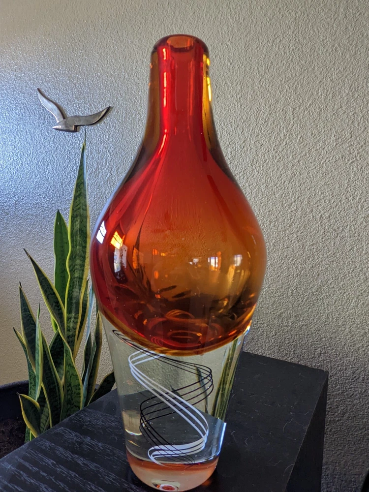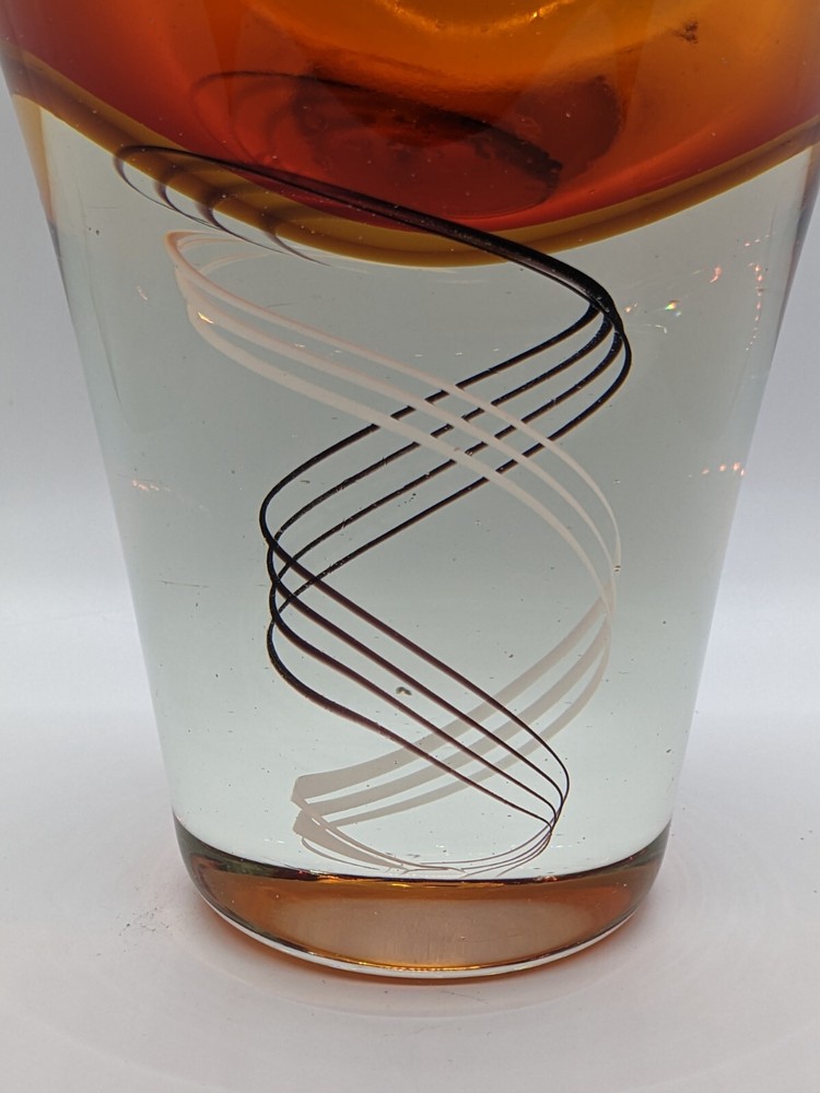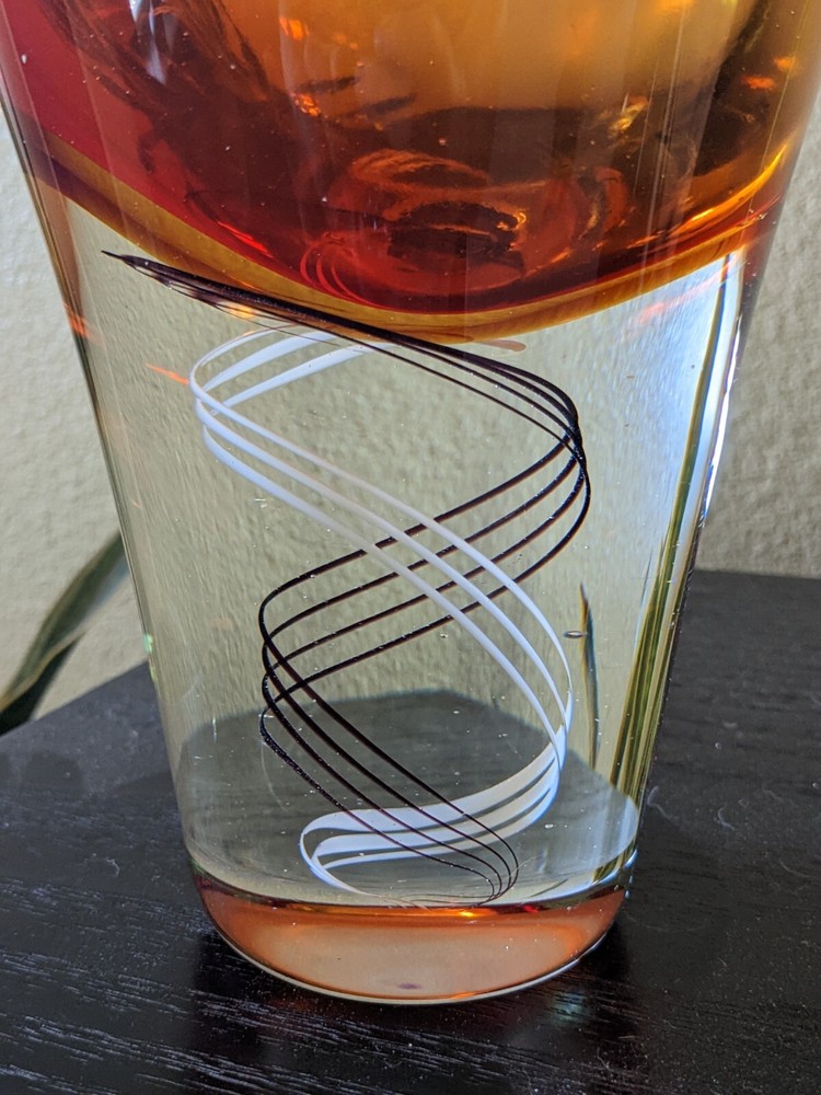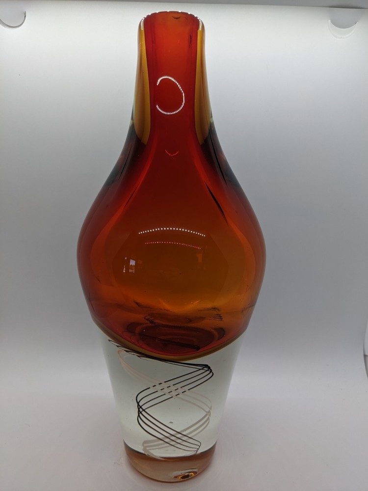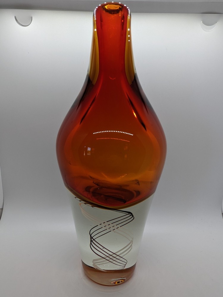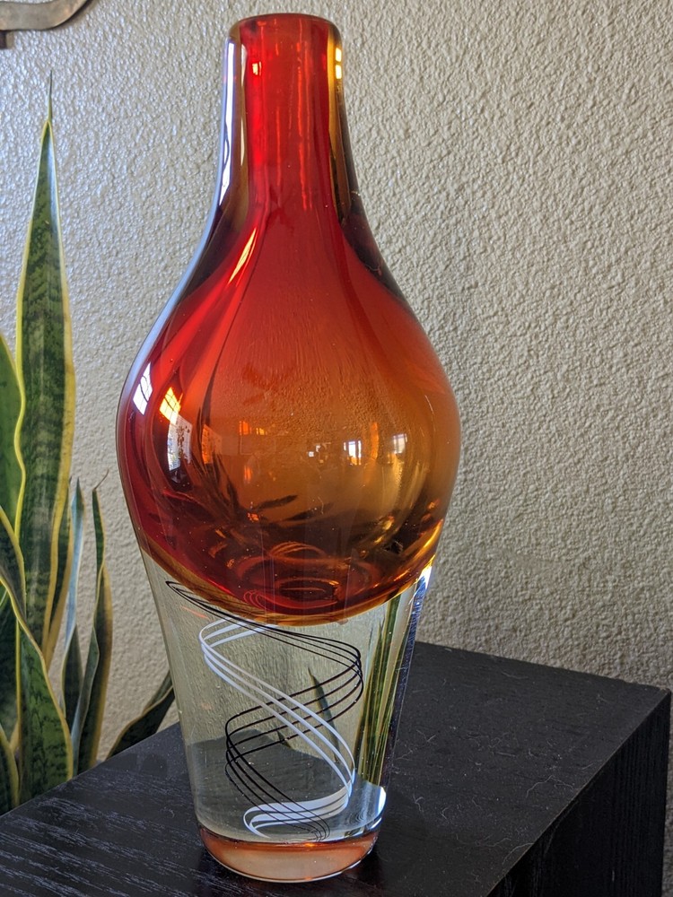 Mid Century inspired Art Glass Heavy Vase Orange DNA Swirl 12.5" modern design Design inspired by the Klas-Goran Tinback Swedish Mid Century Art Glass Vase - Base 12.5" x 5.5" at widest point. No chips or cracks found, great condition, gorgeous colors. DNA swirl, very unique! See condition on photos.