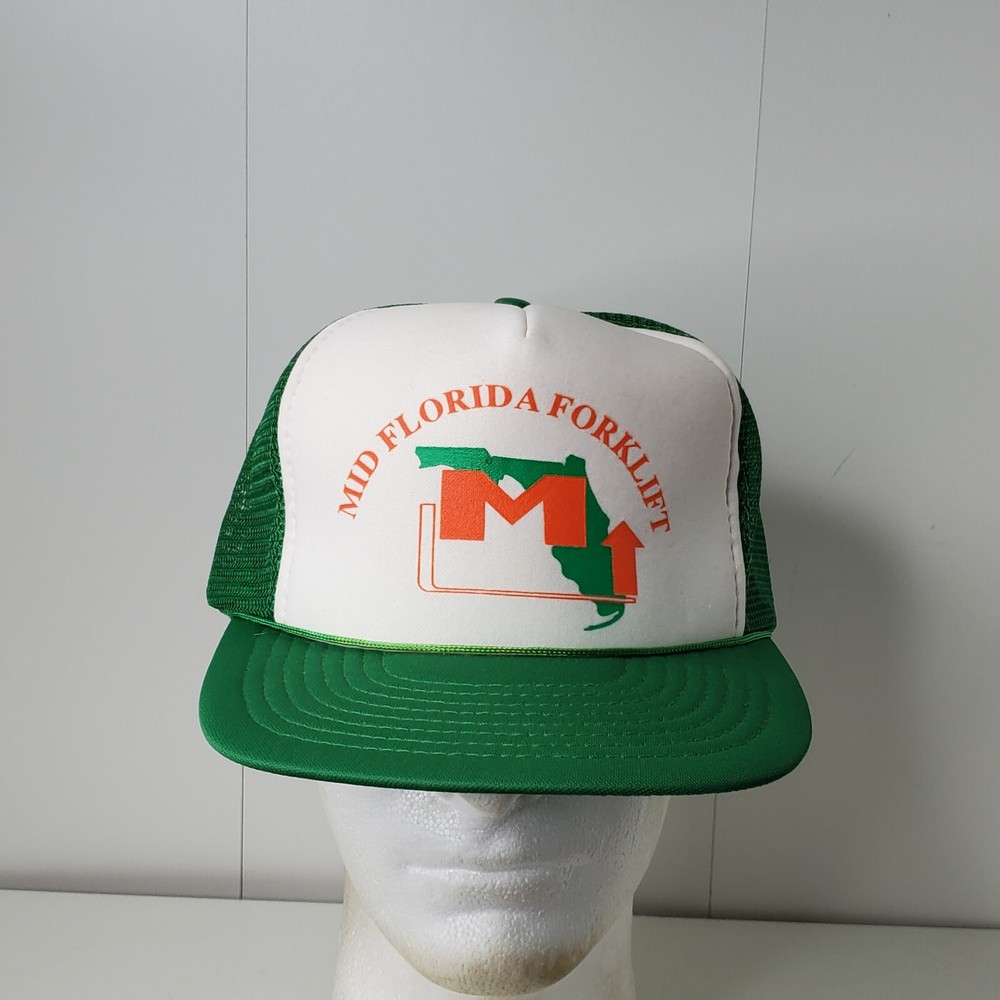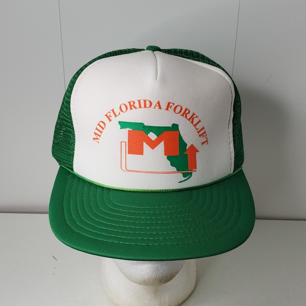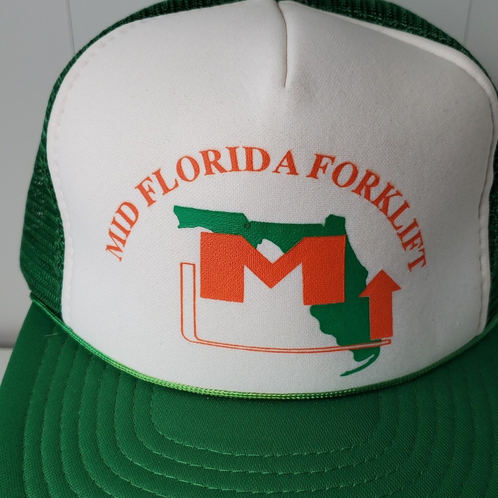 Mid Florida Forklift Logo Mesh Trucker Rope Hat Baseball Cap State Green Orange. See pictures for condition. All hats are shipped in boxes for protection.