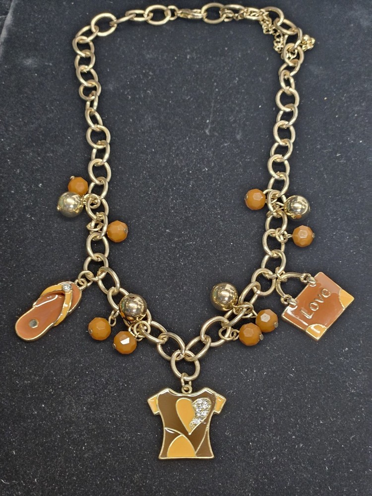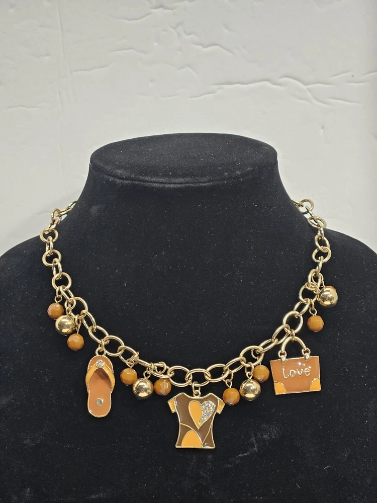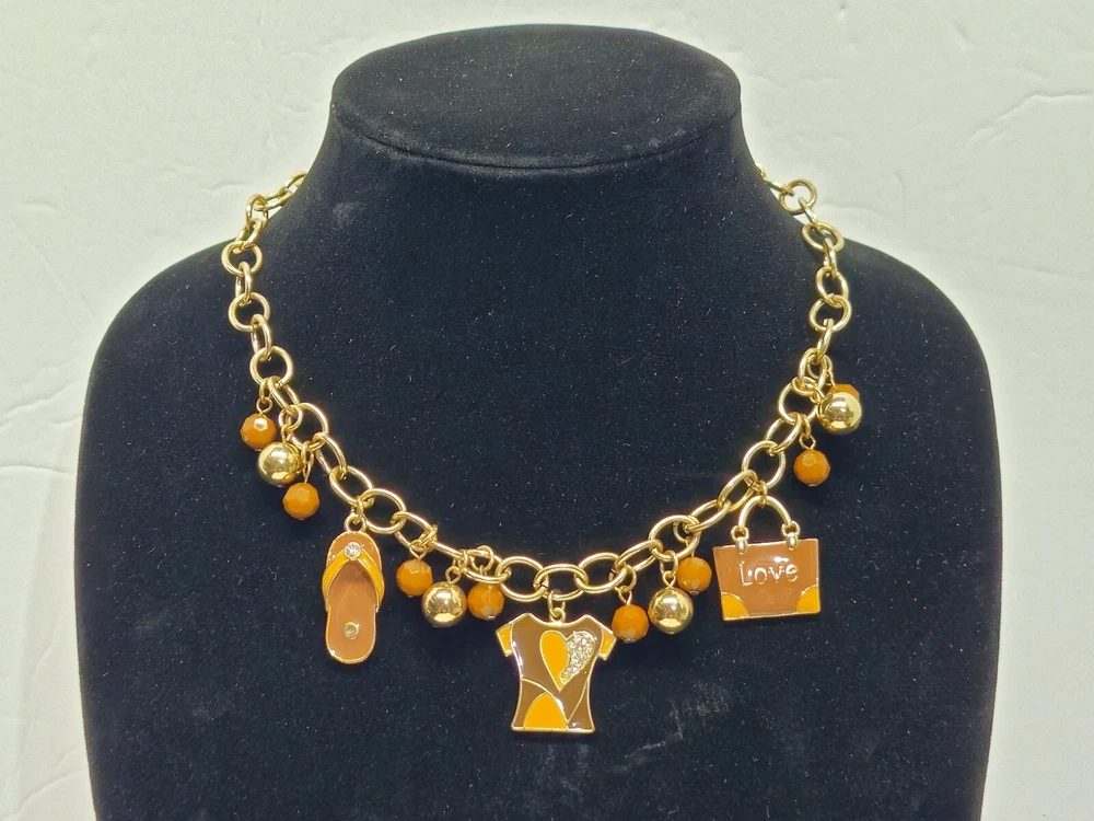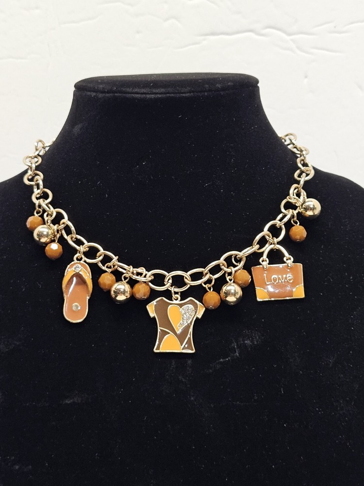 Mid Modern Gold Tone Brown & Orange Enamel Beaded Love Charm Choker Necklace. Unsigned beautiful piece. Please see the actual item in the photos for more details. Everything as is...