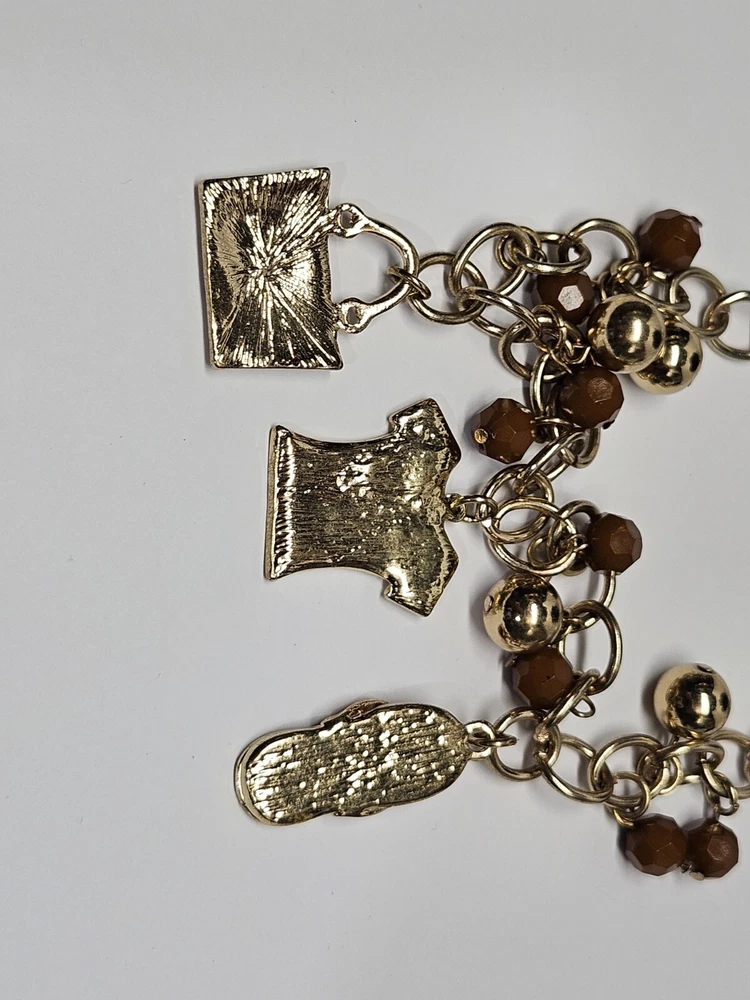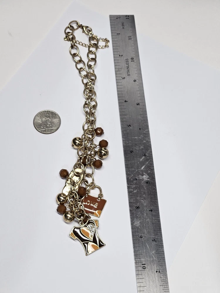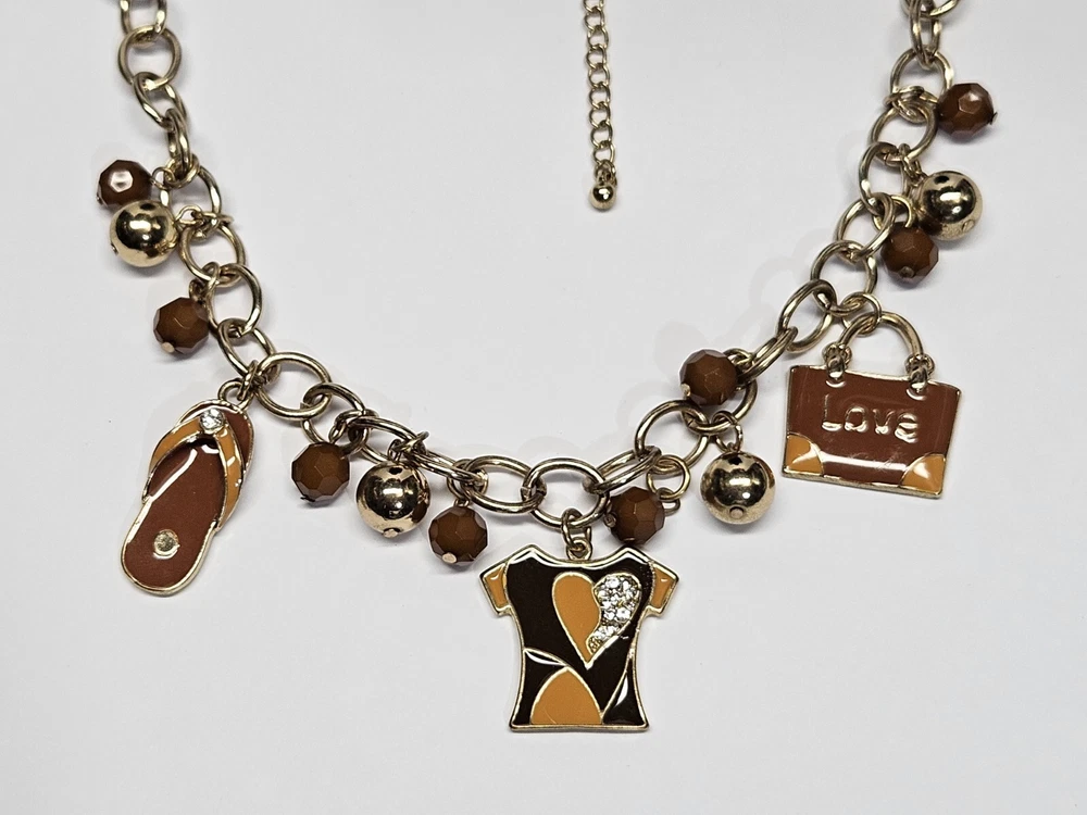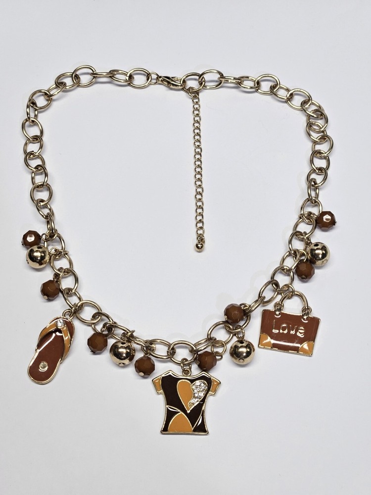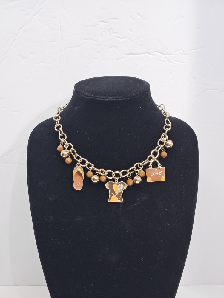 Mid Modern Gold Tone Brown & Orange Enamel Beaded Love Charm Choker Necklace. Unsigned beautiful piece. Please see the actual item in the photos for more details. Everything as is...