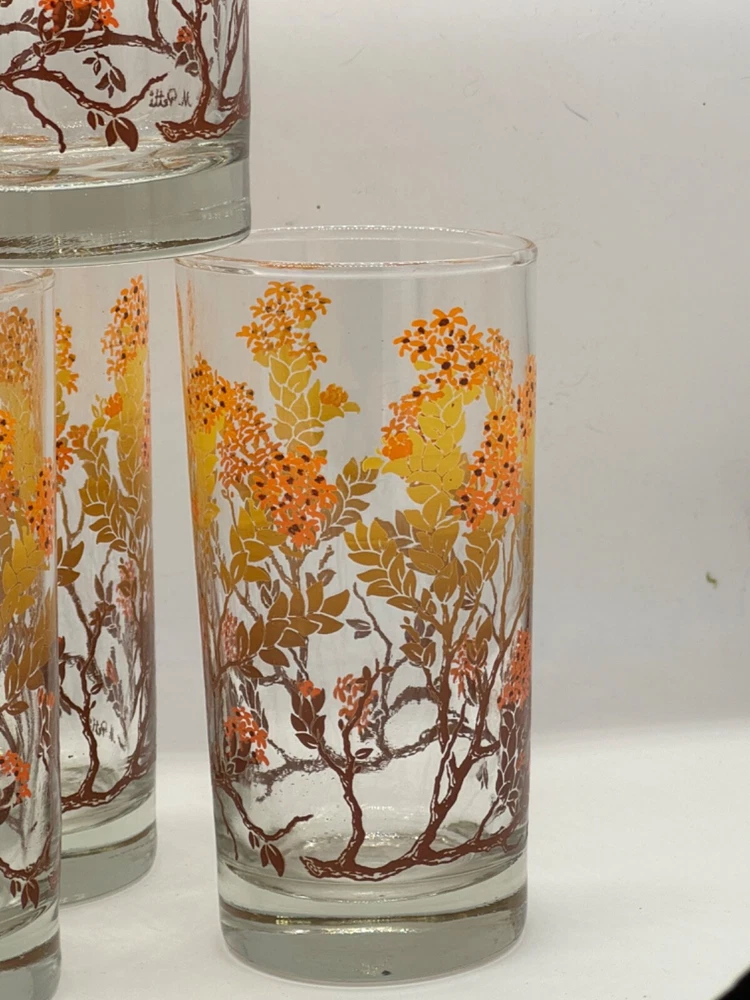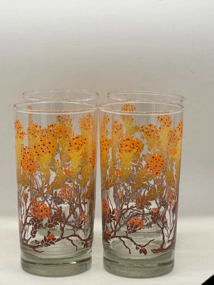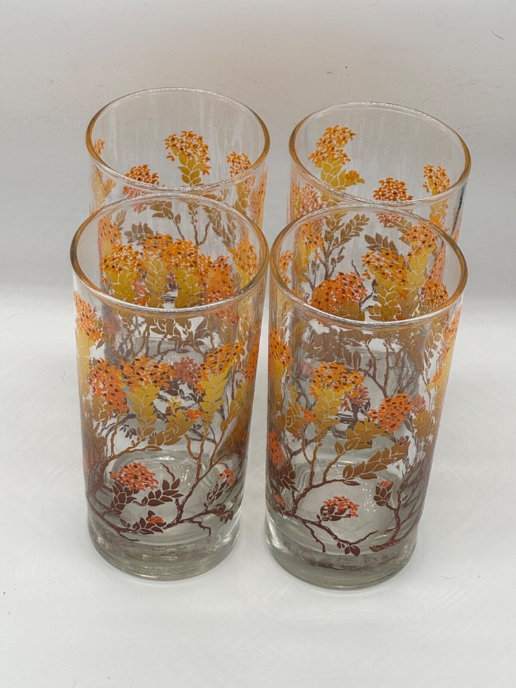 Mid century, collectible, 5 1/2” high glasses featuring great graphics of orange and yellow flowers Holds approximately 11 oz. No cracks or chips , Glass box 1/29/24#A