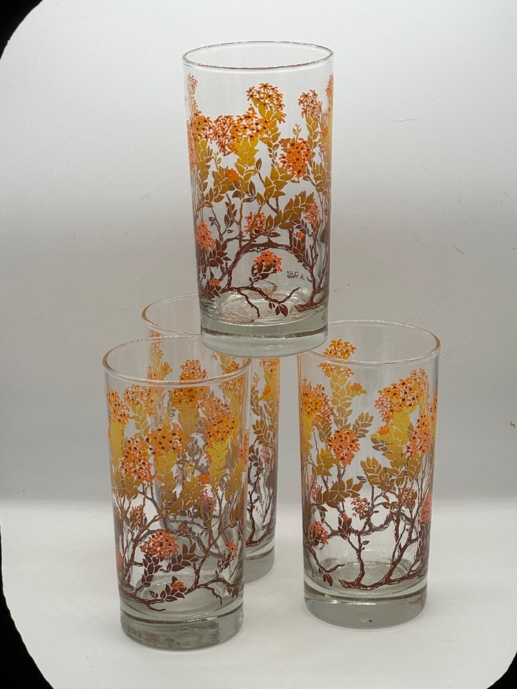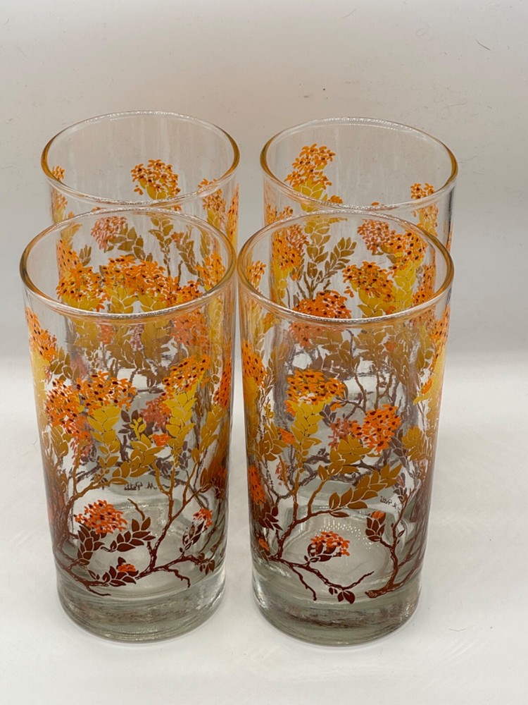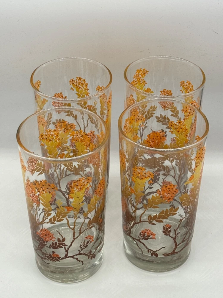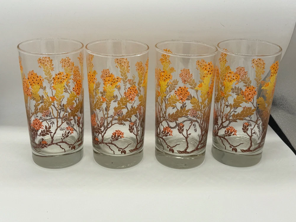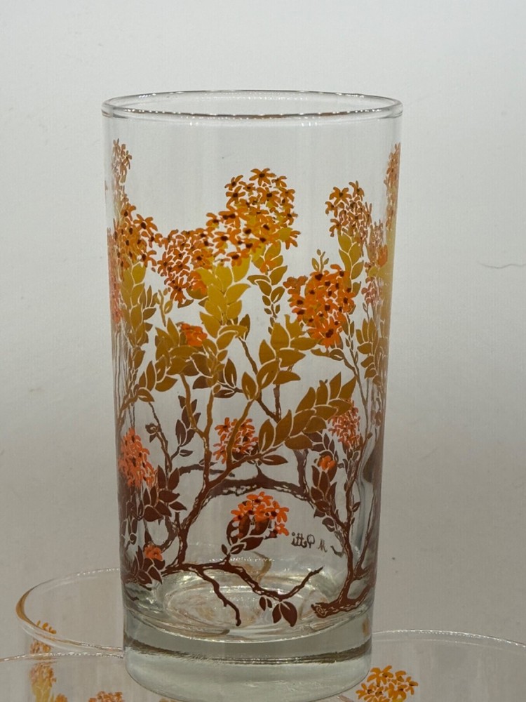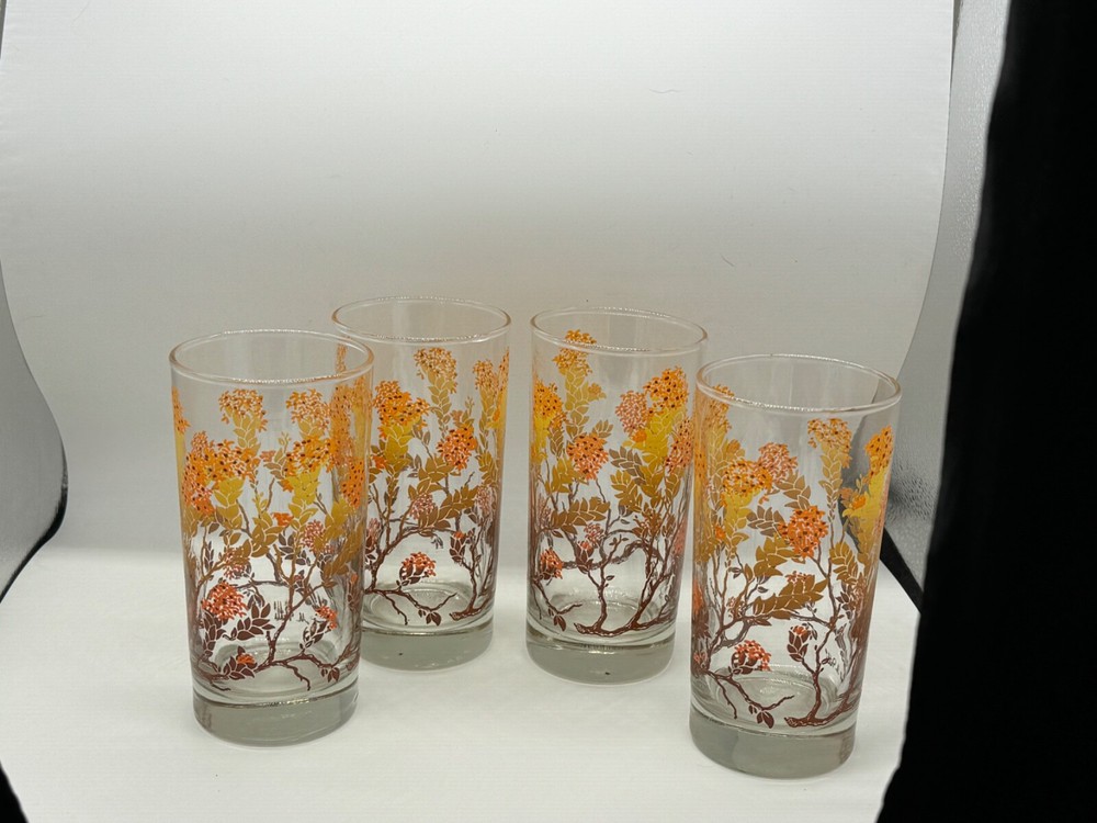 Mid century, collectible, 5 1/2” high glasses featuring great graphics of orange and yellow flowers Holds approximately 11 oz. No cracks or chips , Glass box 1/29/24#A...