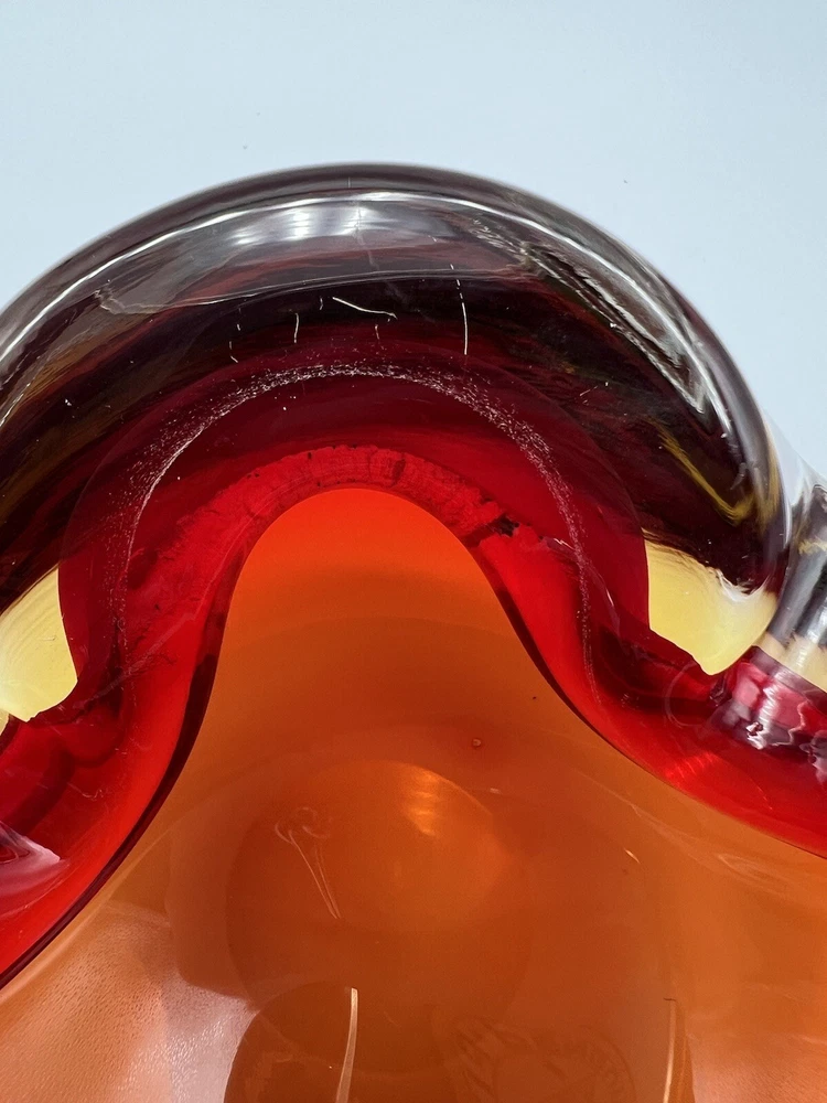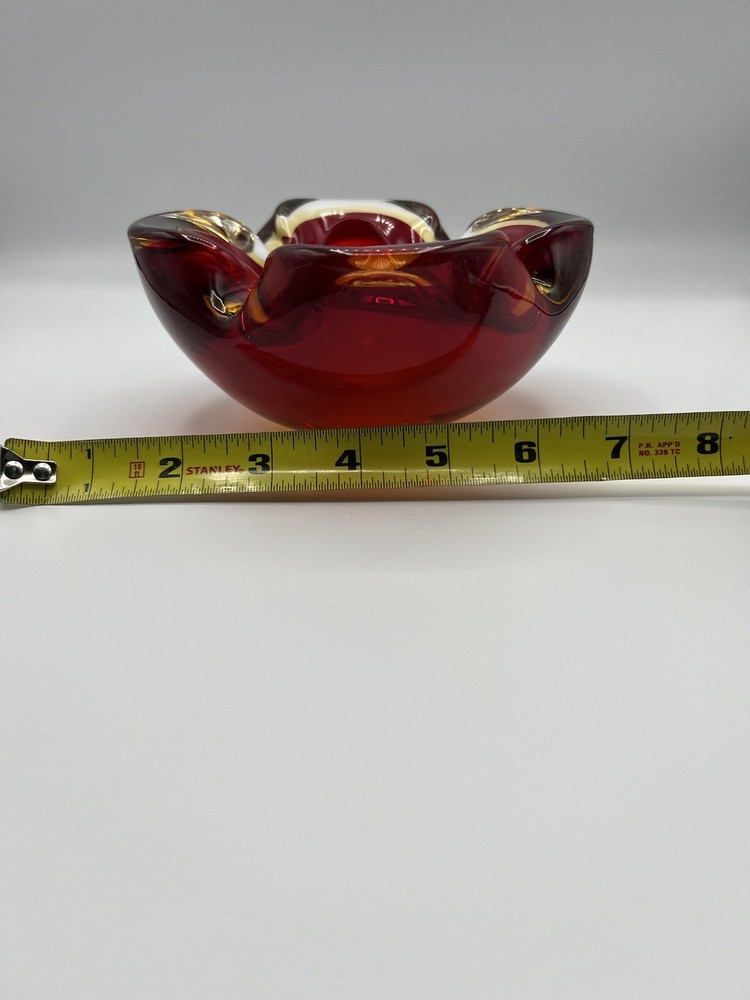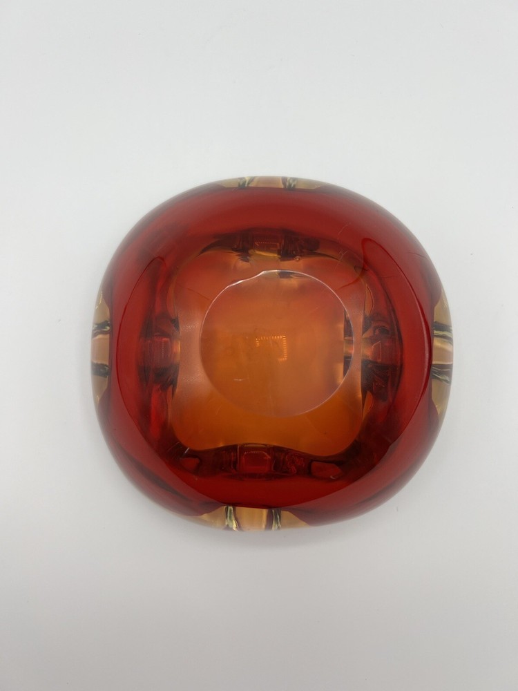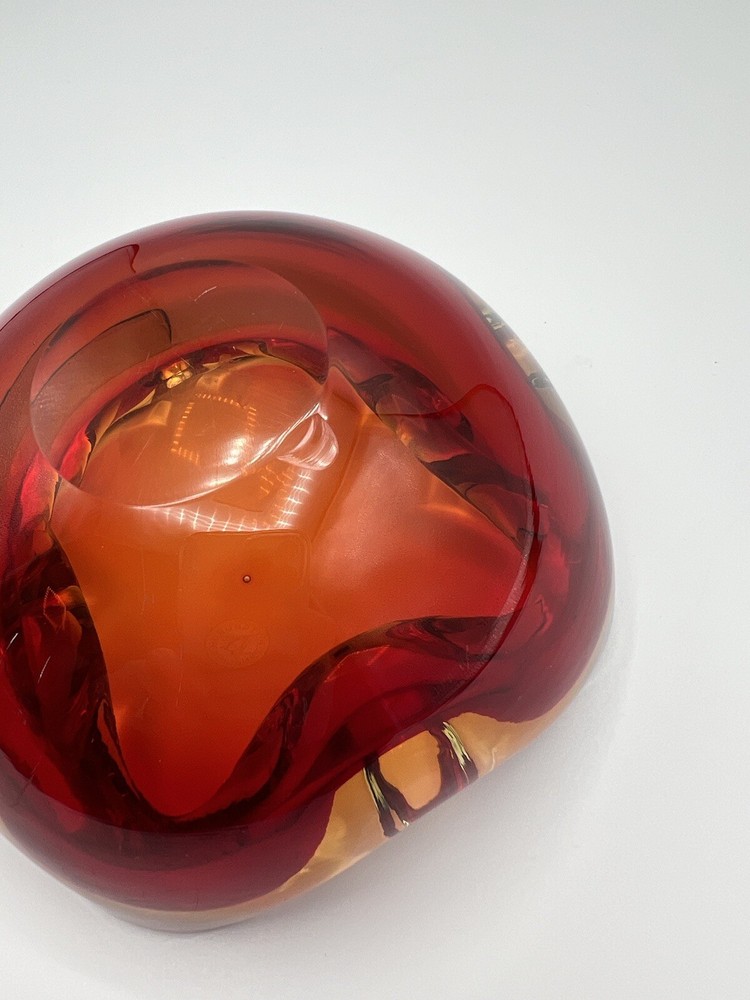 This stunning Italian glass bowl/ashtray features a beautiful 3D effect and is made by the renowned brand Vetri d'Arte. The vibrant red and orange colors are reminiscent of a mid-century modern style, and the hand-blown glass production technique adds to its unique charm. Small swirl in the glass follows the ruby red outline. The bowl/ashtray measures 6.5 inches in width and is part of the Century product line. It is a vintage item from the mid-20th century (1960-1969) and has a Murano origin with a cased pattern. Although it has been previously used, it is in excellent condition and will make a fantastic addition to any collection. There is a chip at the very bottom (see photo) which is not visible when viewing the piece. There is also a small nick (see photo).