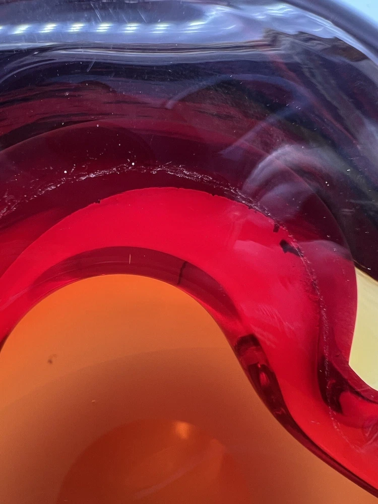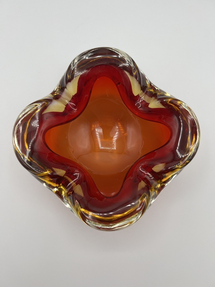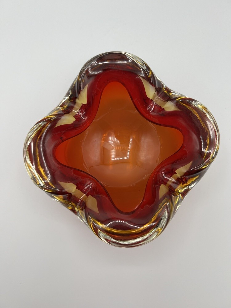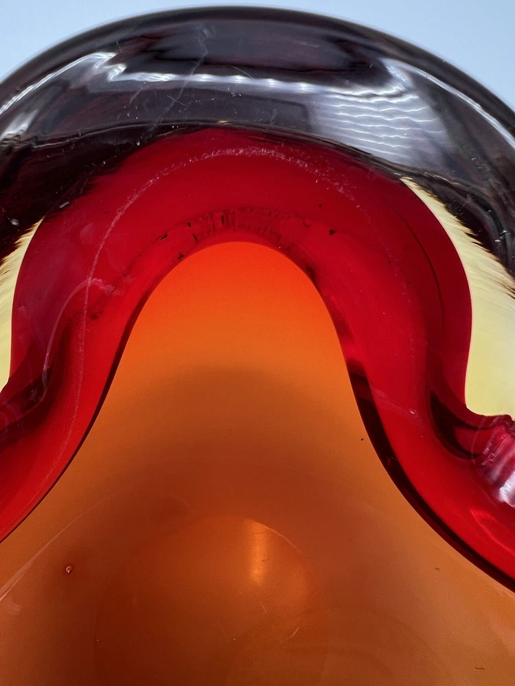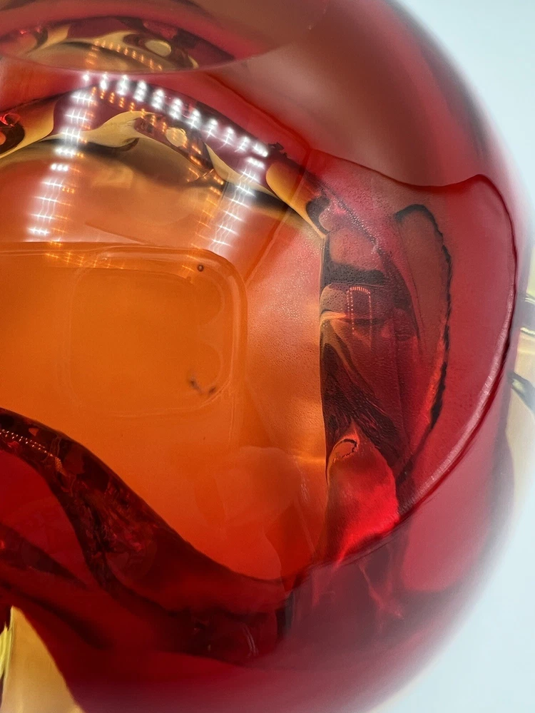 This stunning Italian glass bowl/ashtray features a beautiful 3D effect and is made by the renowned brand Vetri d'Arte. The vibrant red and orange colors are reminiscent of a mid-century modern style, and the hand-blown glass production technique adds to its unique charm. Small swirl in the glass follows the ruby red outline. The bowl/ashtray measures 6.5 inches in width and is part of the Century product line. It is a vintage item from the mid-20th century (1960-1969) and has a Murano origin with a cased pattern. Although it has been previously used, it is in excellent condition and will make a fantastic addition to any collection. There is a chip at the very bottom (see photo) which is not visible when viewing the piece. There is also a small nick (see photo).