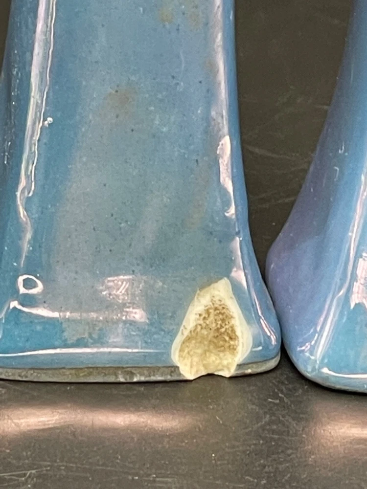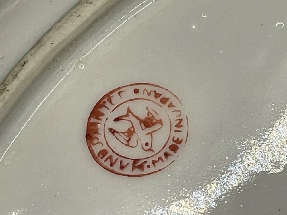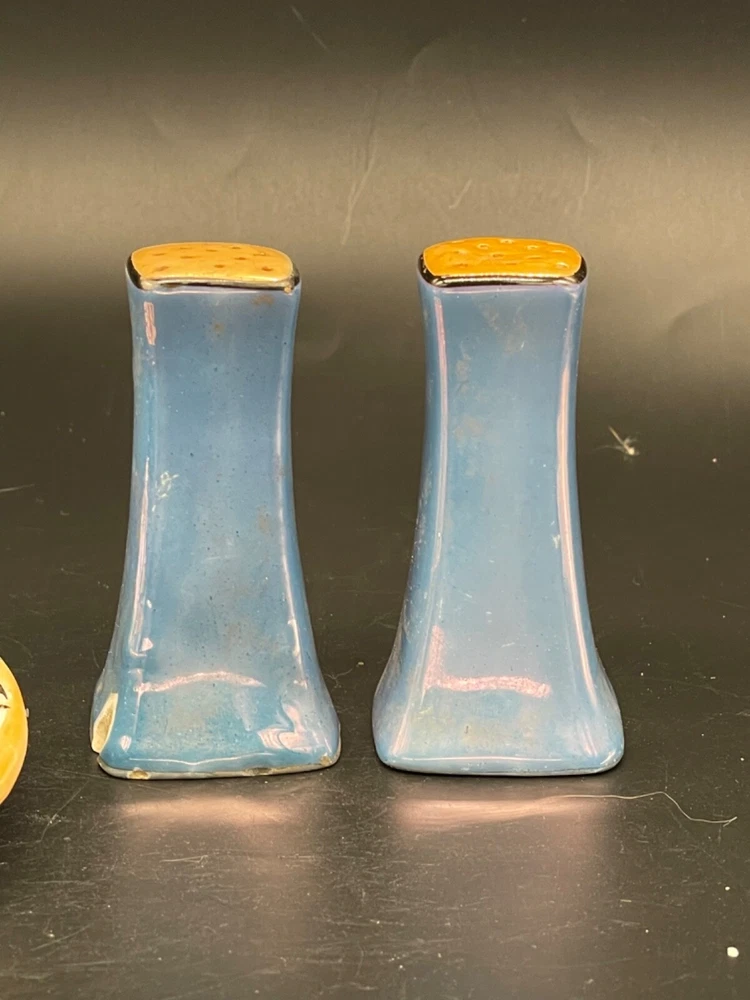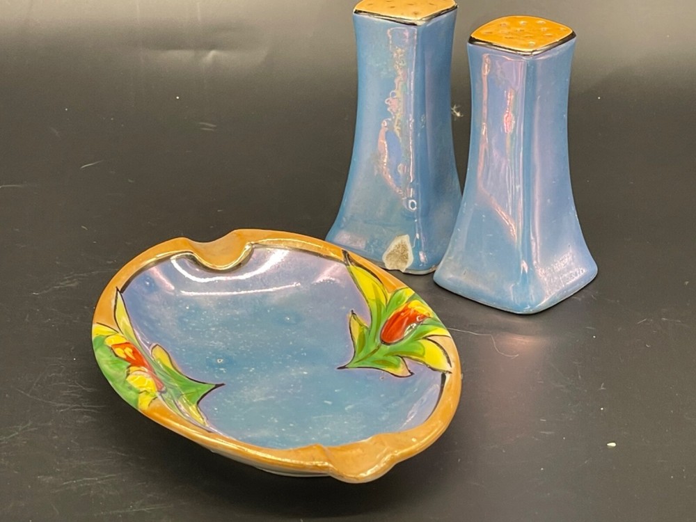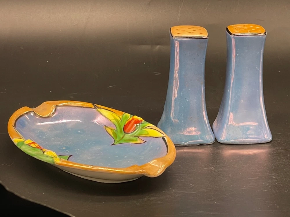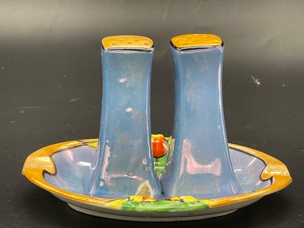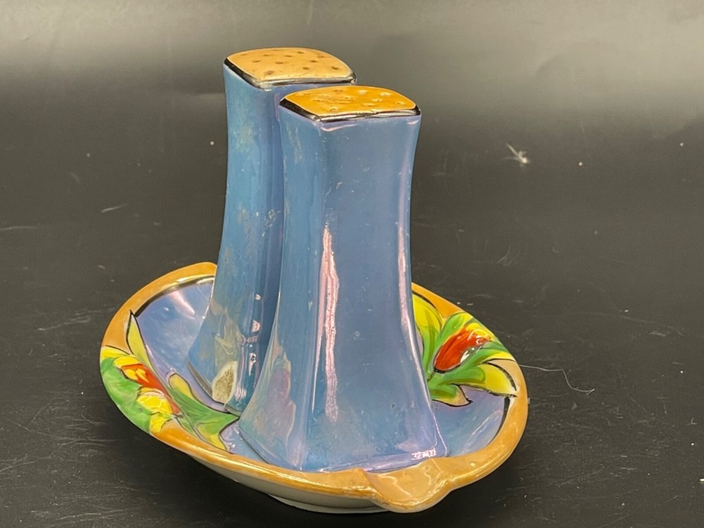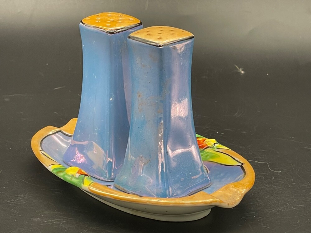 Mid century, blue/ orange , iridescent, salt/ pepper shakers and oval tray Tray measures 5 1/4” x 3 1/2” x 5/8” high, decorative flowers , hand painted Salt / pepper shakers measures, 3” high, one cork stopper is inside No cracks or chips Hand painted in Japan No cracks or chips on one, the other has a chip on the bottom on one side Box 95