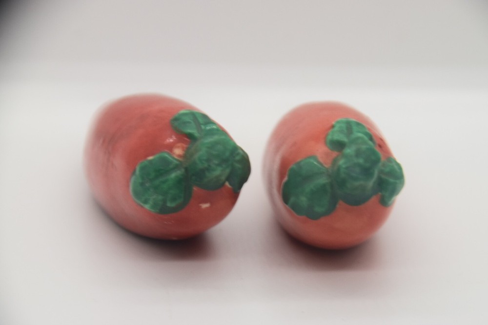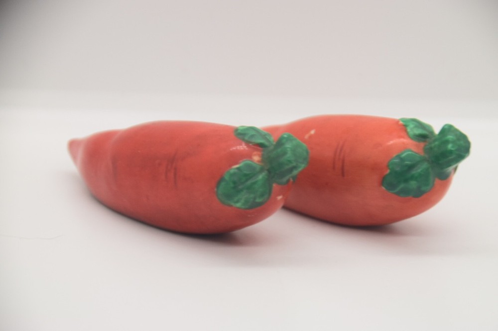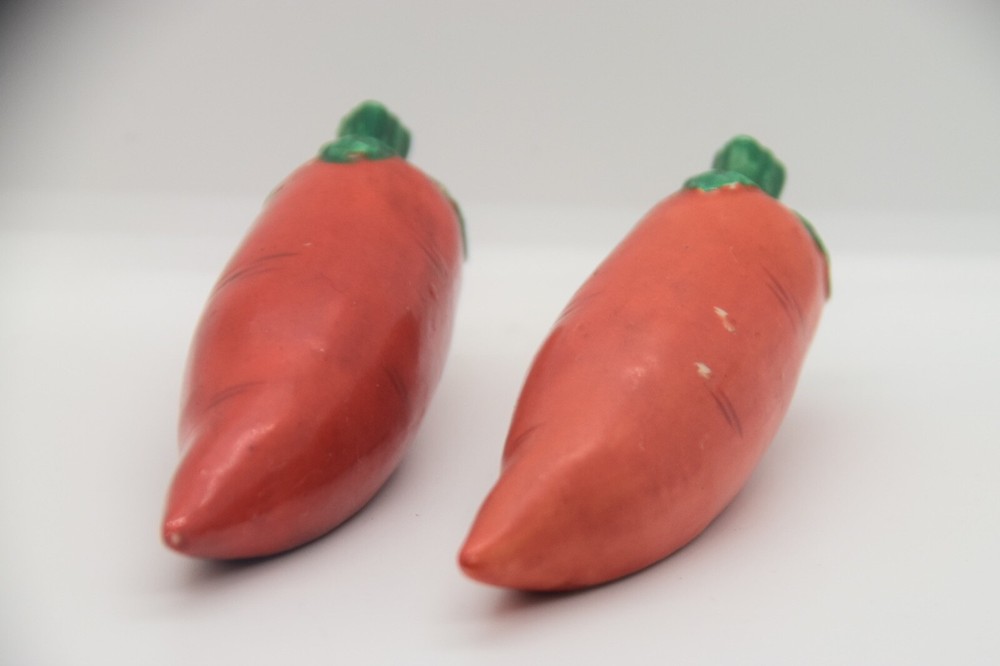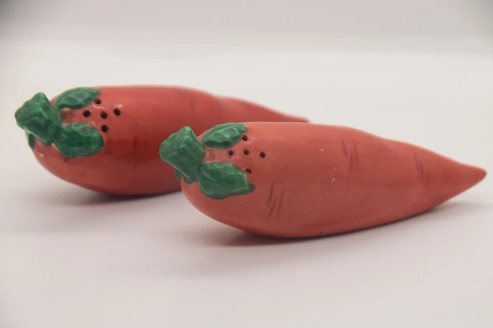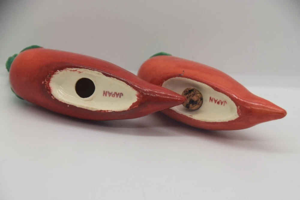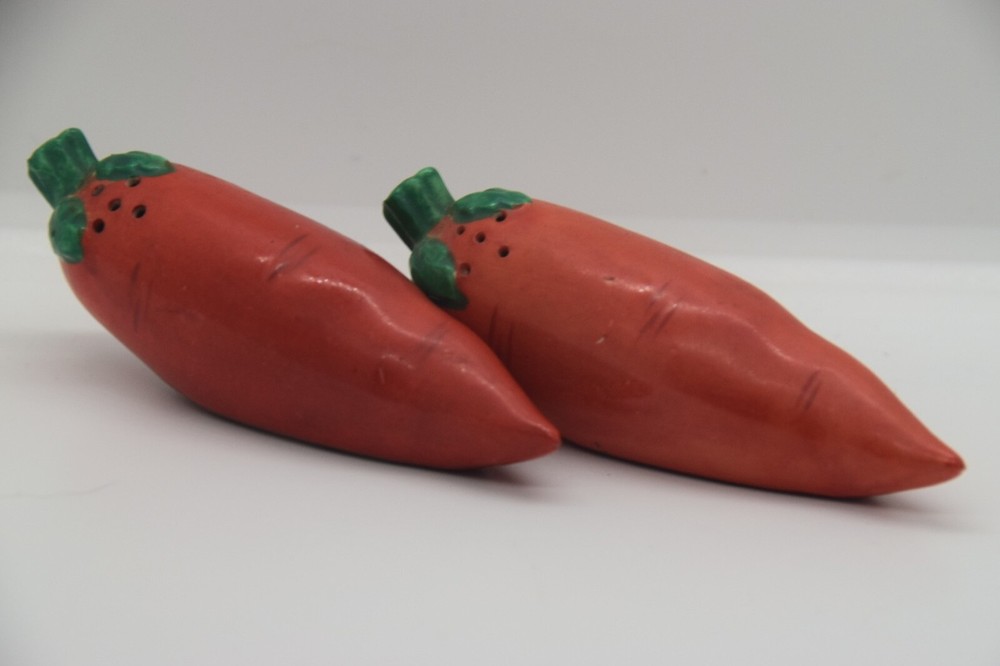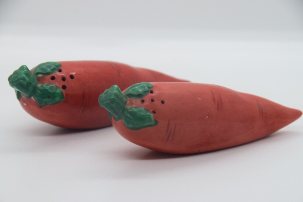 Mid century, ceramic, orange, carrot, salt/ pepper shakers No corks Measures 4” long No cracks or chips Hand painted, Japan