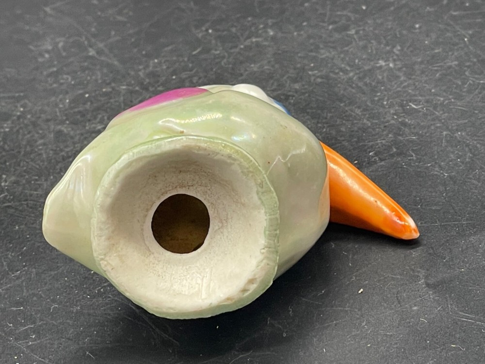 Mid century, ceramic bird with orange beak , small mark on the paint on the bottom of the beak Measures 2 3/8” high , no stopper Made in Japan Very good vintage condition Box 4/15/ 23