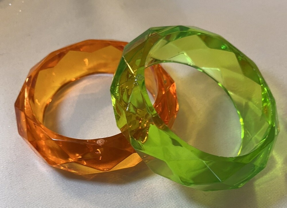 Here is a vintage pair of bangle bracelets that are faceted clear resin. These are in wonderful condition, clear with no scratches and bright colors. These will fit a good size wrist.