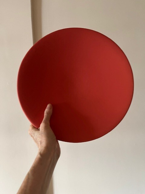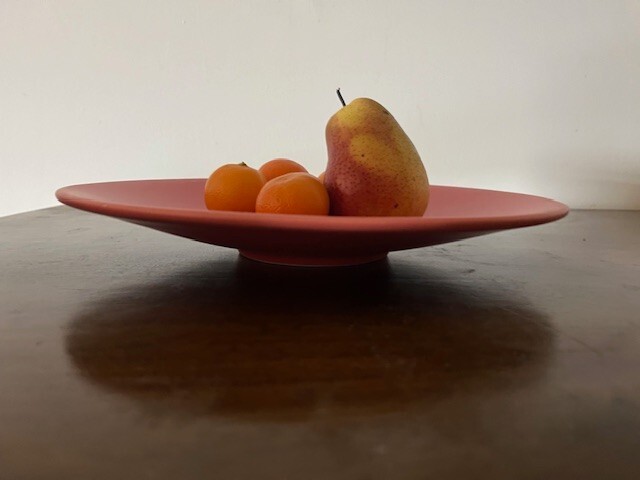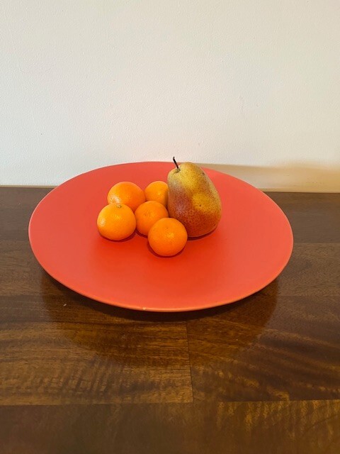 Gorgeous rare large showstopping smile inducing matte reddish orange ceramic fruit plate/ plate/ platter/ bowl. 12.5" circumference and 2" tall. Please note that there is a flea bite in the colour portion on the rim. Versatile, substantial and cool as hell. Merci;-)