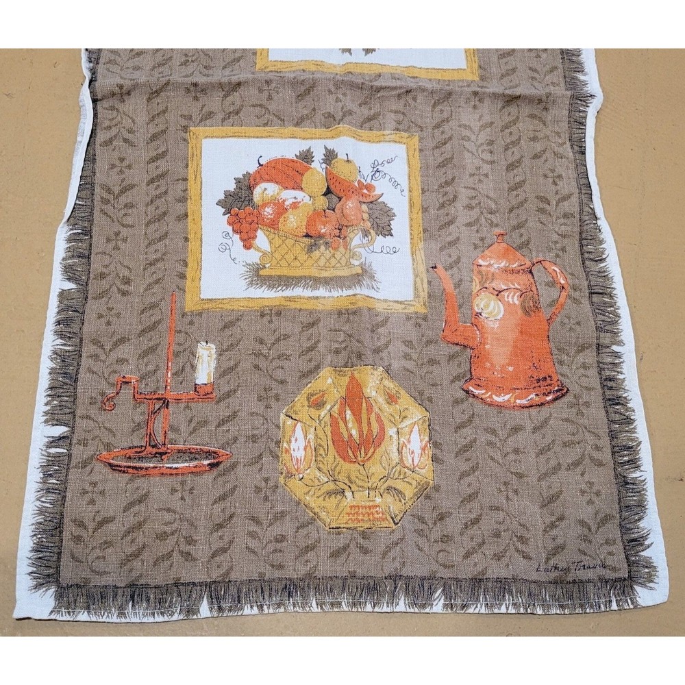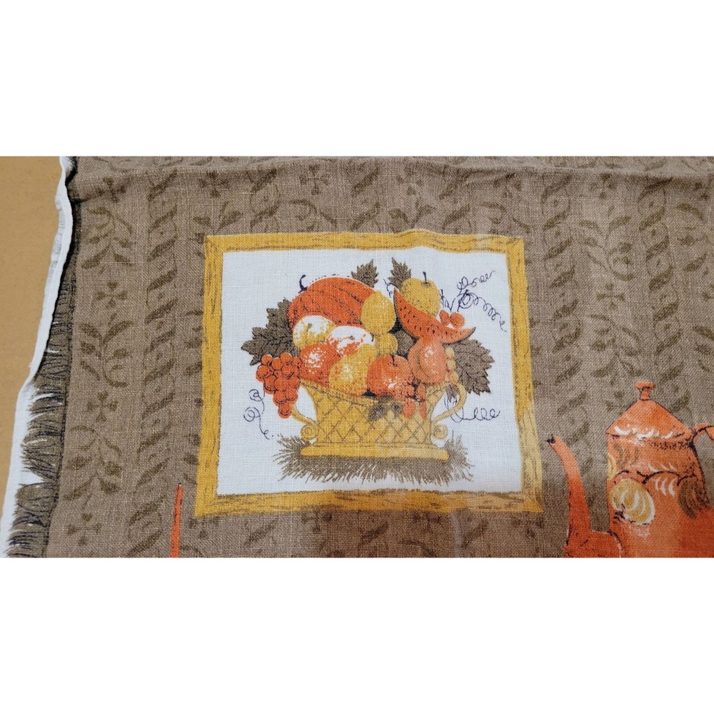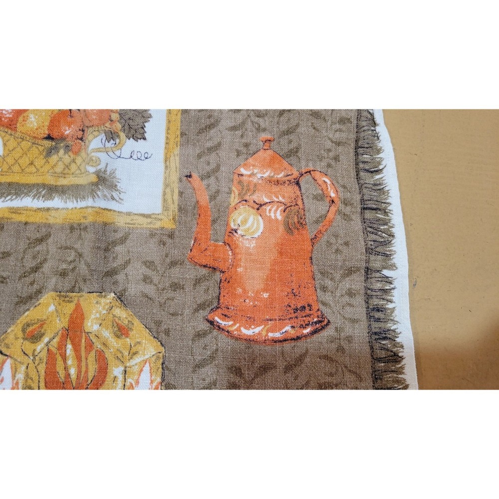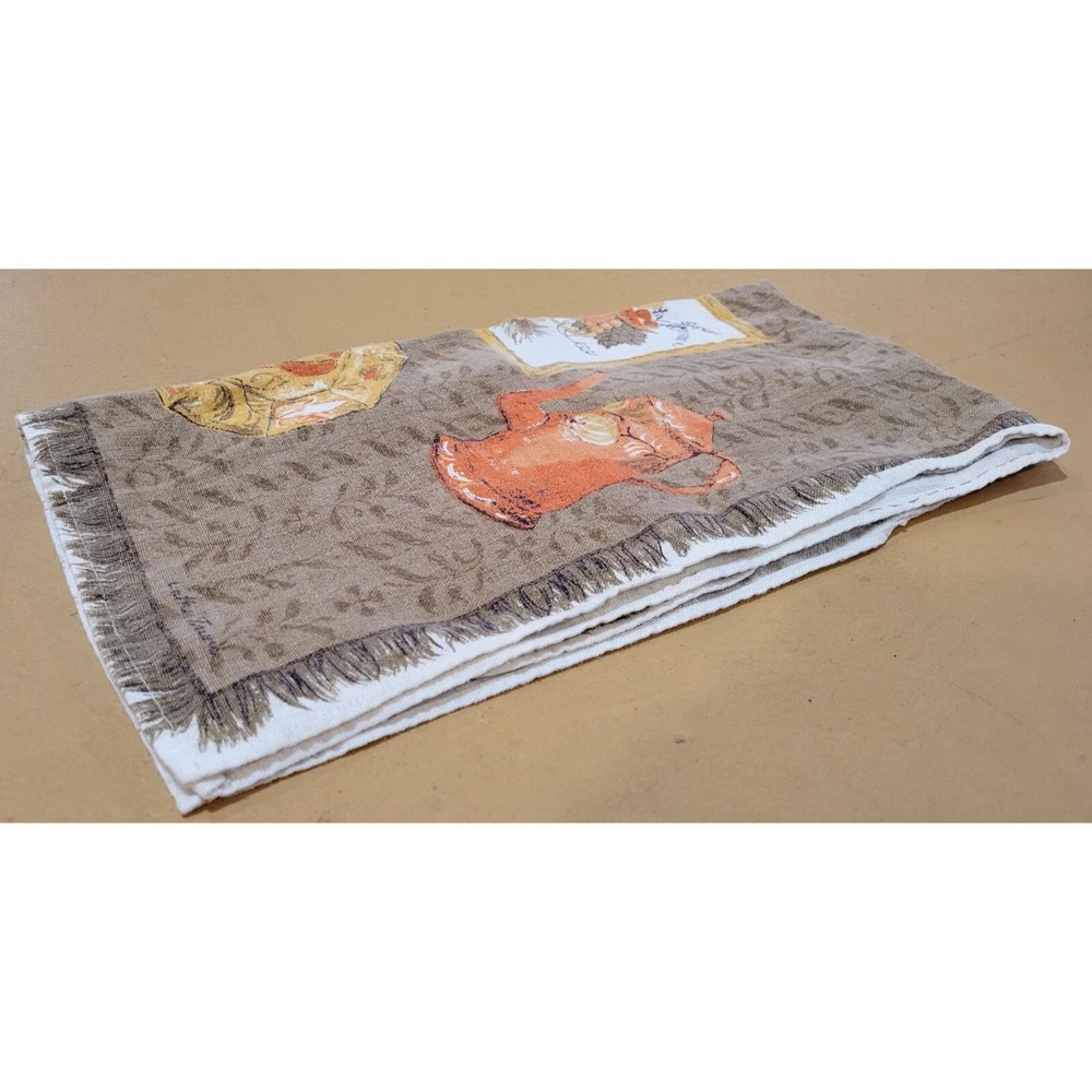 This is a towel that would be great to use anywhere in your house. The designs on the towel are made with beautiful fall colors, mainly orange and brown, making it perfect for using during the autumn season. There is a fringe pattern printed around the edge of the towel. The images depicted on it include a painting/picture of a basket of fall colored and themed fruits and vegetables, a candle on a candle stand, a tea pot, and a yellow shape with fall leaves on it. The background behind all of these wonderful autumn-themed images is a wonderful lighter brown color, giving the whole towel a feeling that makes you ready for the fall season. 27 1/4" x 15" I believe the material content is cotton / linen. Colorful kitchens are making a comeback and these pieces are a sure way to make yours a stand out.