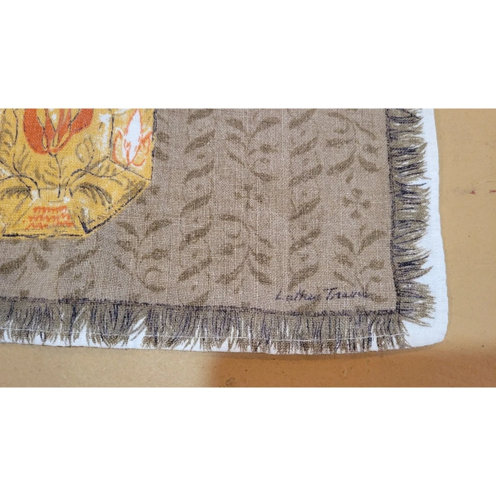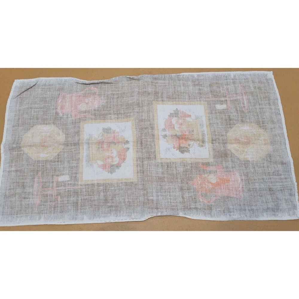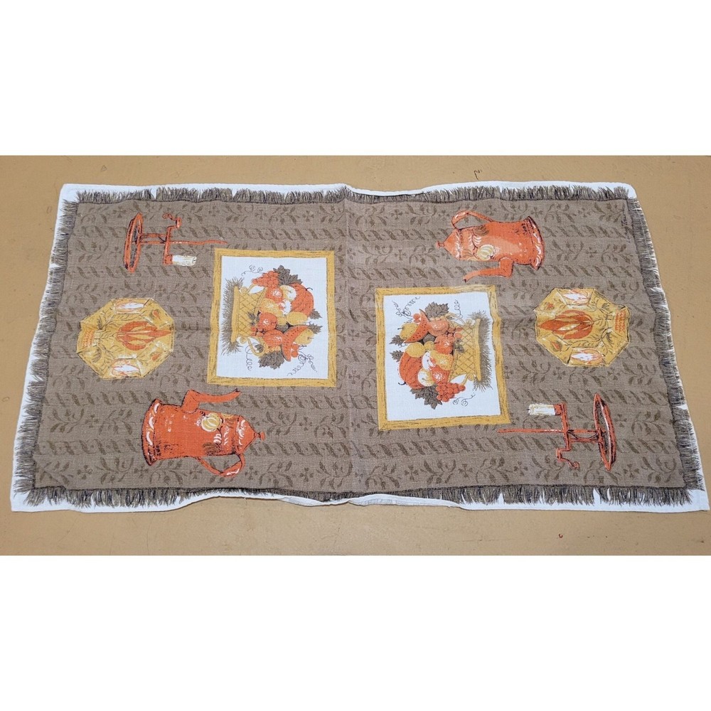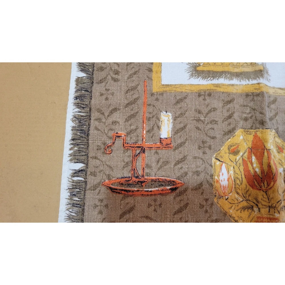 This is a towel that would be great to use anywhere in your house. The designs on the towel are made with beautiful fall colors, mainly orange and brown, making it perfect for using during the autumn season. There is a fringe pattern printed around the edge of the towel. The images depicted on it include a painting/picture of a basket of fall colored and themed fruits and vegetables, a candle on a candle stand, a tea pot, and a yellow shape with fall leaves on it. The background behind all of these wonderful autumn-themed images is a wonderful lighter brown color, giving the whole towel a feeling that makes you ready for the fall season. 27 1/4" x 15" I believe the material content is cotton / linen. Colorful kitchens are making a comeback and these pieces are a sure way to make yours a stand out.