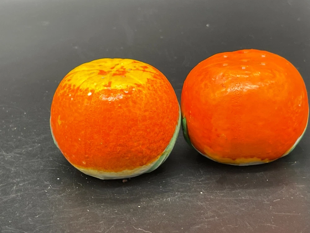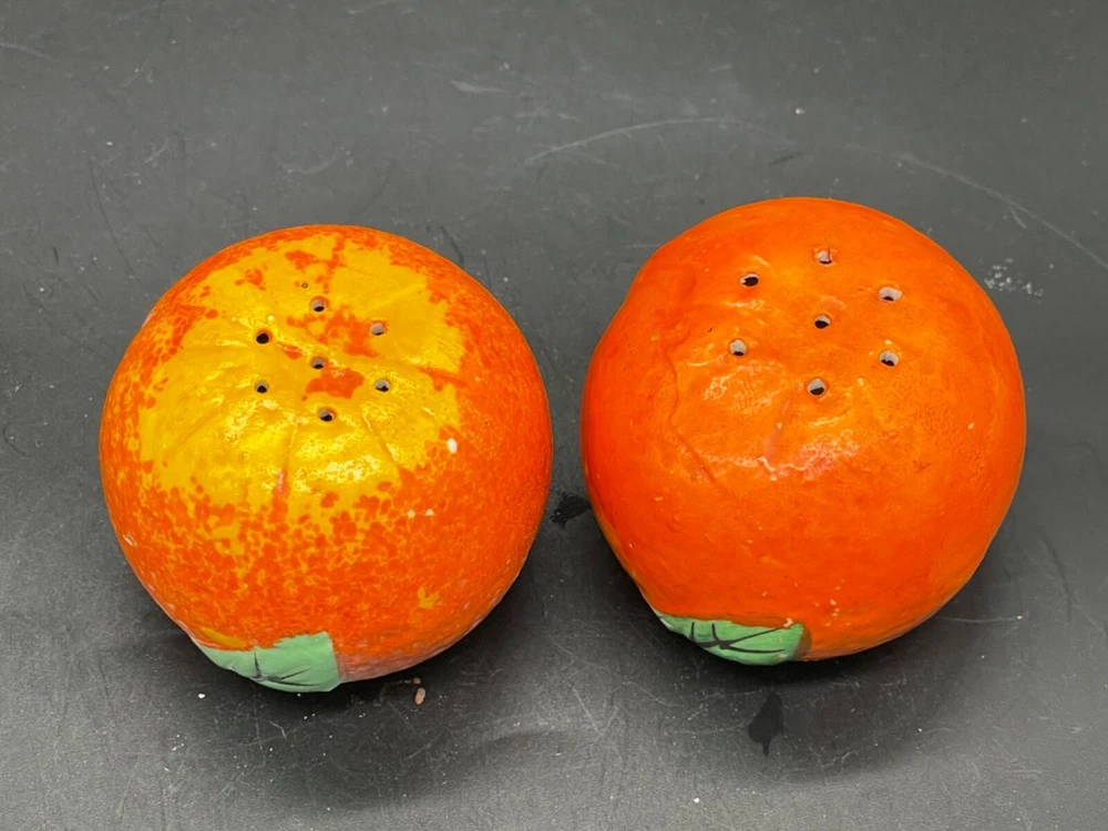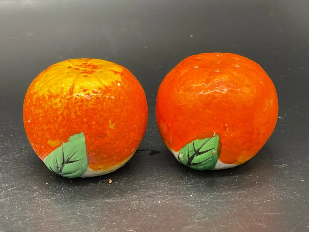 Mid century. Ceramic , orange salt/ pepper shakers Measures 2” x height 1 5/8” / wear on the paint on top of one orange . Both have corks Japan No cracks or chips Box85