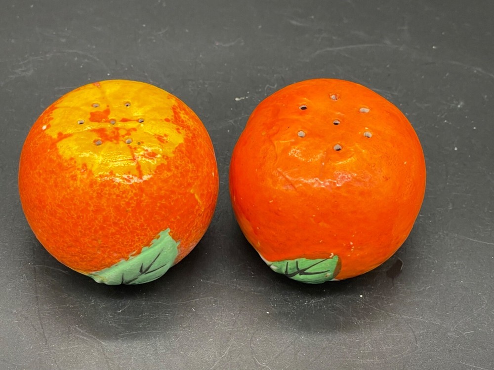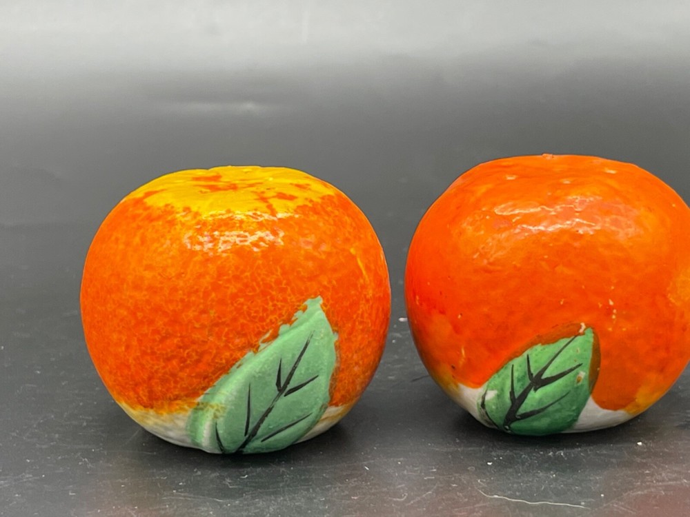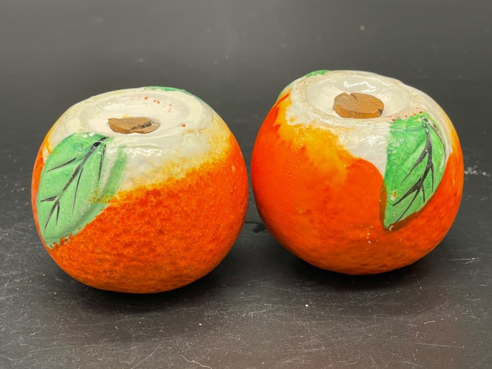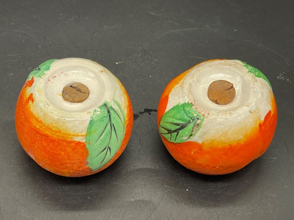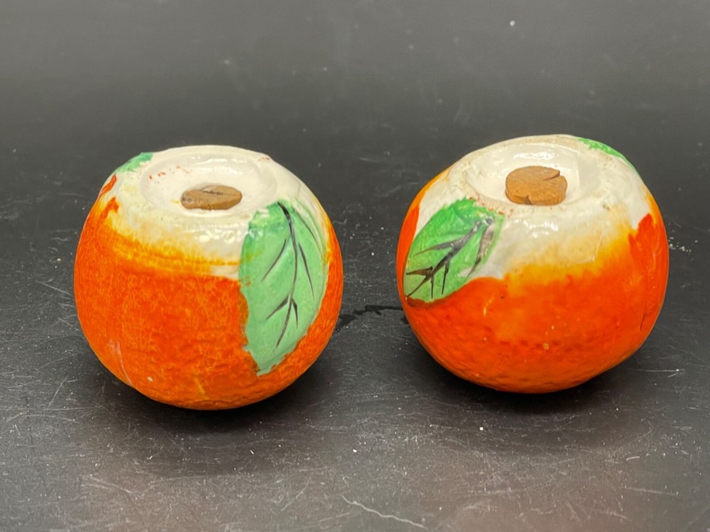 Mid century. Ceramic , orange salt/ pepper shakers Measures 2” x height 1 5/8” / wear on the paint on top of one orange . Both have corks Japan No cracks or chips Box85...