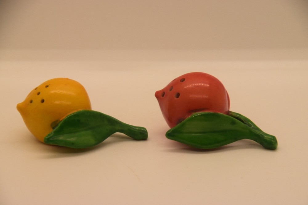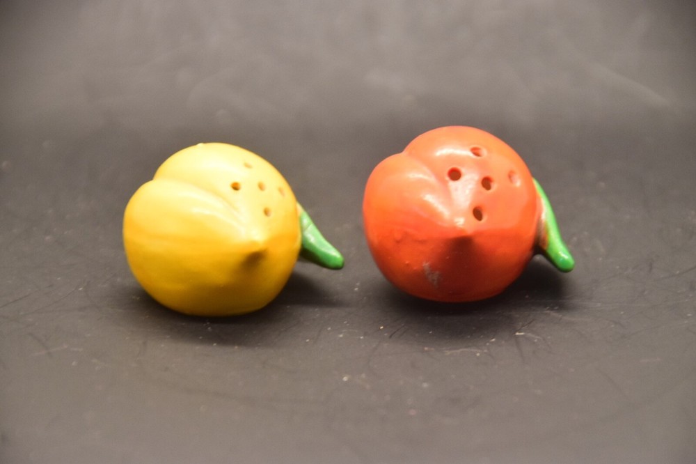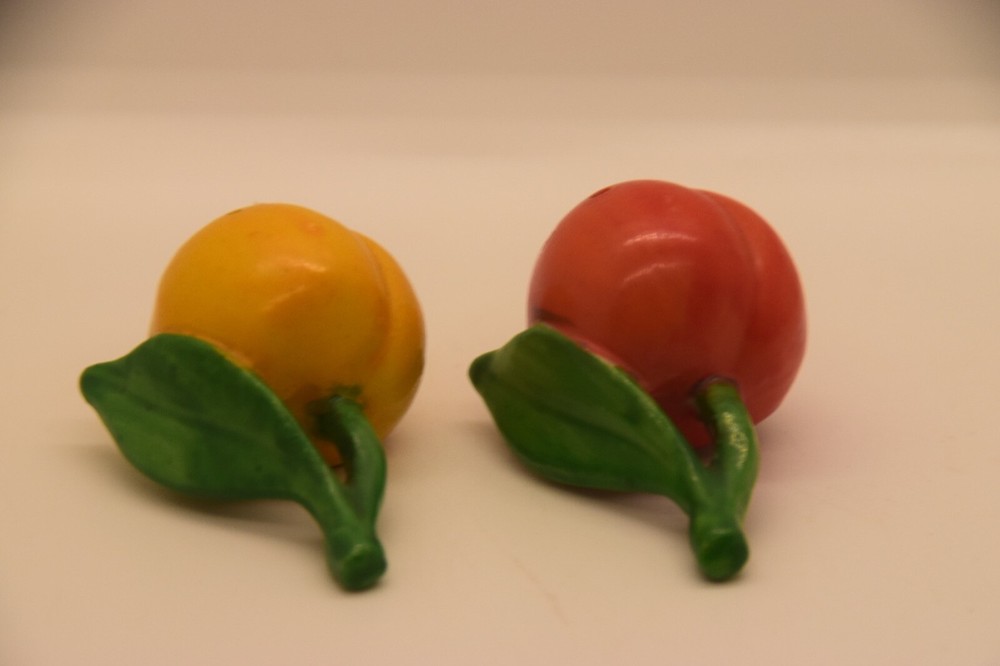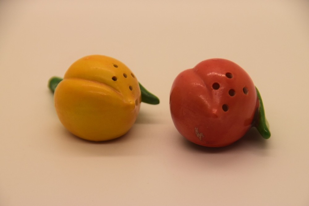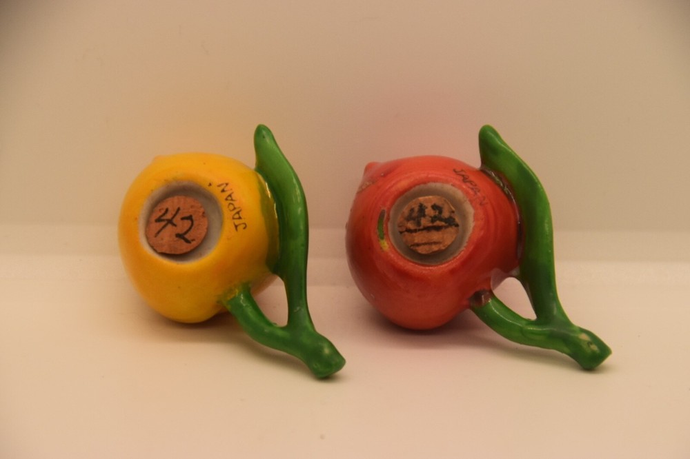 Mid century, orange, yellow, salt and pepper shakers Made in Japan, hand painted Measures 2 3/4” from stem to berry No cracks, chips Box 29...