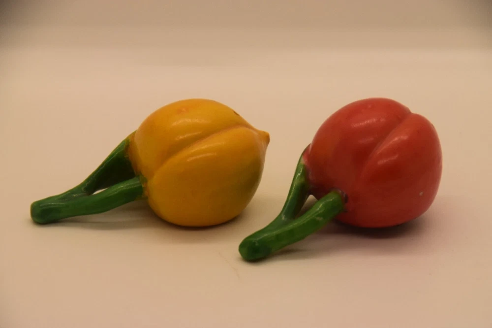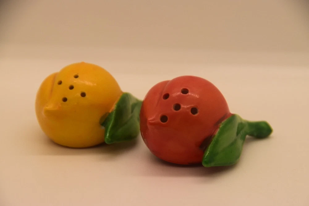 Mid century, orange, yellow, salt and pepper shakers Made in Japan, hand painted Measures 2 3/4” from stem to berry No cracks, chips Box 29