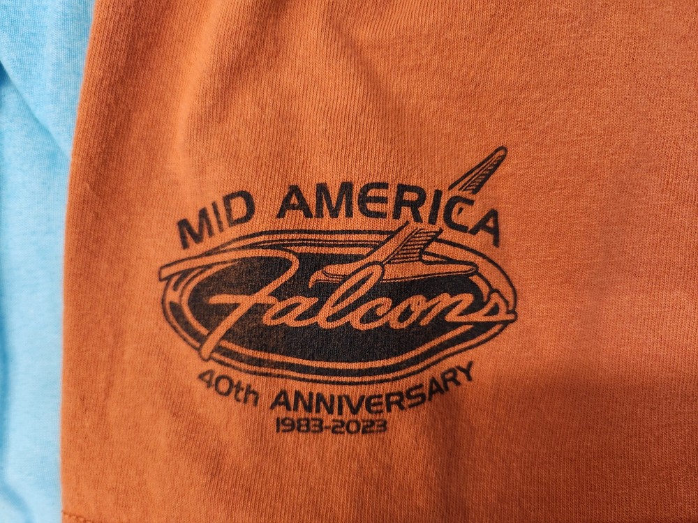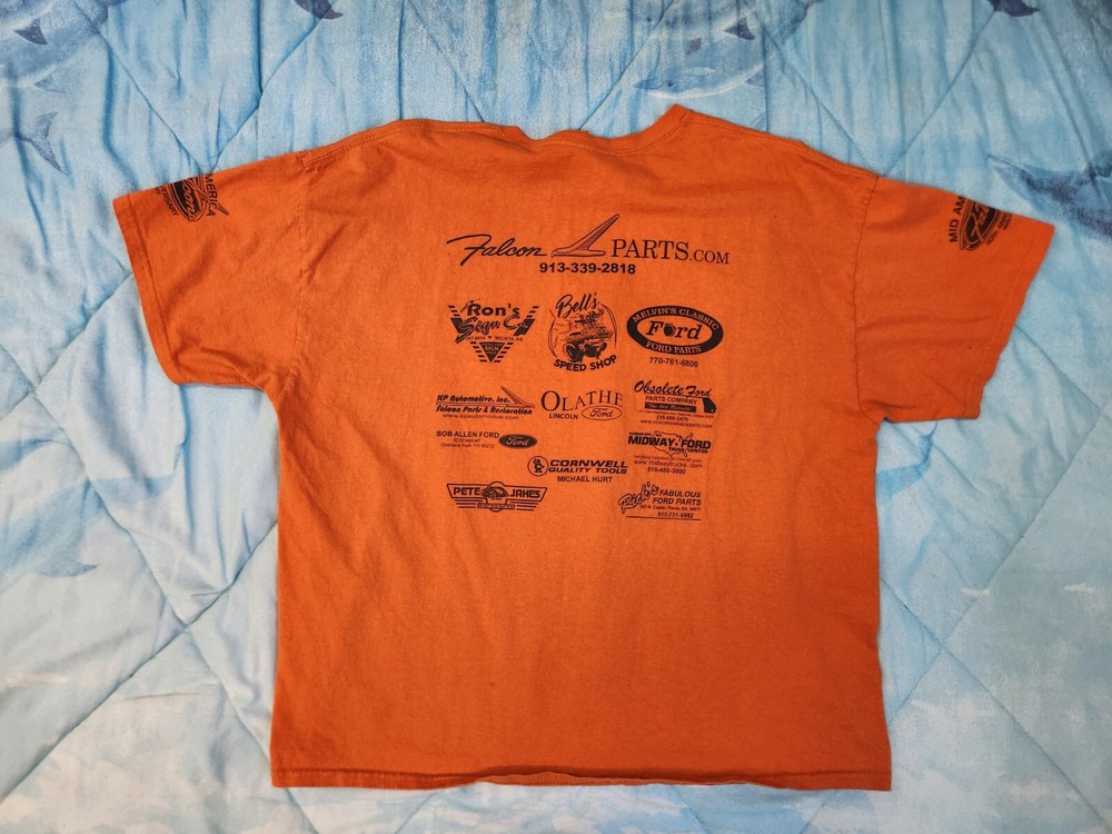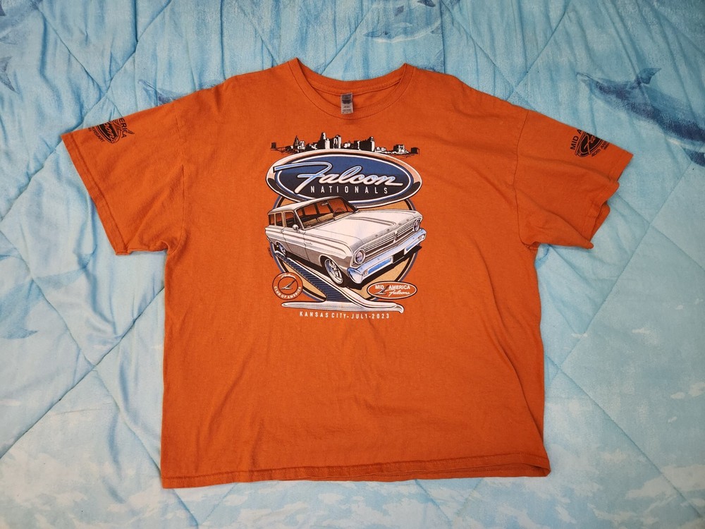 This t-shirt is a must-have for Ford fans! With its eye-catching orange color and Mid-America Ford Falcon Nationals 40th anniversary design, it's perfect for showing off your love for the brand. The shirt is a size 2X and made for men, with a regular fit that ensures comfort. The design features a city theme, making it suitable for everyday wear or special occasions. Whether you're a collector or just a fan, this t-shirt is a great addition to your wardrobe. FAST/FREE SHIPPING!