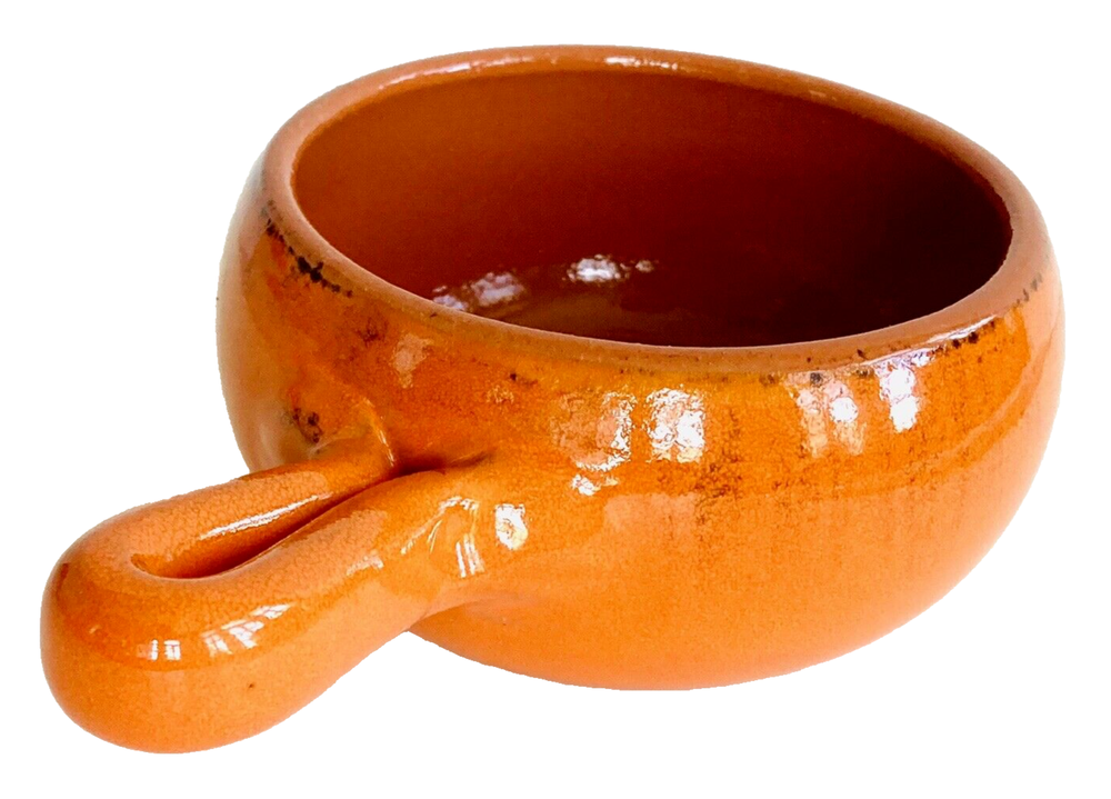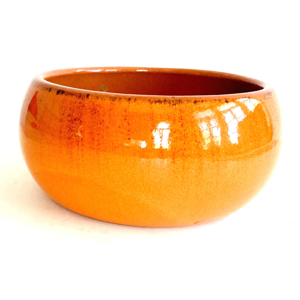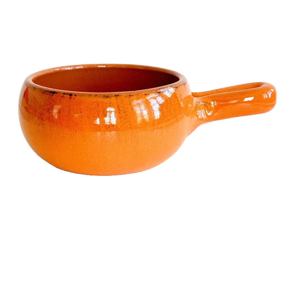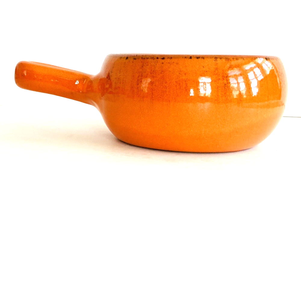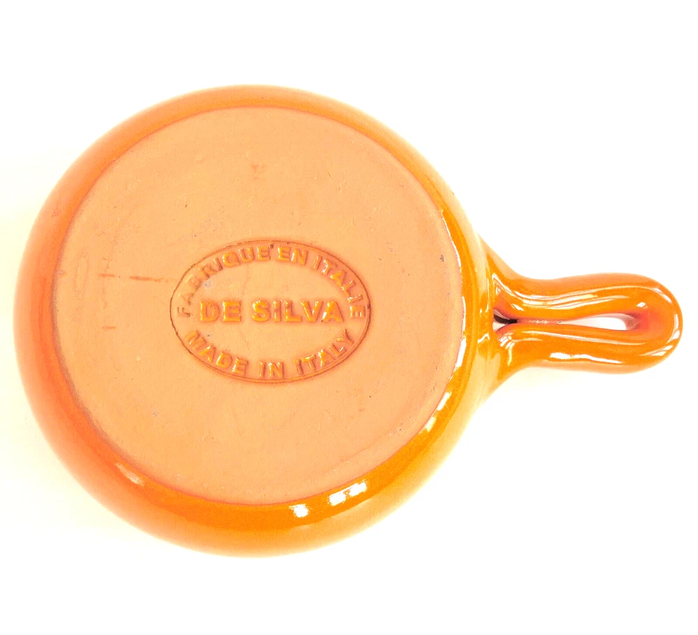 De Silva Italian Ceramic Handled Bowl Handcrafted Ceramic with Orange Glaze Mid-Century Modern (1960s-1970s) Made in Italy This charming Italian ceramic bowl by De Silva exemplifies the rich craftsmanship of mid-century Italian pottery. Known for their high-quality ceramics, De Silva produced a wide range of handcrafted pieces characterized by vibrant glazes and unique forms. This piece features a warm orange glaze, capturing the essence of rustic European kitchenware while maintaining a sleek and modern silhouette. The bowl's compact size and rounded shape make it an ideal piece for both decorative and practical use. The distinctive looped handle not only adds a touch of elegance but also enhances functionality. Perfect for serving dips, sauces, or as a charming display piece, this bowl adds a touch of mid-century Italian flair to any setting. The base is stamped "De Silva, Fabrique en Italie, Made in Italy," confirming its origin and authenticity. De Silva ceramics are known for their quality and enduring appeal, and this piece is no exception. Its vibrant color and classic form make it an attractive addition for collectors and enthusiasts of mid-century modern decor. At the Disco Freedom Gallery, 818 Hyde St., San Francisco.