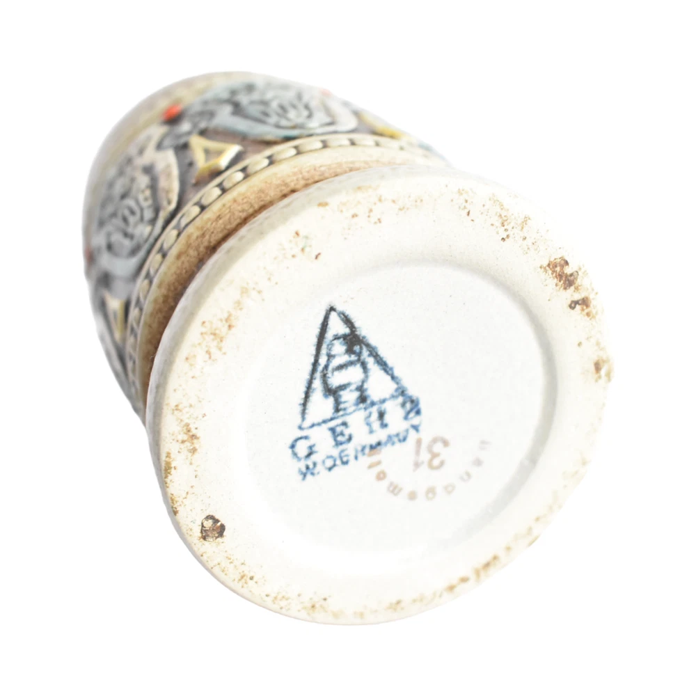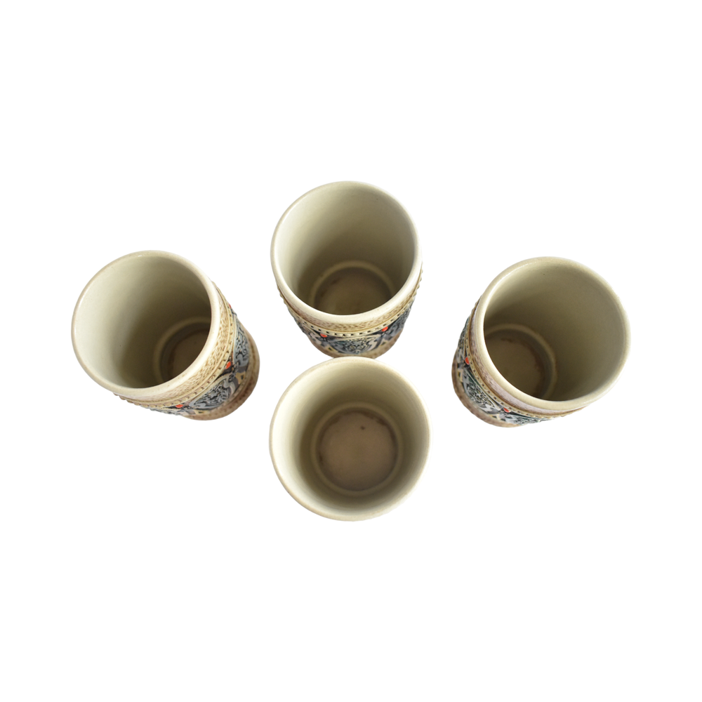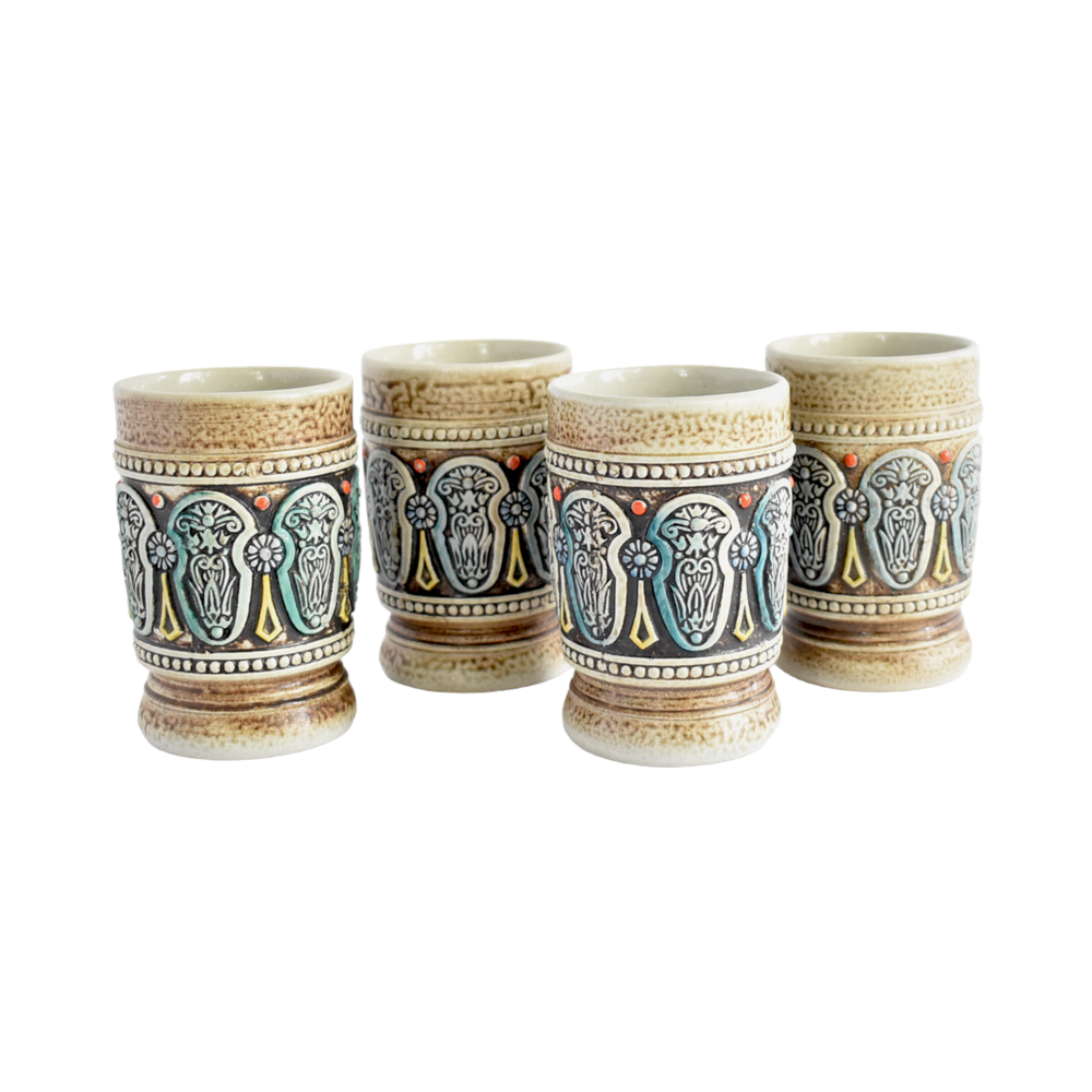 A set of 4 West German ceramic tumblers, mid-century, with intricate embossed designs of blue and orange, on a mottled brown background. Made in West Germany by Gerz; marked on the base. Each 3" x 4.25".