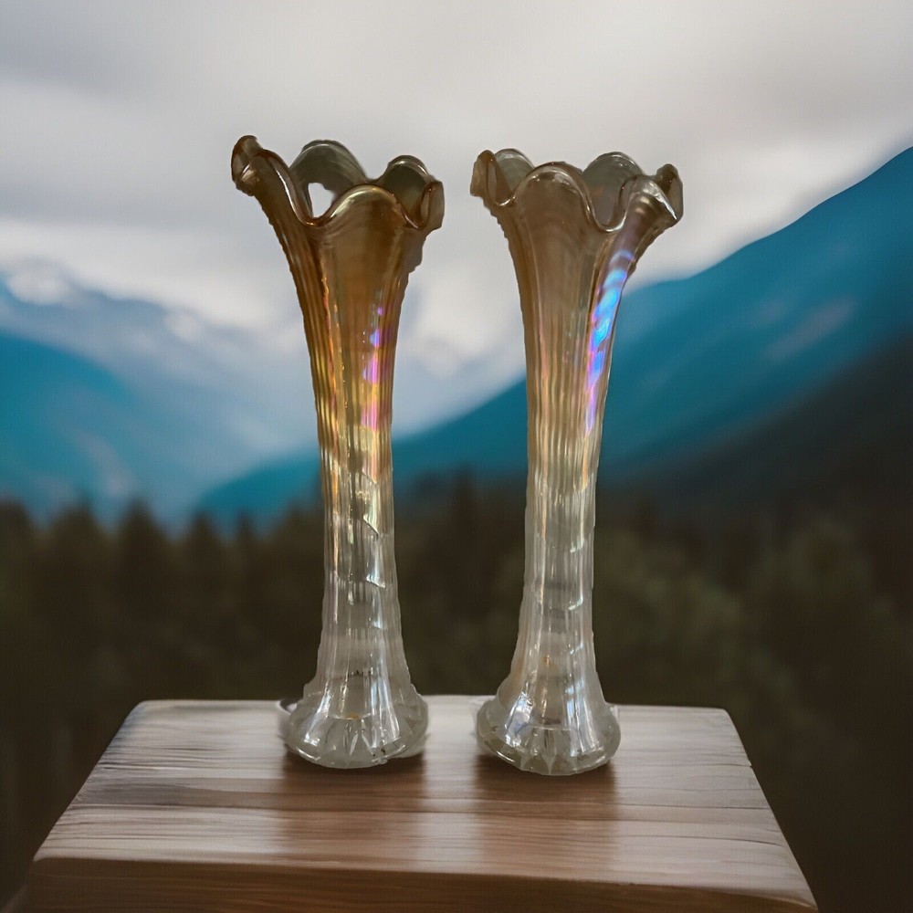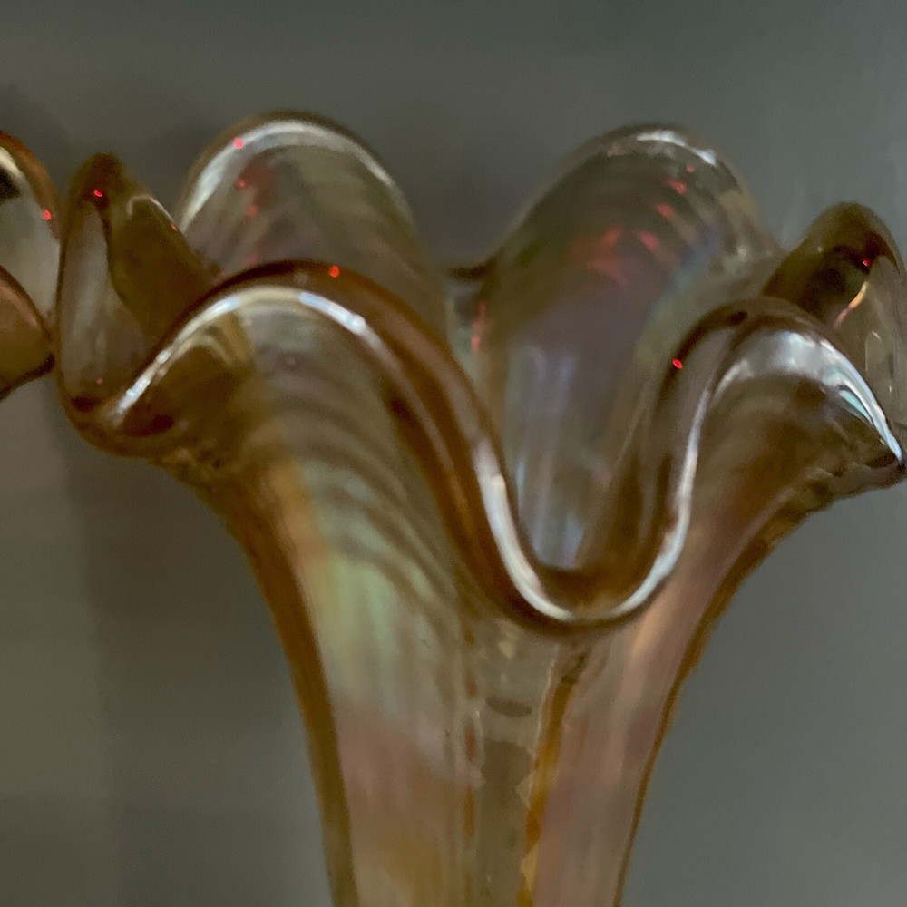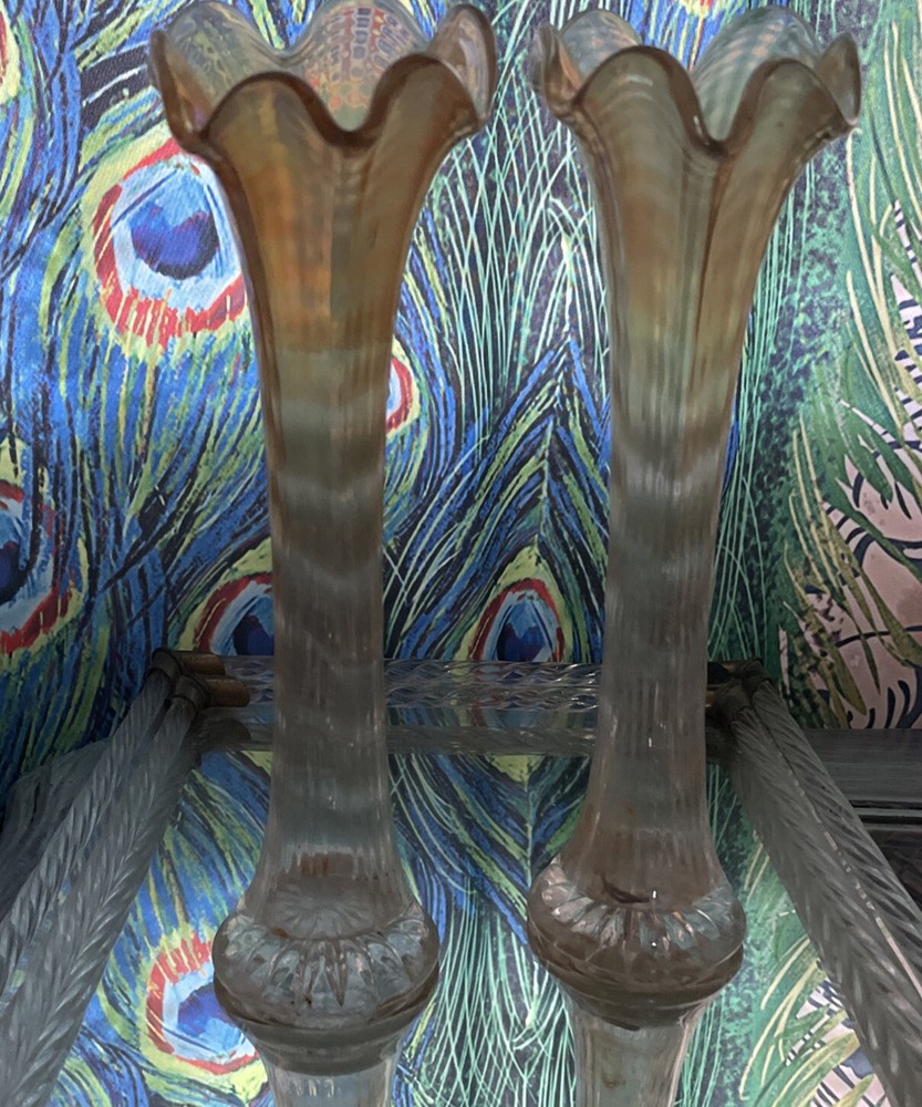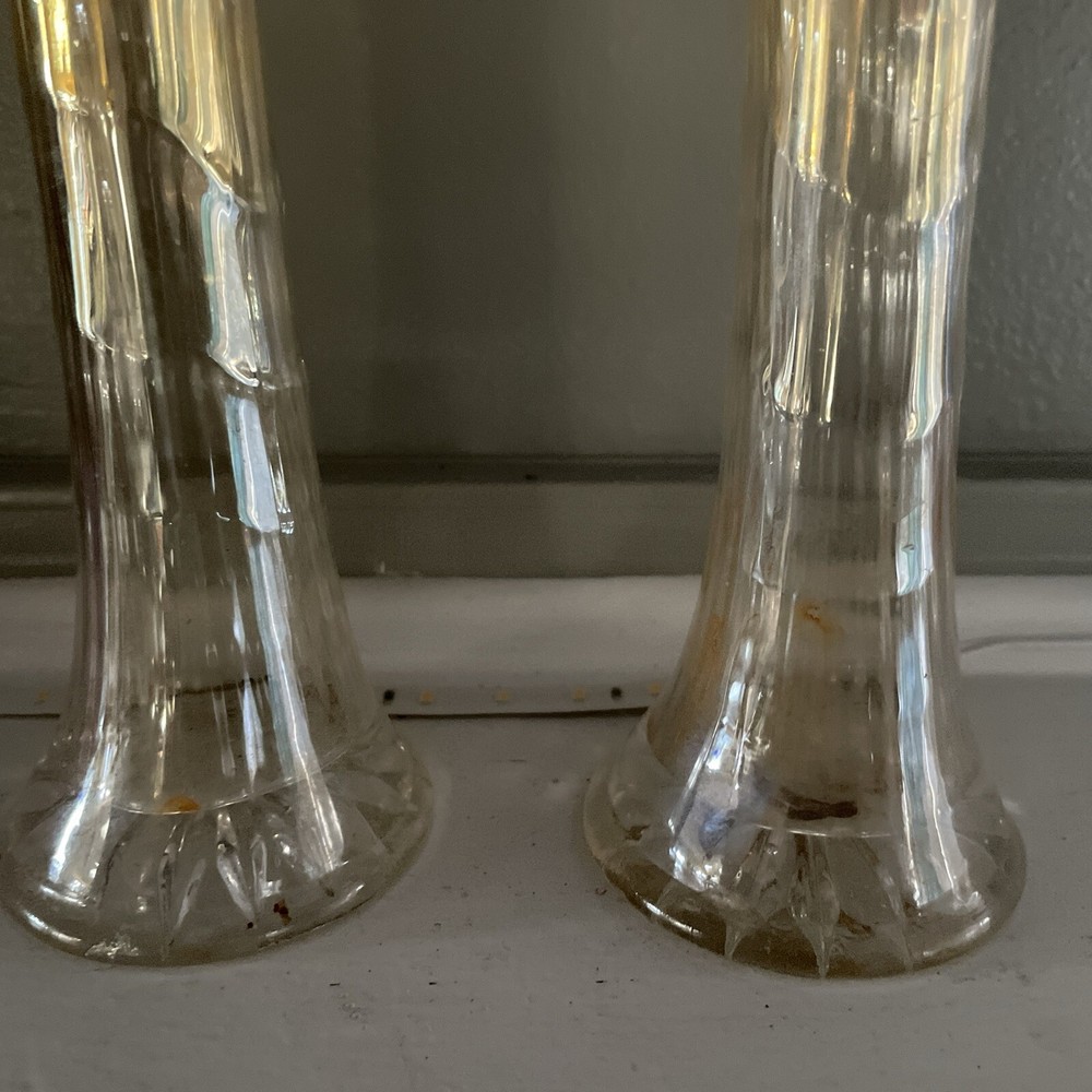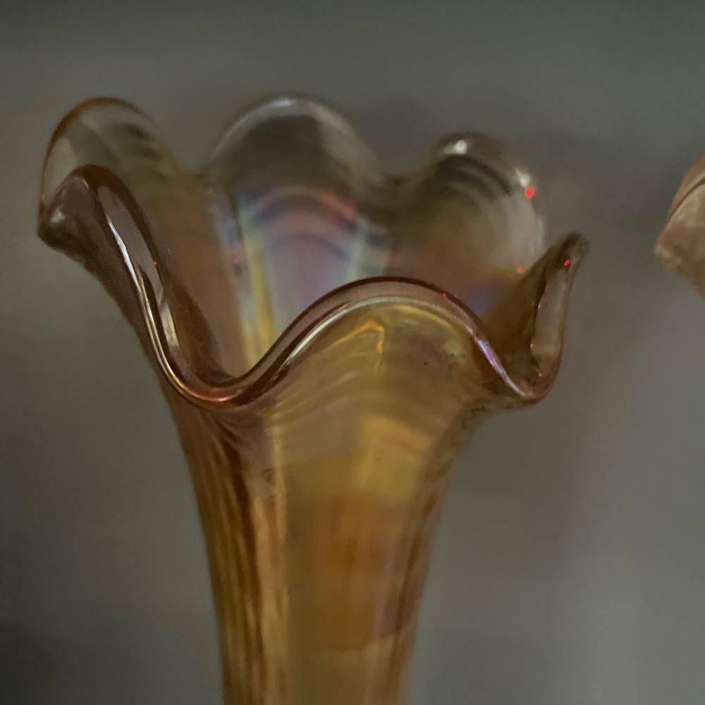 This set is in beautiful vintage condition. 9 inches tall Beautiful gold tone, orange, marigold iridescent finish that is changing depending on the light Photos cannot capture the the splendid colors As with all vintages items this is an aged piece and comes with years of handling This pair is in excellent vintage condition they will be packaged and wrapped with care and double boxed for shipping safety