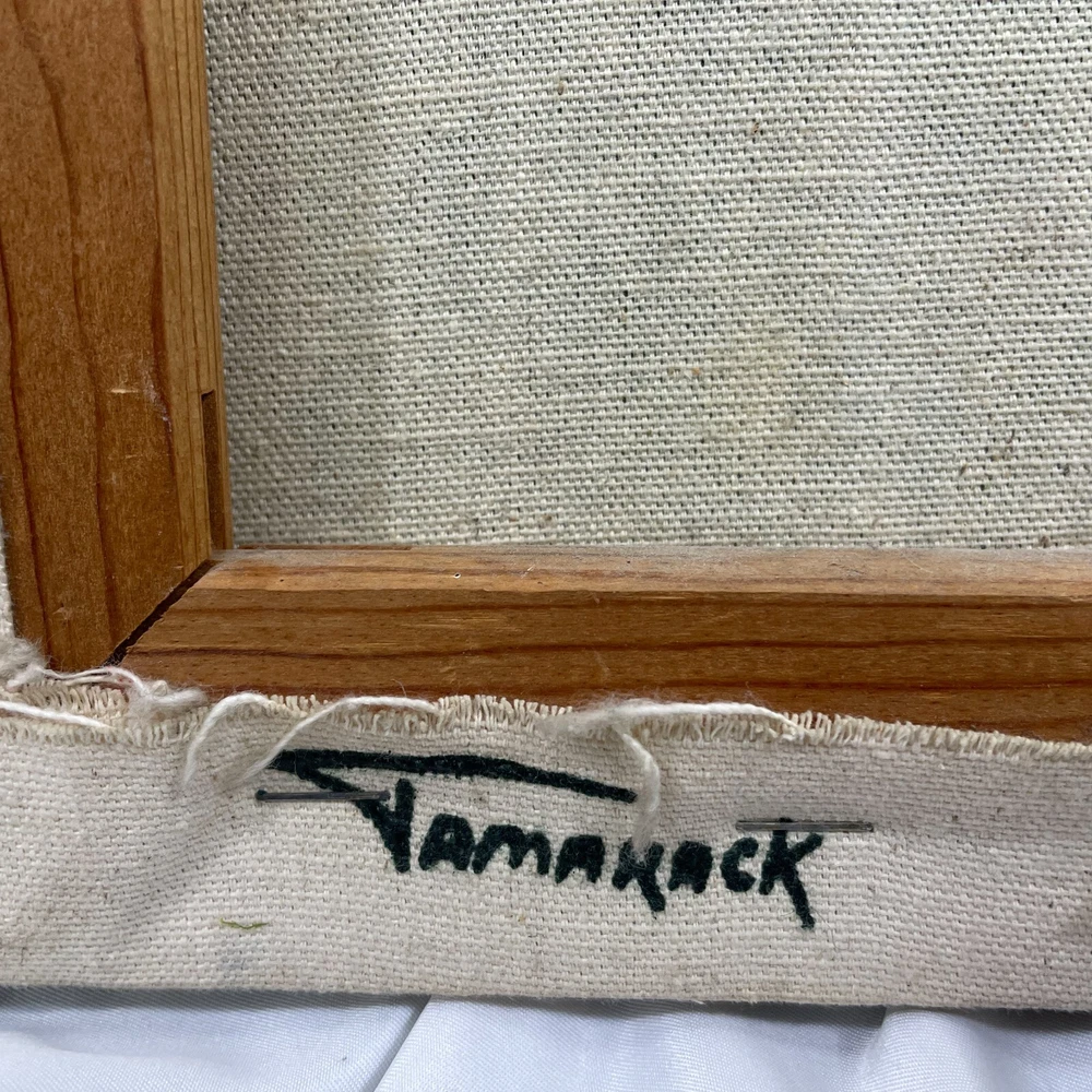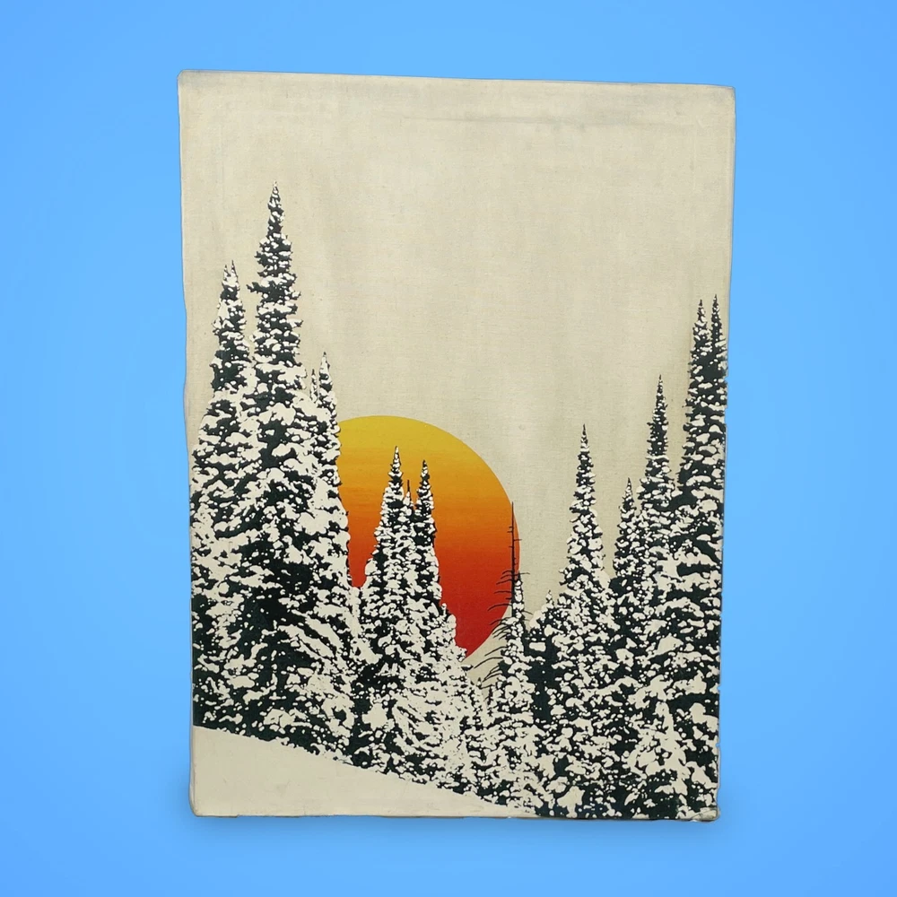 *Very cool vintage mid century fabric painting signed Tamarack *Features a Red/Yellow/Orange gradient Sun or Moon and snow covered evergreen trees *Measures approx. 30" high and 22" wide *Could use a careful cleaning, canvas shows some signs of dirt and dust but is undamaged
