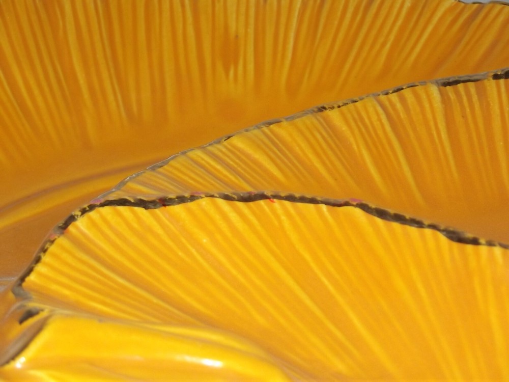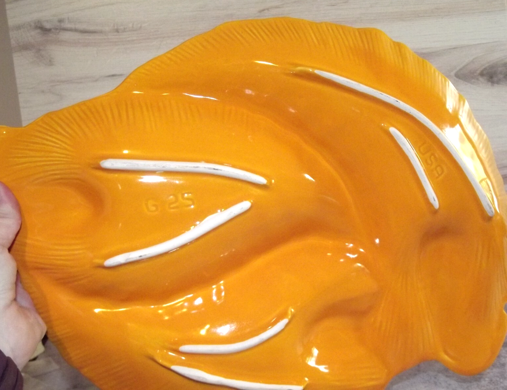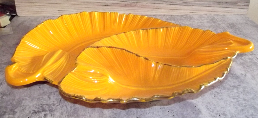 Mid-Century Modern 3 Sectioned Serving Dish Mid-century USA pottery sectioned platter in the shape of 3 brilliant pumpkin orange leaves with gold trimmed edges. Marked on the bottom USA G 25 16” X 12” There are a couple tiny chips in the surface on the gold edge of one of the leaves, and has been touched up with orange paint, otherwise excellent condition. This is large! It will be packed safely and securely.