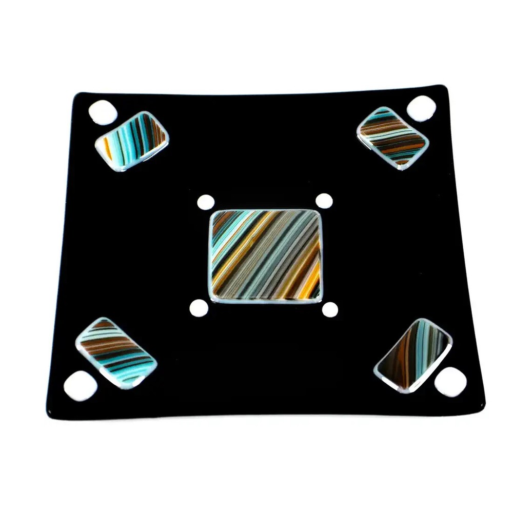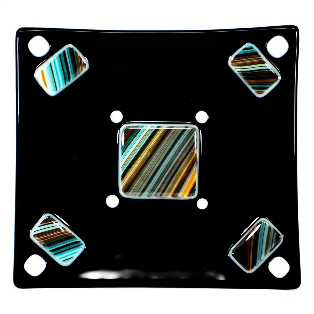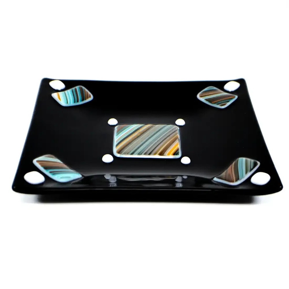 Mid-Century Modern Handmade Black Fused Art Glass On Raised Turquoise/Brown/Orange USA. Made in USA. In exceptional condition; no repairs or issues. This handmade fused art glass dish features a polished opaque black art glass with a pattern of individually raised hand cut rectangles and square with stipes of Turquoise/Brown/Orange design. Also accented with 4 white square dots and 4 small white dots. Mid-Century Modern style. On the back of the dish you can feel a slight texture from original materials used. Gently hand wash and avoid the dishwasher. Microwave use is not recommended. Measures: 5 1/2 in X 6 in. The edges all slope towards the center design to make a square looking area. Made in Arizona. This is a charming dish that could be used anywhere in your home. Perfect for serving Sushi, snacks, a Jewelry dish, or a base for a medium size flickering candle. A beautiful art glass to display with a collection and would look stylish framed on a wall or shelf. Certainly, a gift ready for any occasion or fused art glass collector. Items that I sell that are marked vintage, antique or collectible may show some signs of wear to the original boxes or original package when available. See pictures for detail. All of my items come from a smoke-free environment. I do combine shipping on multiple items. Please ask for additional pictures or more information. We invite you to add us to your Favorites as we offer for sale new items frequently. Please email me with questions.
