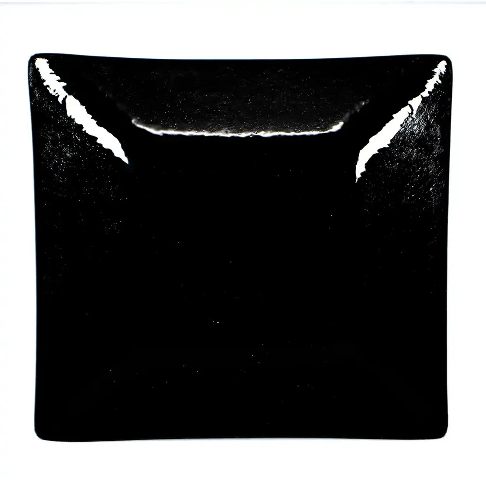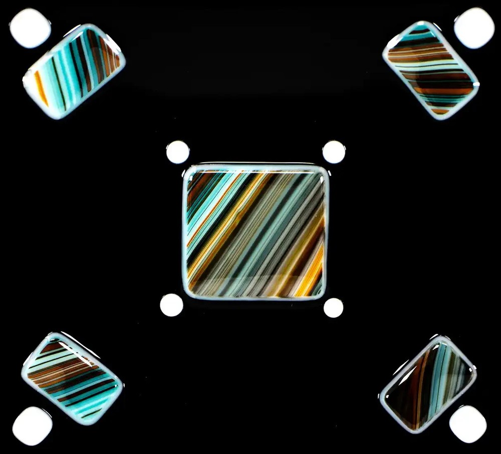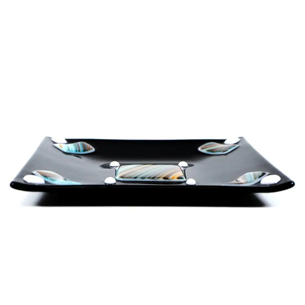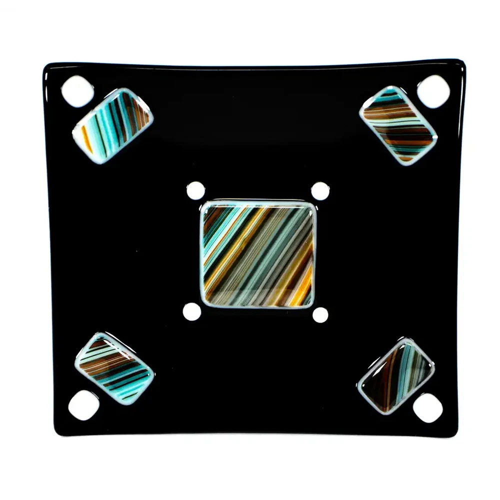 Mid-Century Modern Handmade Black Fused Art Glass On Raised Turquoise/Brown/Orange USA. Made in USA. In exceptional condition; no repairs or issues. This handmade fused art glass dish features a polished opaque black art glass with a pattern of individually raised hand cut rectangles and square with stipes of Turquoise/Brown/Orange design. Also accented with 4 white square dots and 4 small white dots. Mid-Century Modern style. On the back of the dish you can feel a slight texture from original materials used. Gently hand wash and avoid the dishwasher. Microwave use is not recommended. Measures: 5 1/2 in X 6 in. The edges all slope towards the center design to make a square looking area. Made in Arizona. This is a charming dish that could be used anywhere in your home. Perfect for serving Sushi, snacks, a Jewelry dish, or a base for a medium size flickering candle. A beautiful art glass to display with a collection and would look stylish framed on a wall or shelf. Certainly, a gift ready for any occasion or fused art glass collector. Items that I sell that are marked vintage, antique or collectible may show some signs of wear to the original boxes or original package when available. See pictures for detail. All of my items come from a smoke-free environment. I do combine shipping on multiple items. Please ask for additional pictures or more information. We invite you to add us to your Favorites as we offer for sale new items frequently. Please email me with questions.