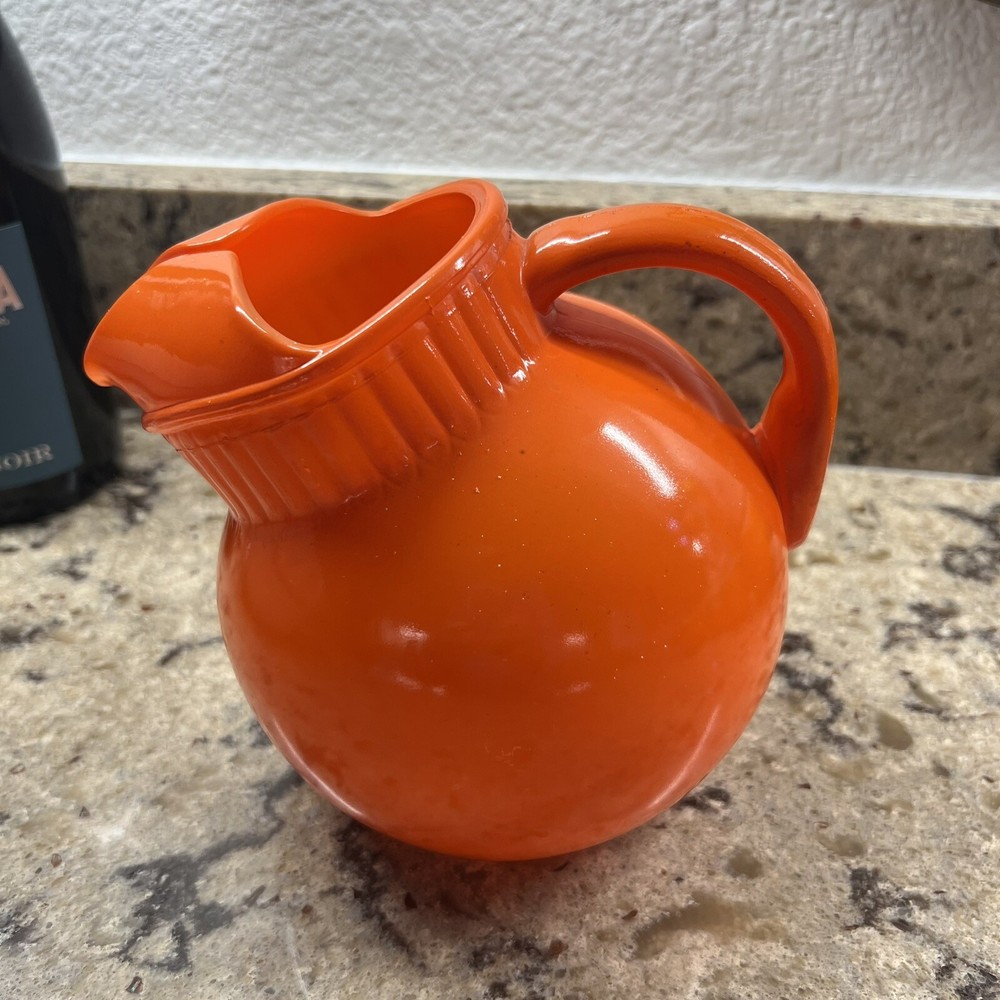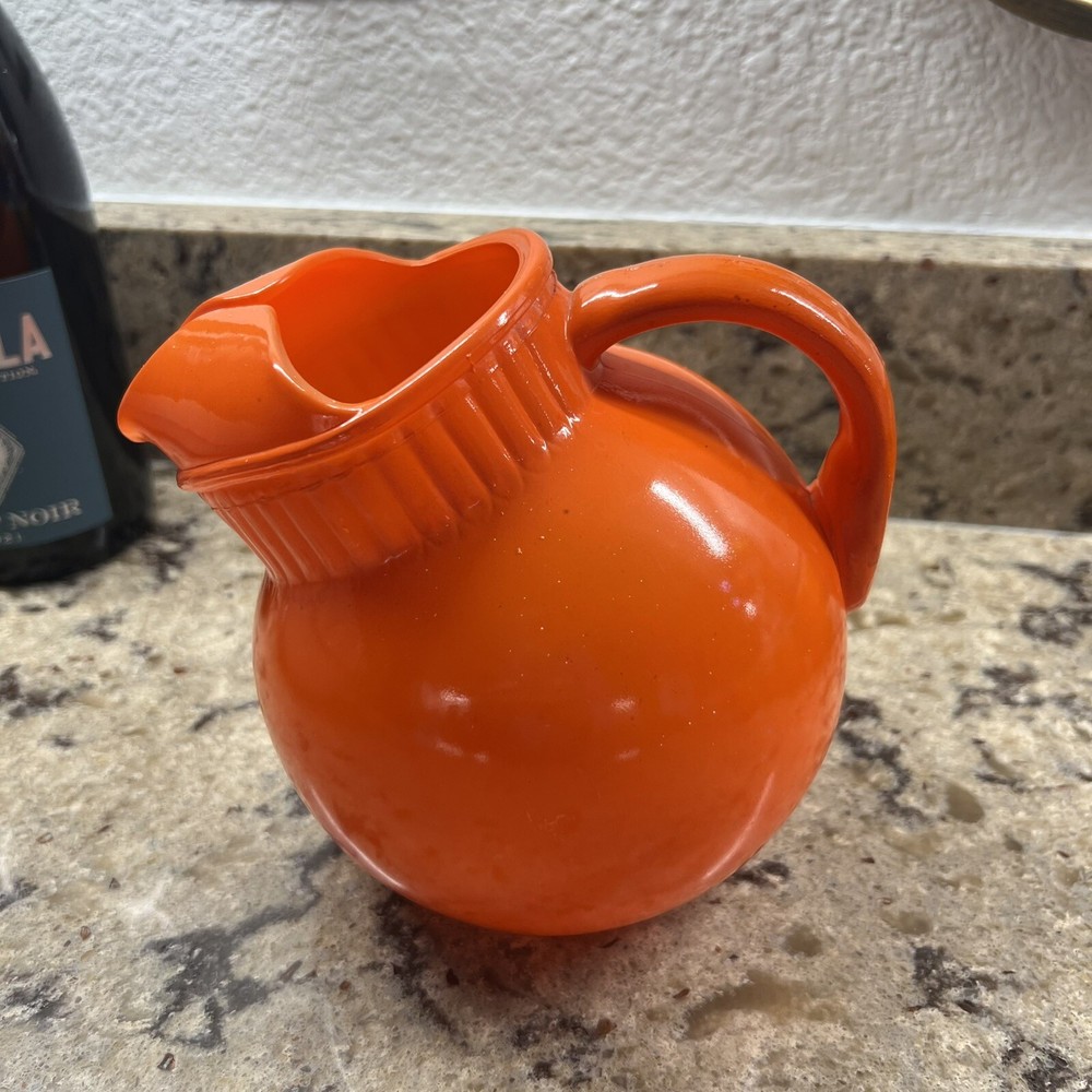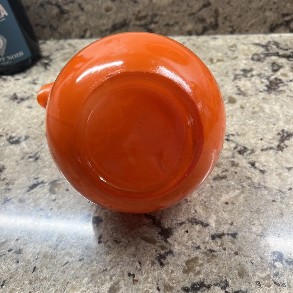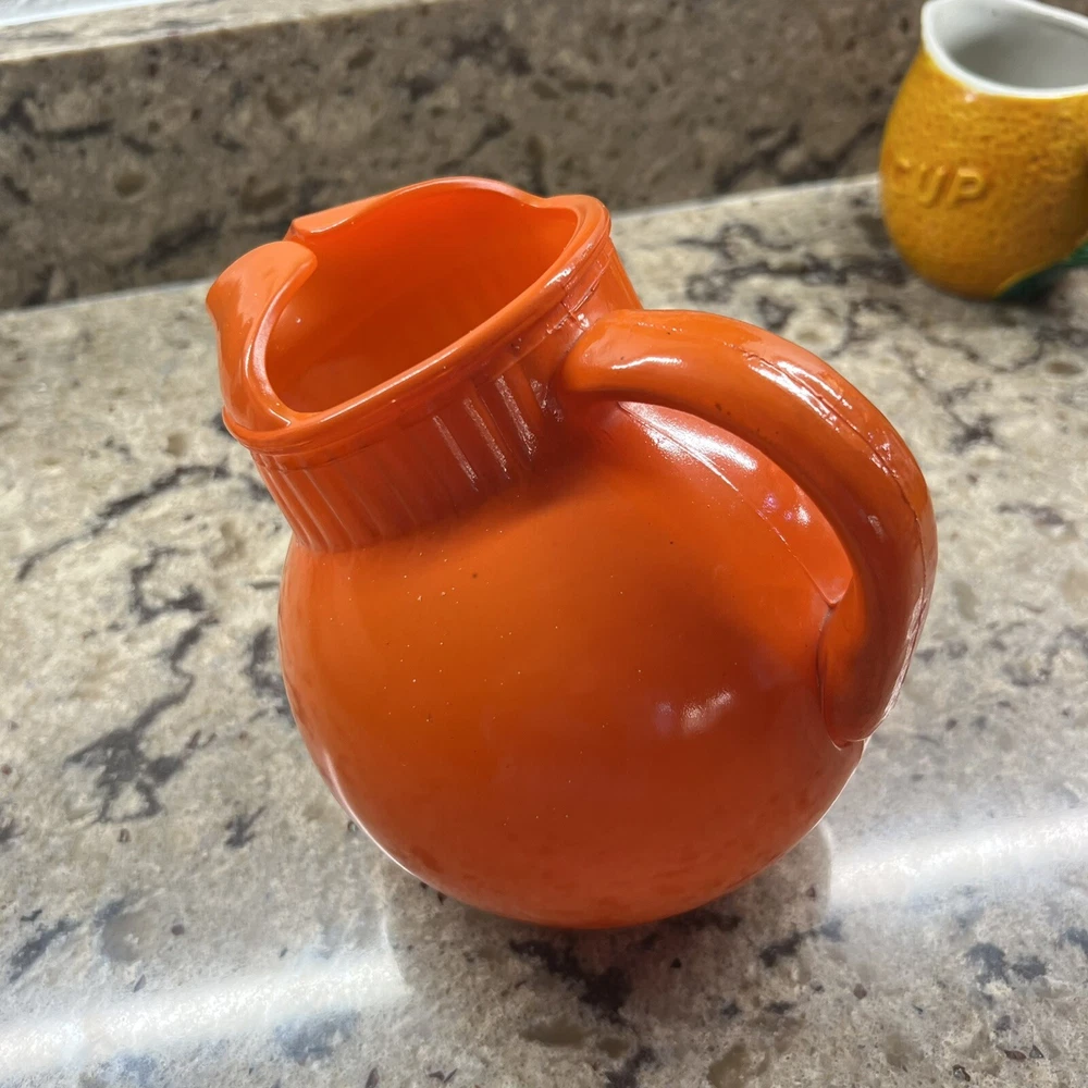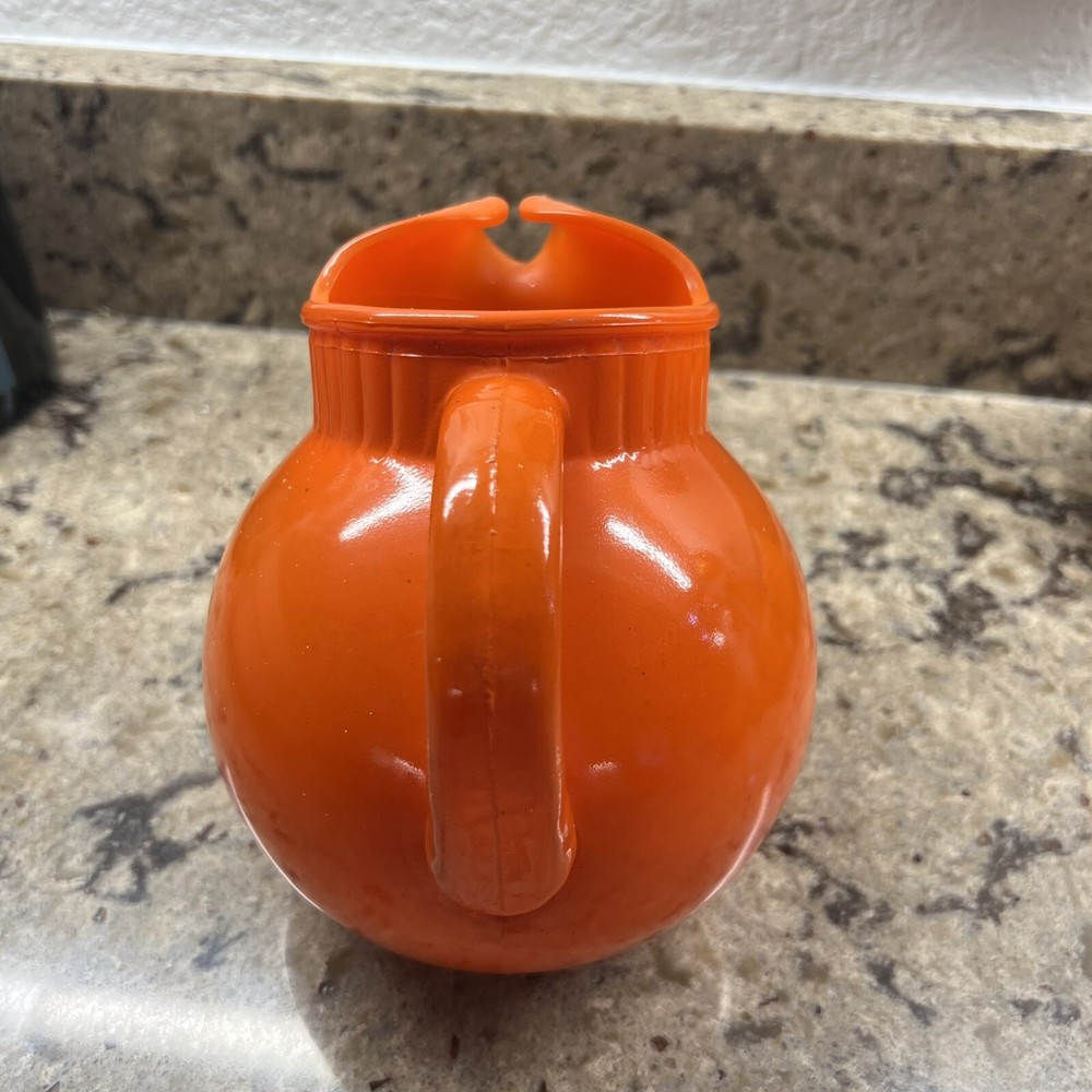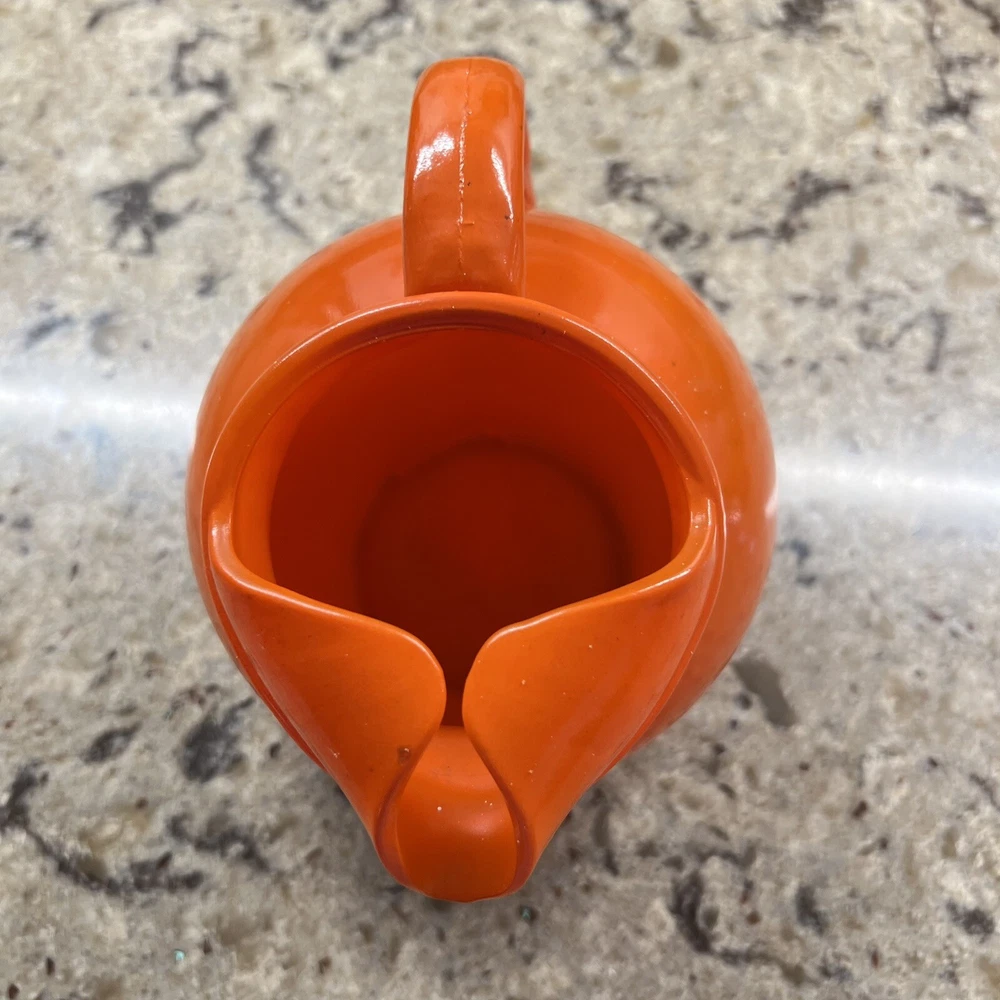 Cute vintage orange glass pitcher holds one quart (4 cup) of fluid -- or makes a great addition to Mid-Modern Century kitchen accessories collection. The pitcher stands 6 inches high and is about the same from spout to handle. The pitcher is in good vintage condition. Has some tiny scratches due to age that do not detract from the overall look Will be carefully packaged and shipped from a non-smoking, air-conditioned home.