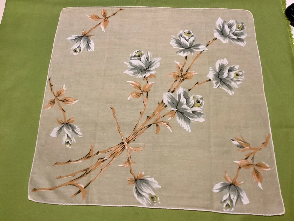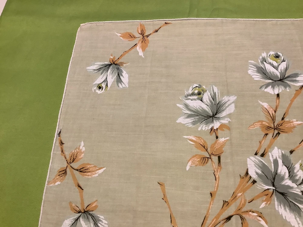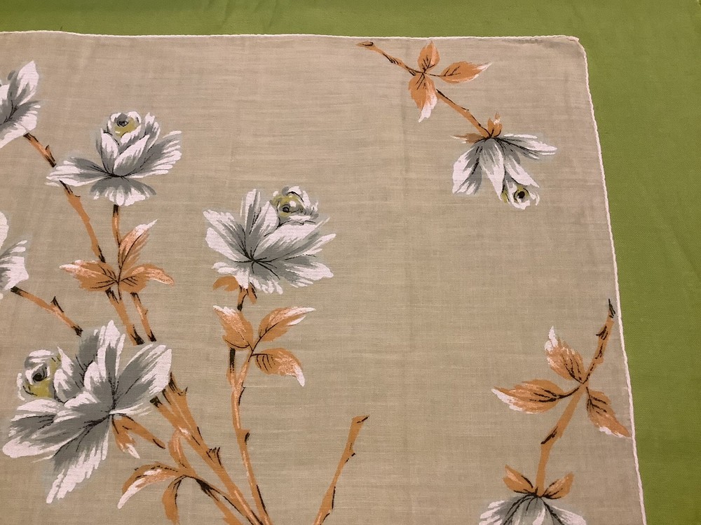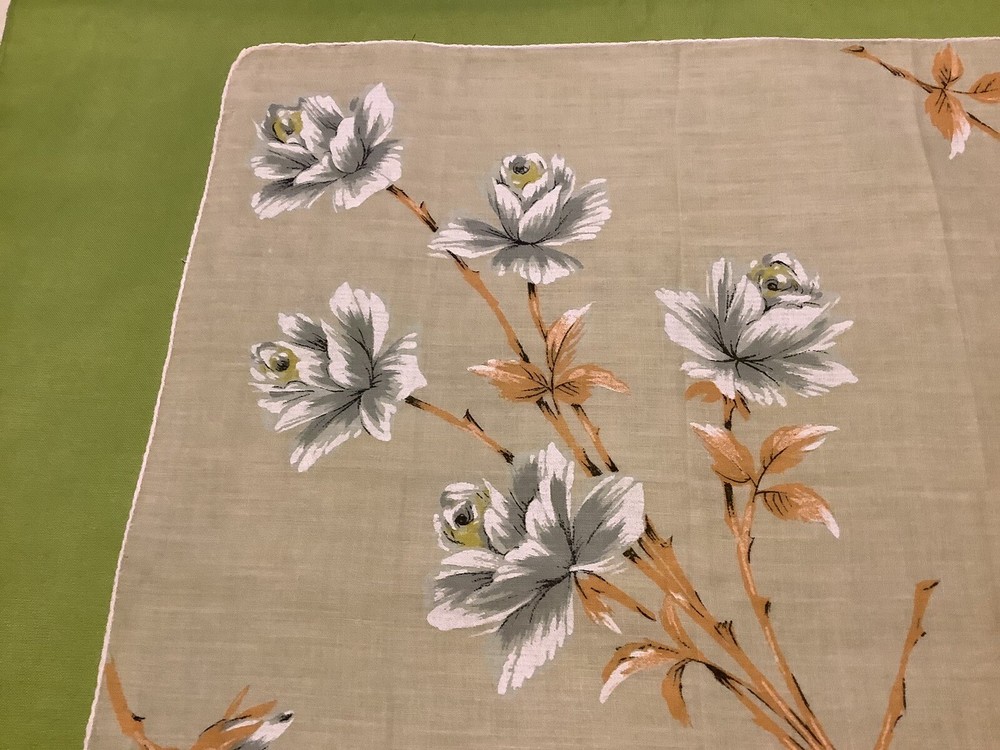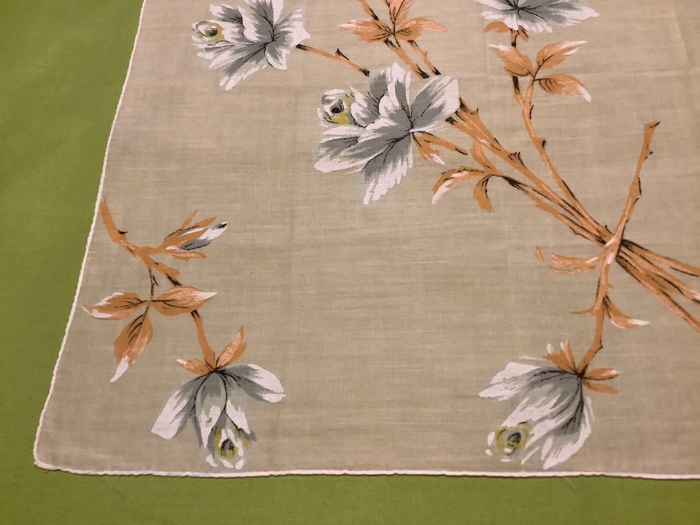 Add a touch of vintage charm to your everyday accessories with this Mid-Century Modern Peach and White Floral Hankie. Measuring 15” by 15 1/2”, this authentic piece from the 1940s boasts a delicate floral pattern, bringing a feminine and classic appeal to any outfit. Crafted from quality cotton material, the hankie showcases a vibrant multi-color palette that has endured through the years. Ideal for women who appreciate the timeless elegance of original vintage pieces, this unbranded hankie is a versatile addition to your wardrobe or collection.