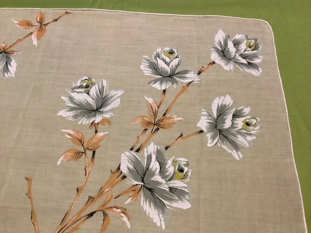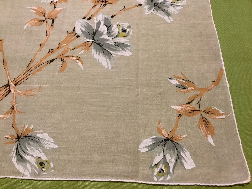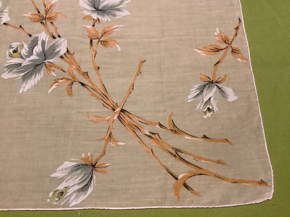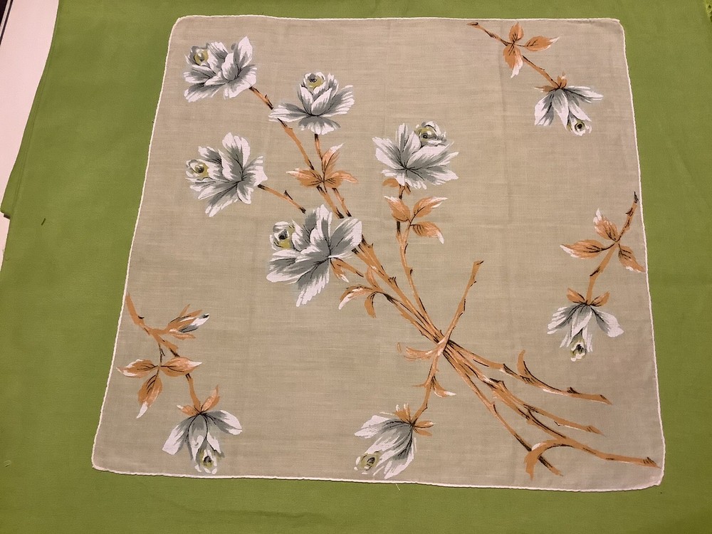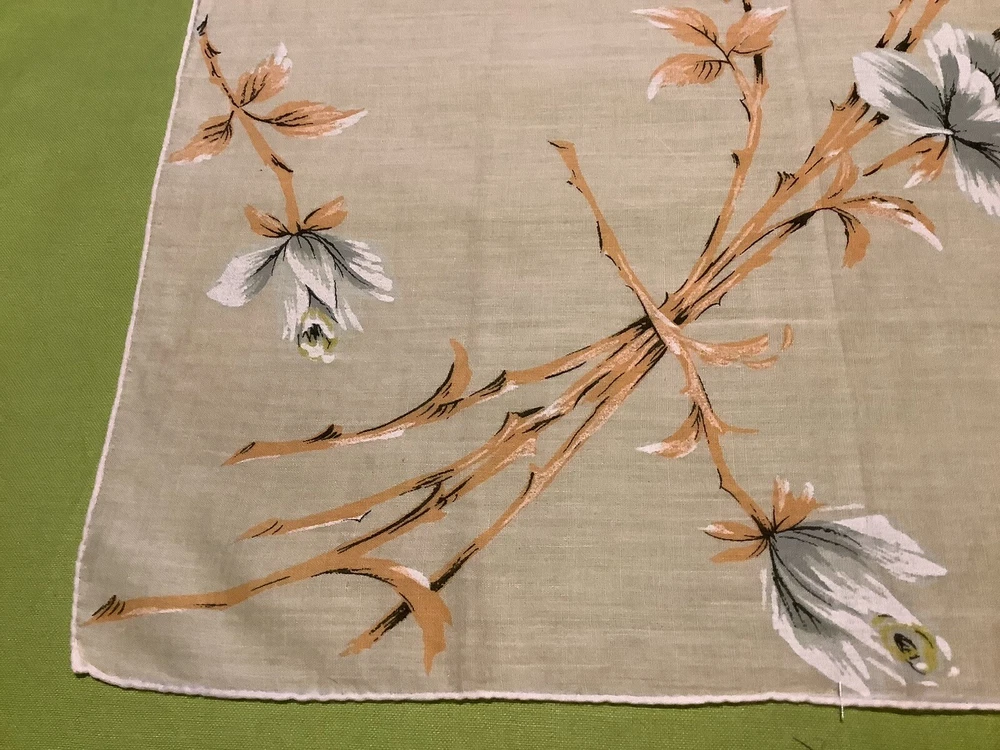 Add a touch of vintage charm to your everyday accessories with this Mid-Century Modern Peach and White Floral Hankie. Measuring 15” by 15 1/2”, this authentic piece from the 1940s boasts a delicate floral pattern, bringing a feminine and classic appeal to any outfit. Crafted from quality cotton material, the hankie showcases a vibrant multi-color palette that has endured through the years. Ideal for women who appreciate the timeless elegance of original vintage pieces, this unbranded hankie is a versatile addition to your wardrobe or collection.