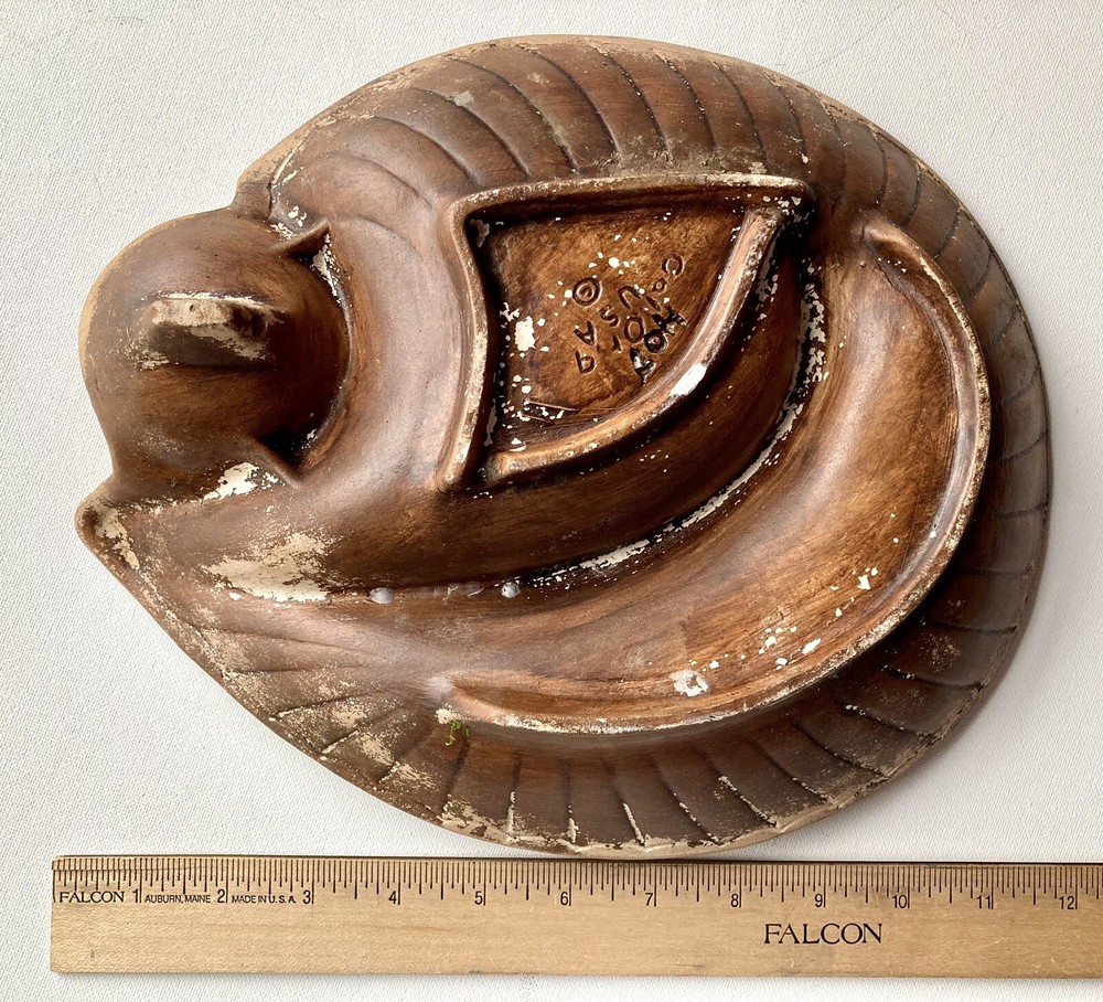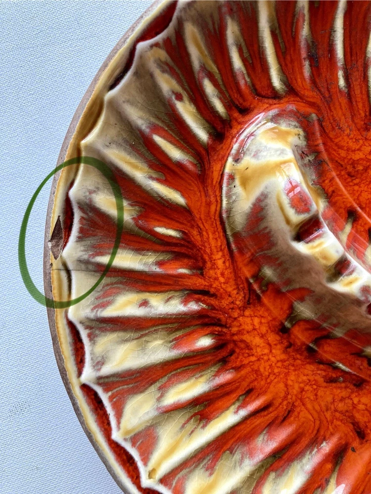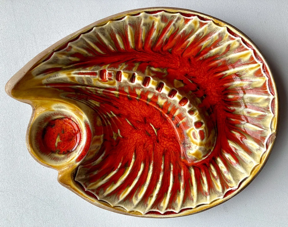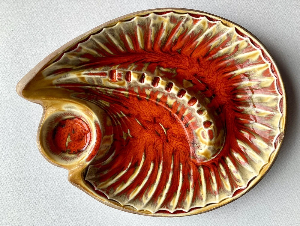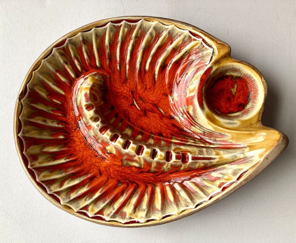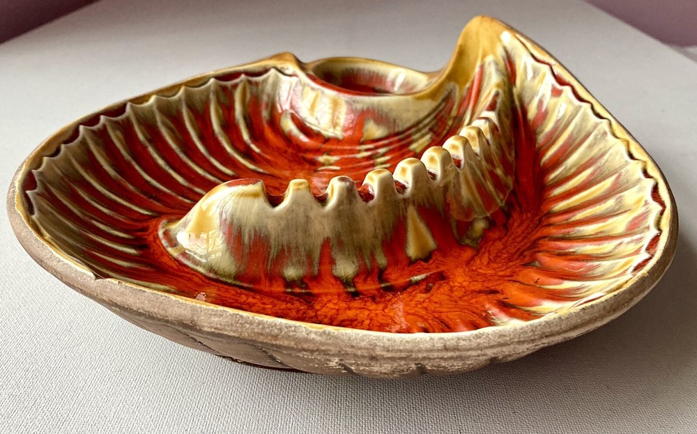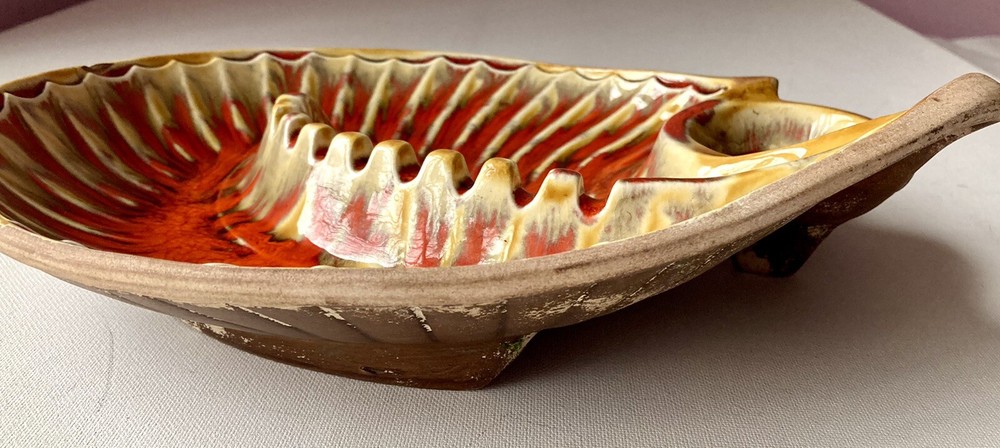This unique mid-century modern ashtray features a vibrant orange lava glaze and is handcrafted in California, USA. The large table ashtray is perfect for collectors and tobacco enthusiasts alike. 11“ x 9“ x 3“ One chip, please see marked photo, otherwise In Great condition!