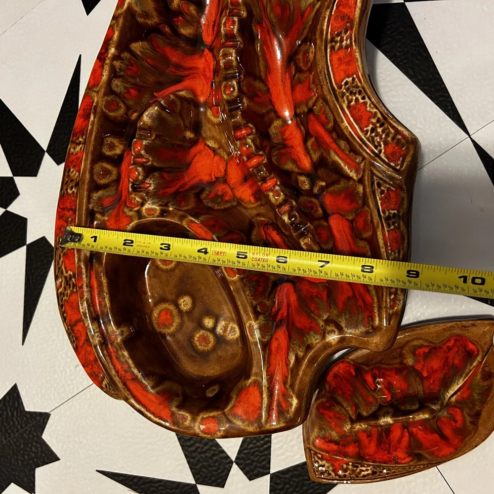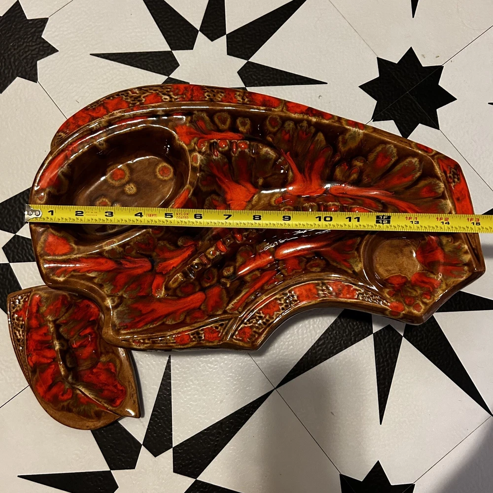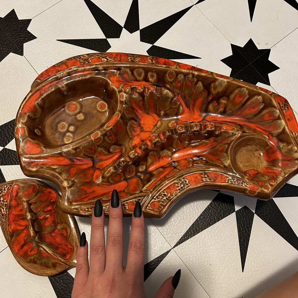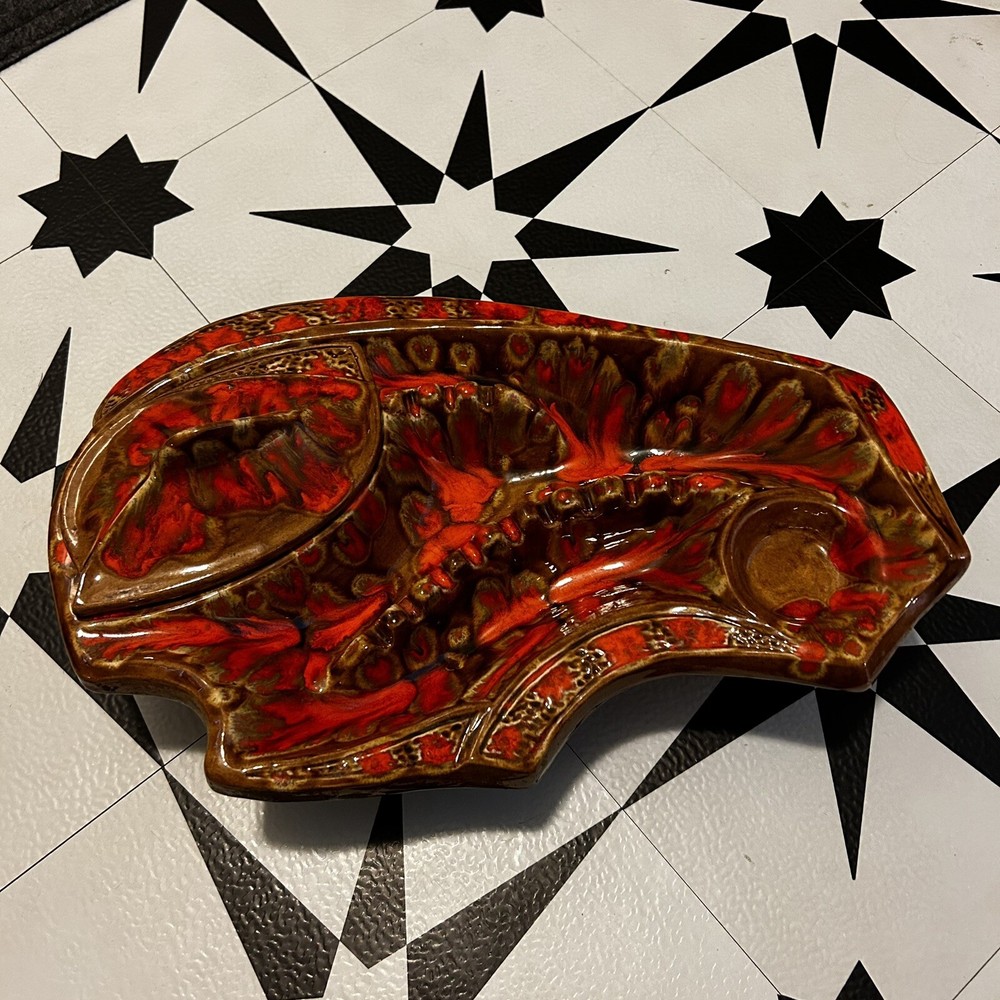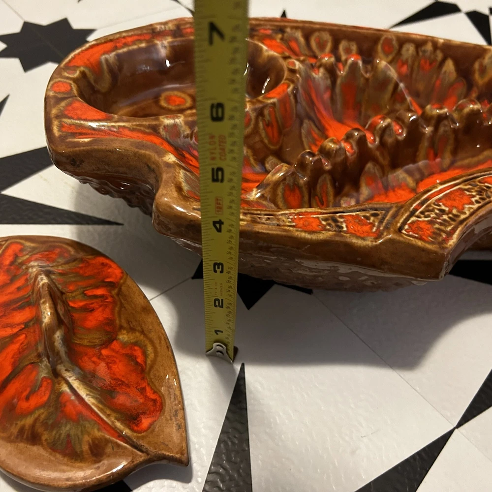 This piece is amazing! Add a touch of funky Mid-Century Modern to any room with this unique and beautiful ashtray. The free-form shaped porcelain material is beautifully glazed in orange and brown, creating a unique decorative piece. With a capacity of 12 cigarette slots, a large compartment with fitted lid and a second small round compartment, this ashtray can hold all of your goodies and the goodies of your friends! It would also work great as an entryway catch all or any other unique use you can think of. Measurements can be seen in the photos: height of 4 inches and length of 15 inches. Width is variable. There are no noticeable markings, brands or names on this piece. There is one small flaw on the lid of the larger compartment as seen in photos. It does not affect the use of the lid and is unnoticeable when closed. There are small chips in the underside of the piece as seen in photos. They do not effect the use and are unnoticeable when on display. Please let me know if you have any questions. Thank you! :)