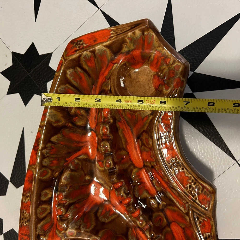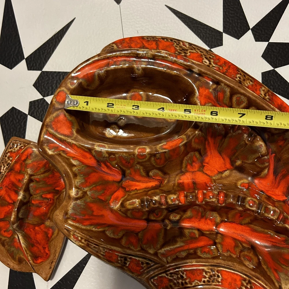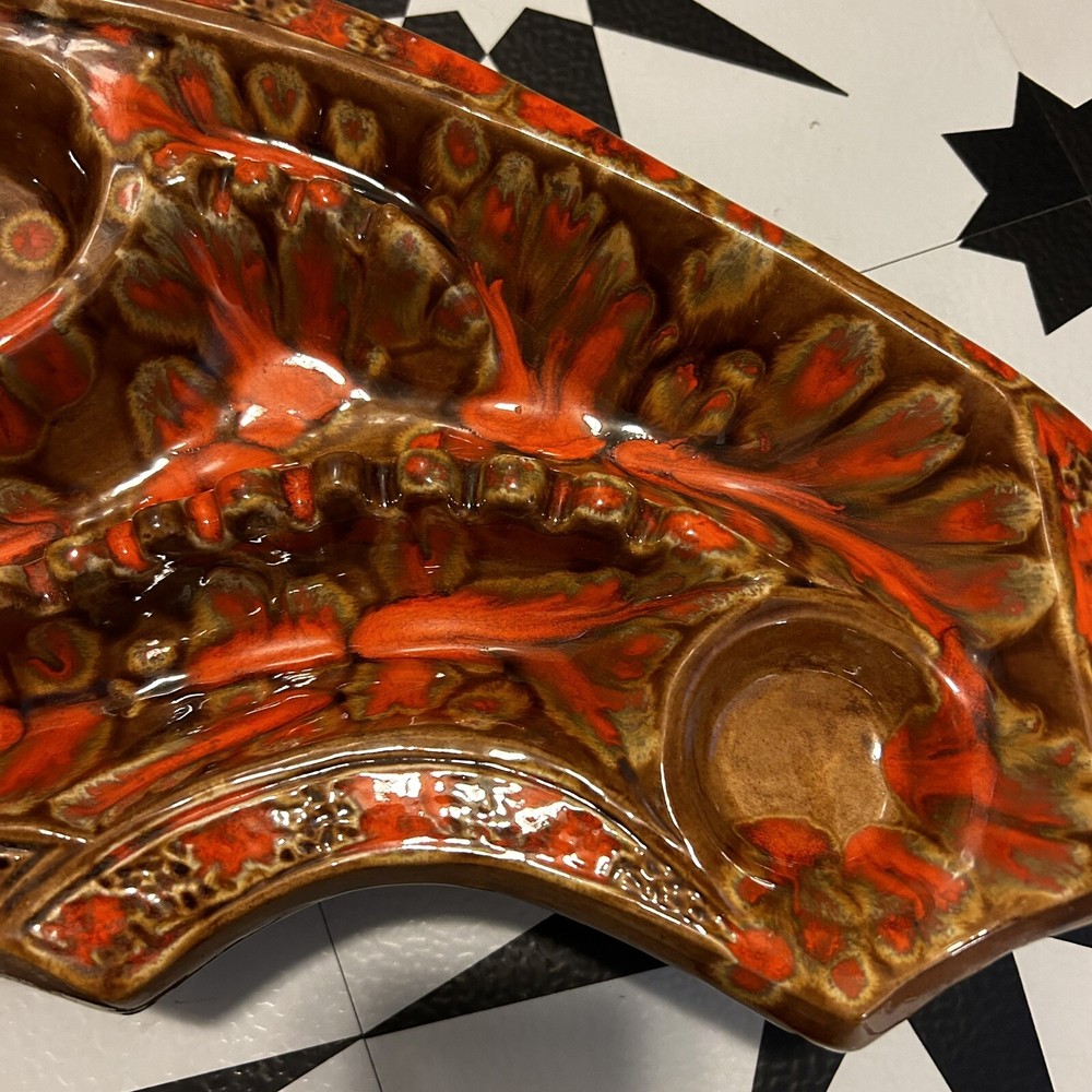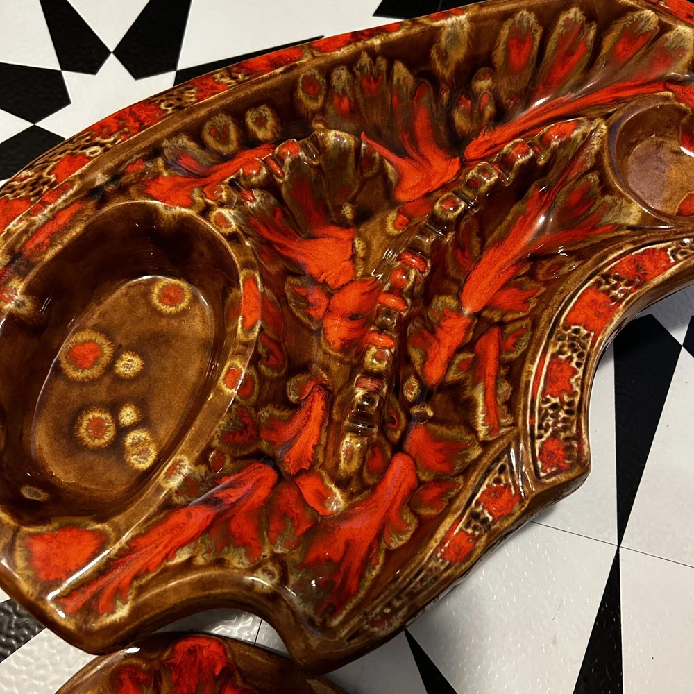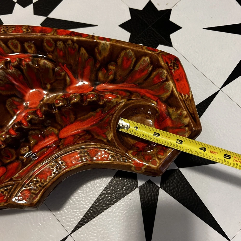 This piece is amazing! Add a touch of funky Mid-Century Modern to any room with this unique and beautiful ashtray. The free-form shaped porcelain material is beautifully glazed in orange and brown, creating a unique decorative piece. With a capacity of 12 cigarette slots, a large compartment with fitted lid and a second small round compartment, this ashtray can hold all of your goodies and the goodies of your friends! It would also work great as an entryway catch all or any other unique use you can think of. Measurements can be seen in the photos: height of 4 inches and length of 15 inches. Width is variable. There are no noticeable markings, brands or names on this piece. There is one small flaw on the lid of the larger compartment as seen in photos. It does not affect the use of the lid and is unnoticeable when closed. There are small chips in the underside of the piece as seen in photos. They do not effect the use and are unnoticeable when on display. Please let me know if you have any questions. Thank you! :)