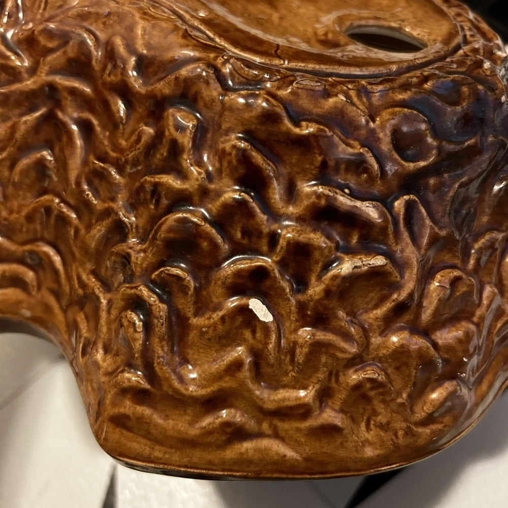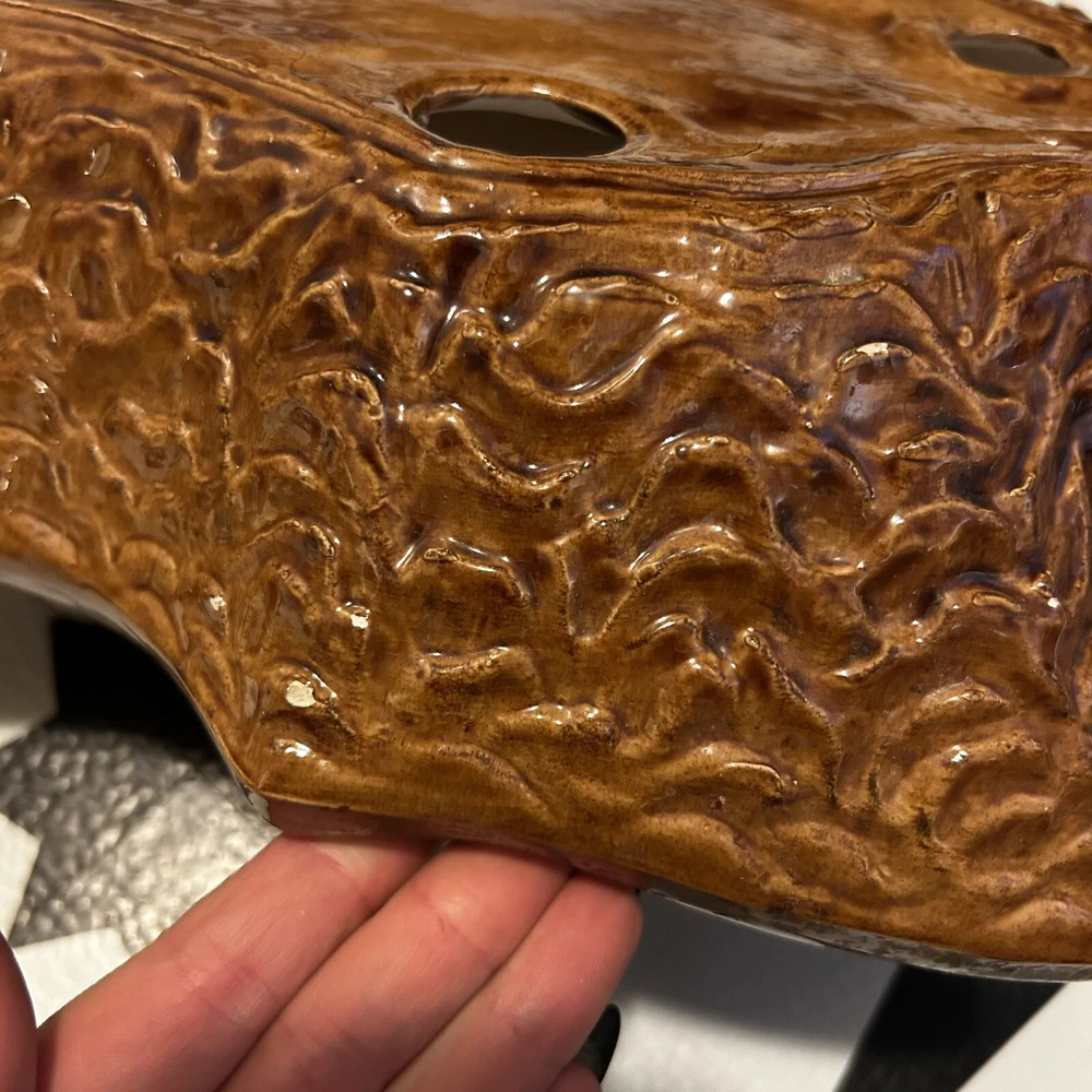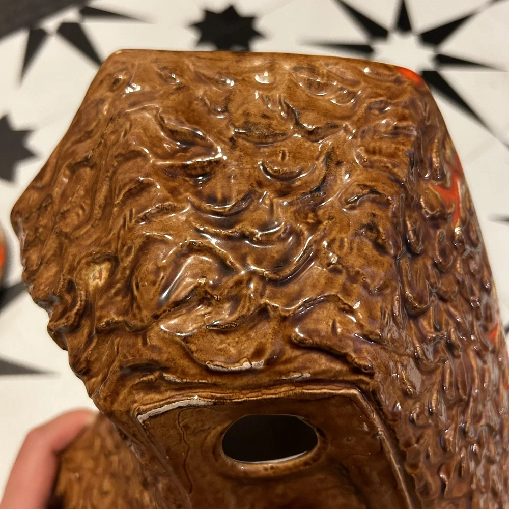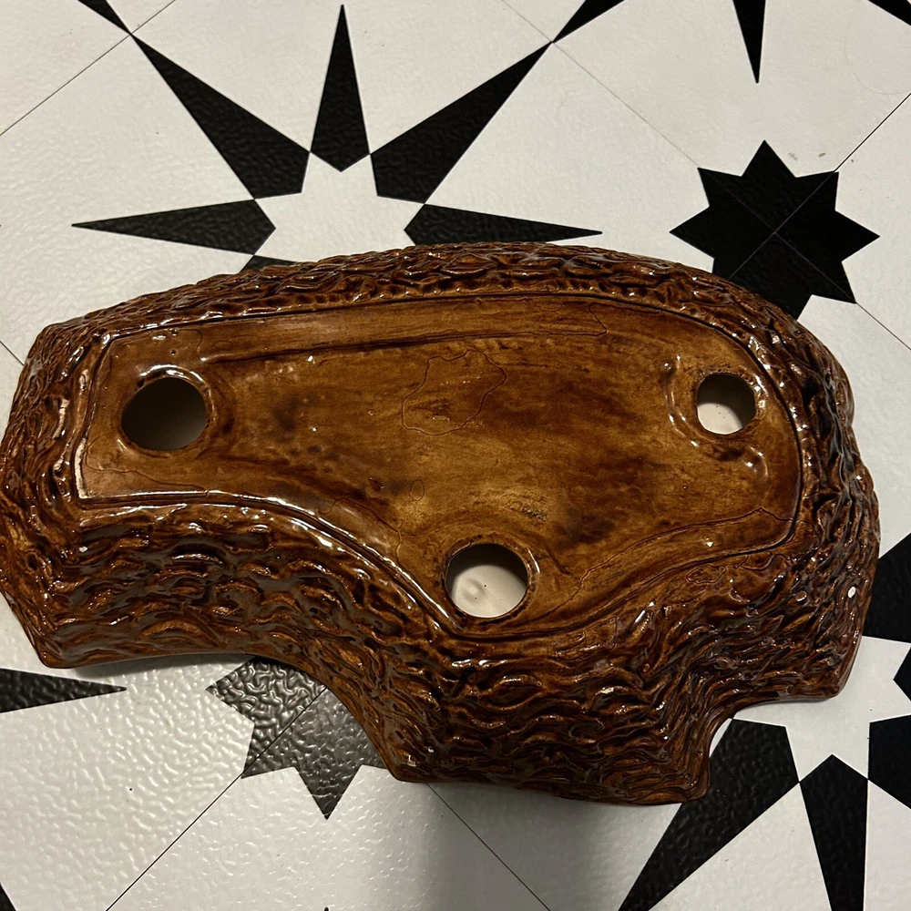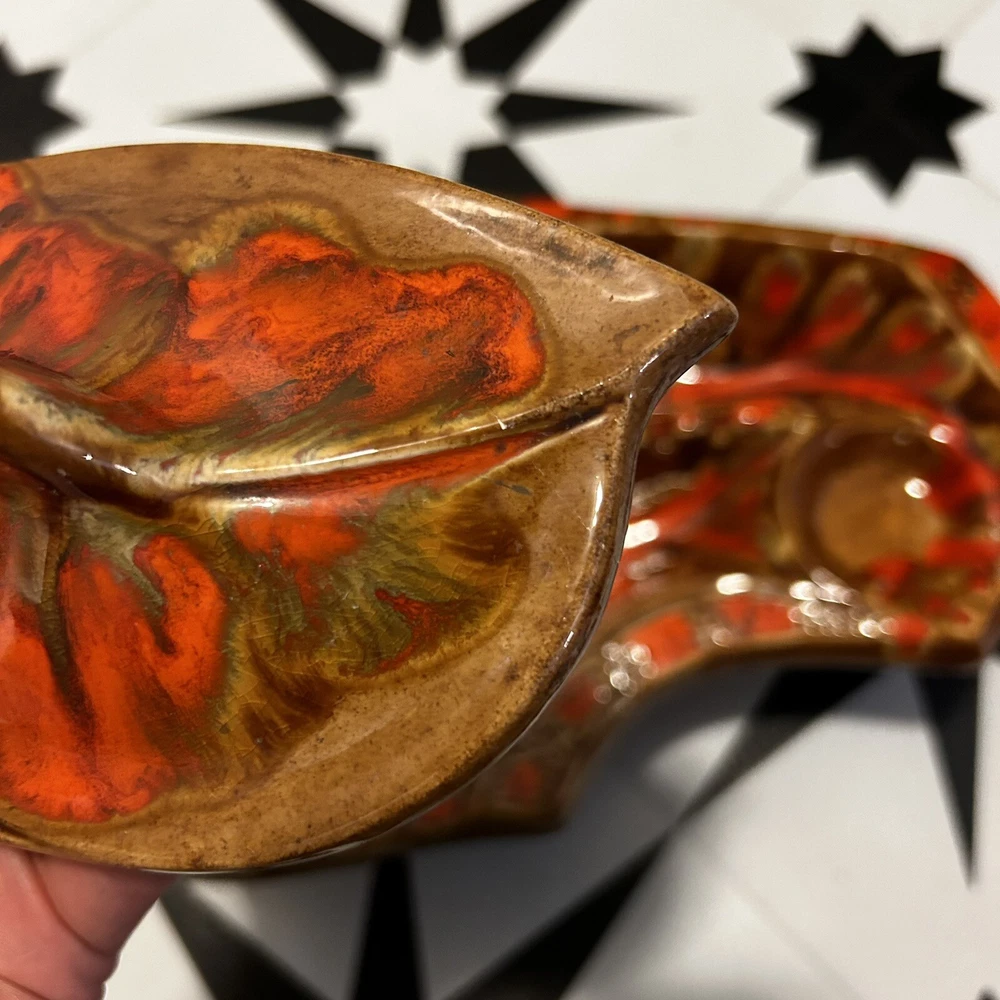 This piece is amazing! Add a touch of funky Mid-Century Modern to any room with this unique and beautiful ashtray. The free-form shaped porcelain material is beautifully glazed in orange and brown, creating a unique decorative piece. With a capacity of 12 cigarette slots, a large compartment with fitted lid and a second small round compartment, this ashtray can hold all of your goodies and the goodies of your friends! It would also work great as an entryway catch all or any other unique use you can think of. Measurements can be seen in the photos: height of 4 inches and length of 15 inches. Width is variable. There are no noticeable markings, brands or names on this piece. There is one small flaw on the lid of the larger compartment as seen in photos. It does not affect the use of the lid and is unnoticeable when closed. There are small chips in the underside of the piece as seen in photos. They do not effect the use and are unnoticeable when on display. Please let me know if you have any questions. Thank you! :)