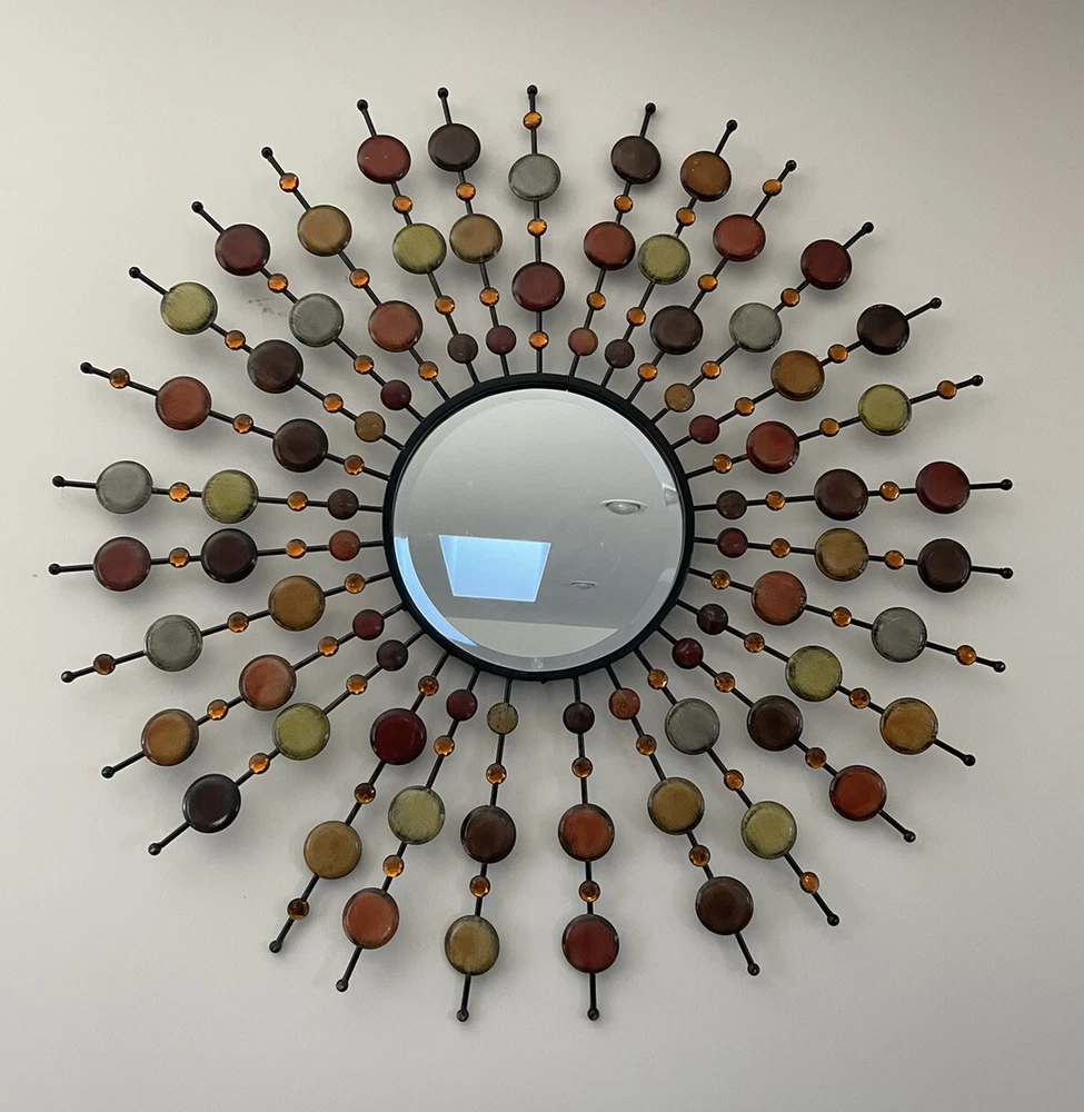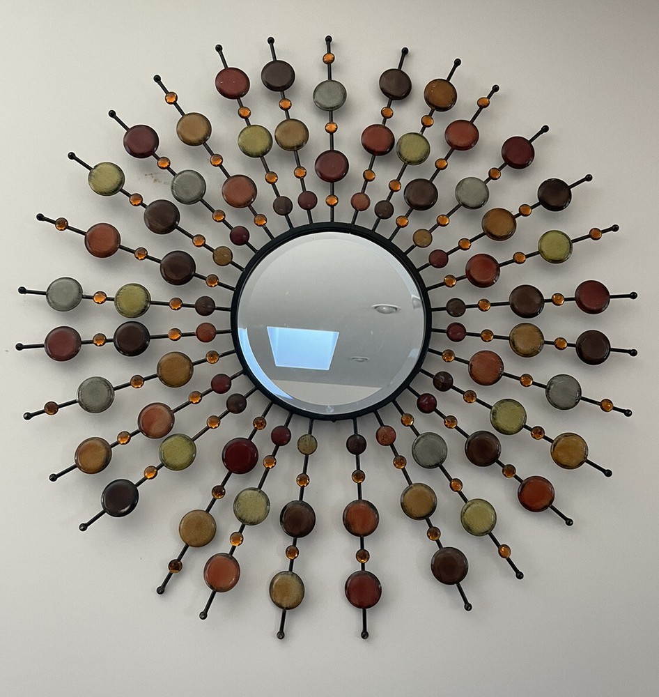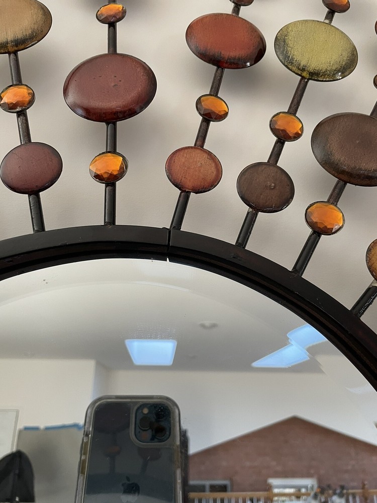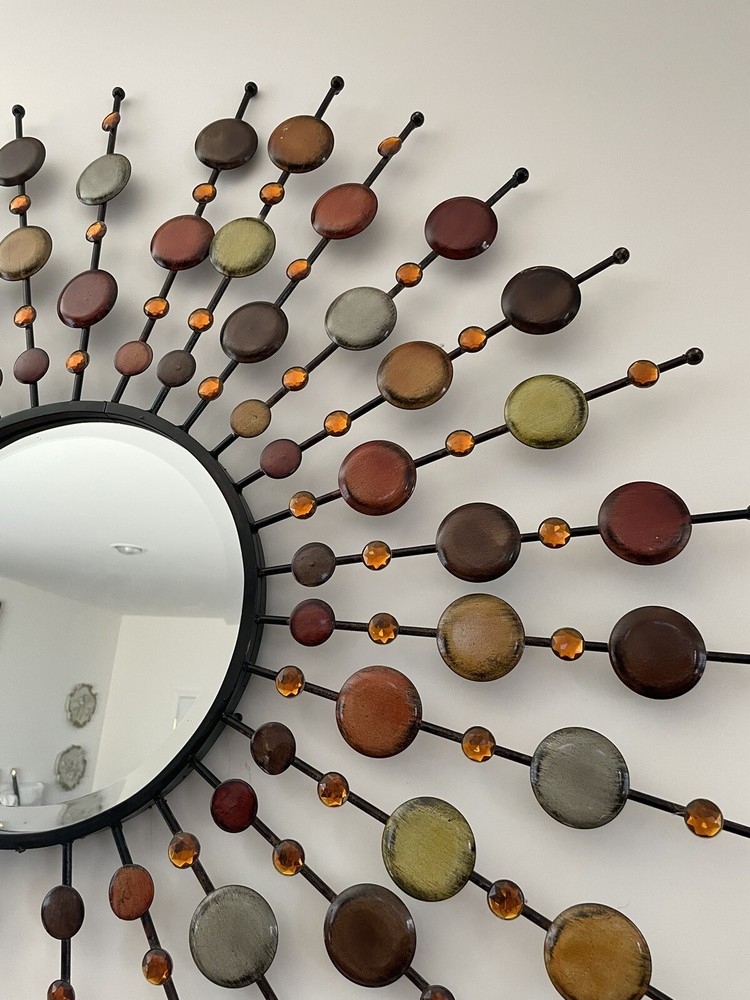 Mid Century Mirror | VINTAGE Beautiful design and workmanship. Beveled mirror with bursts of prongs with orange crystals and round metal circles. This is a large decorative mirror. Special Note - there is one decorative prong that is missing from the bottom. Easy to hang. Overall Measurements: 37" (L) x 37" (W) Mirror is 12" For additional information scroll to the right and click “Contact Seller” tab, my response time is very quick. To ship this item to CA the cost is over $400, if this price works for you, I will revise the posting to include shipping, otherwise, I can only offer local pick-up. Feedback will be given immediately once favorable comments have been received. Prior to leaving negative or neutral feedback, please contact me. Thank you!