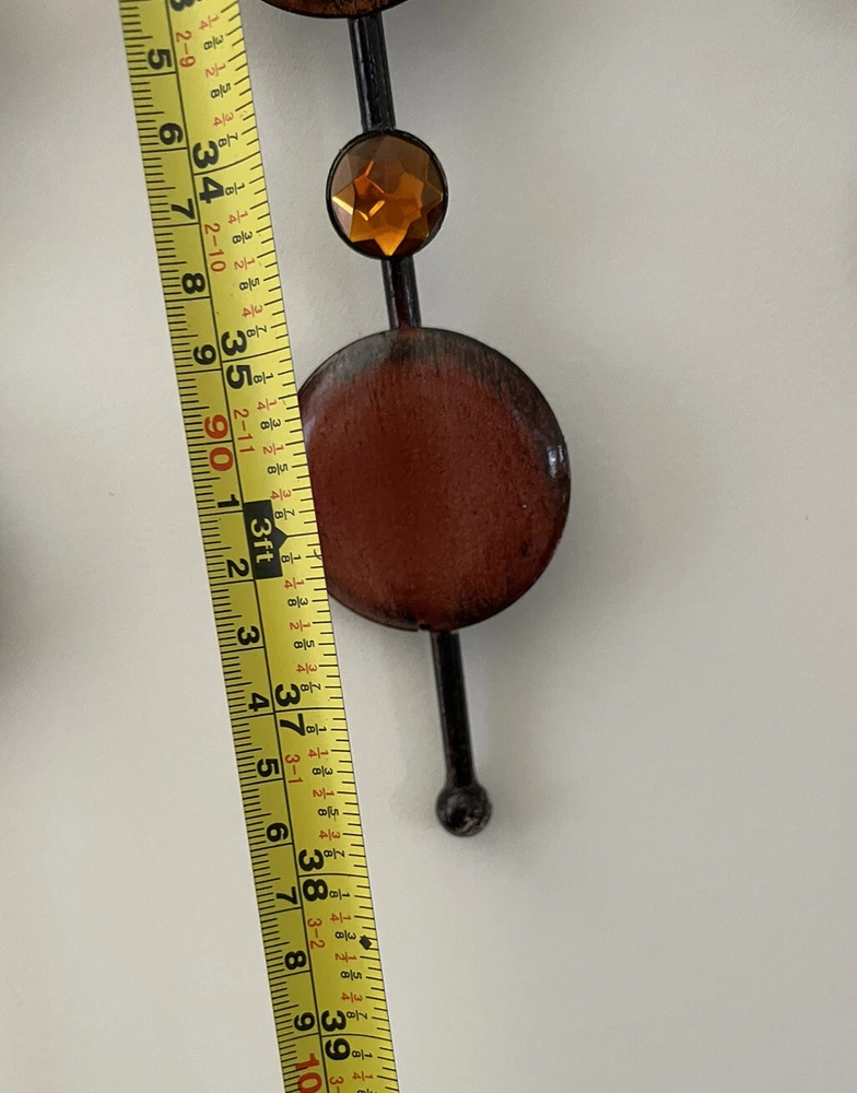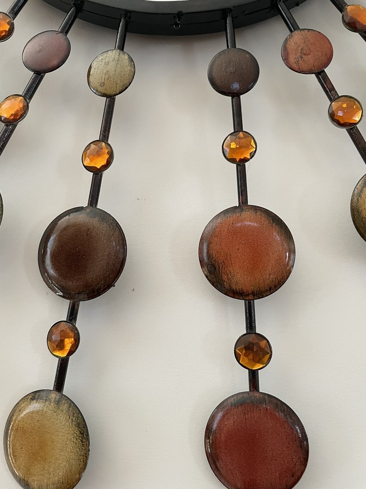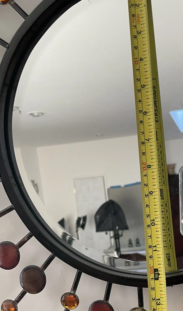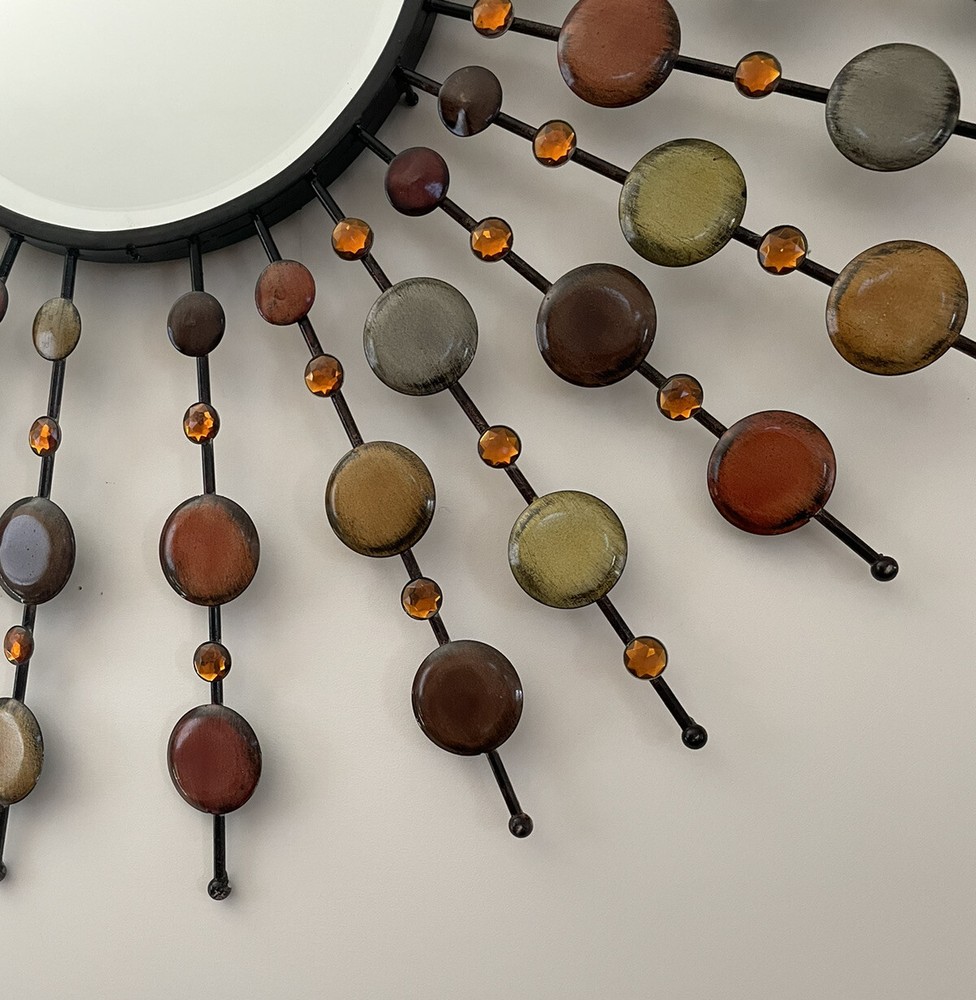 Mid Century Mirror | VINTAGE Beautiful design and workmanship. Beveled mirror with bursts of prongs with orange crystals and round metal circles. This is a large decorative mirror. Special Note - there is one decorative prong that is missing from the bottom. Easy to hang. Overall Measurements: 37" (L) x 37" (W) Mirror is 12" For additional information scroll to the right and click “Contact Seller” tab, my response time is very quick. To ship this item to CA the cost is over $400, if this price works for you, I will revise the posting to include shipping, otherwise, I can only offer local pick-up. Feedback will be given immediately once favorable comments have been received. Prior to leaving negative or neutral feedback, please contact me. Thank you!