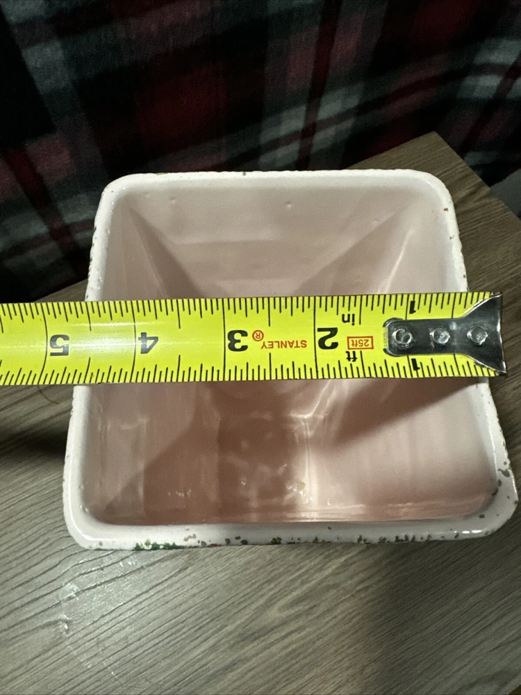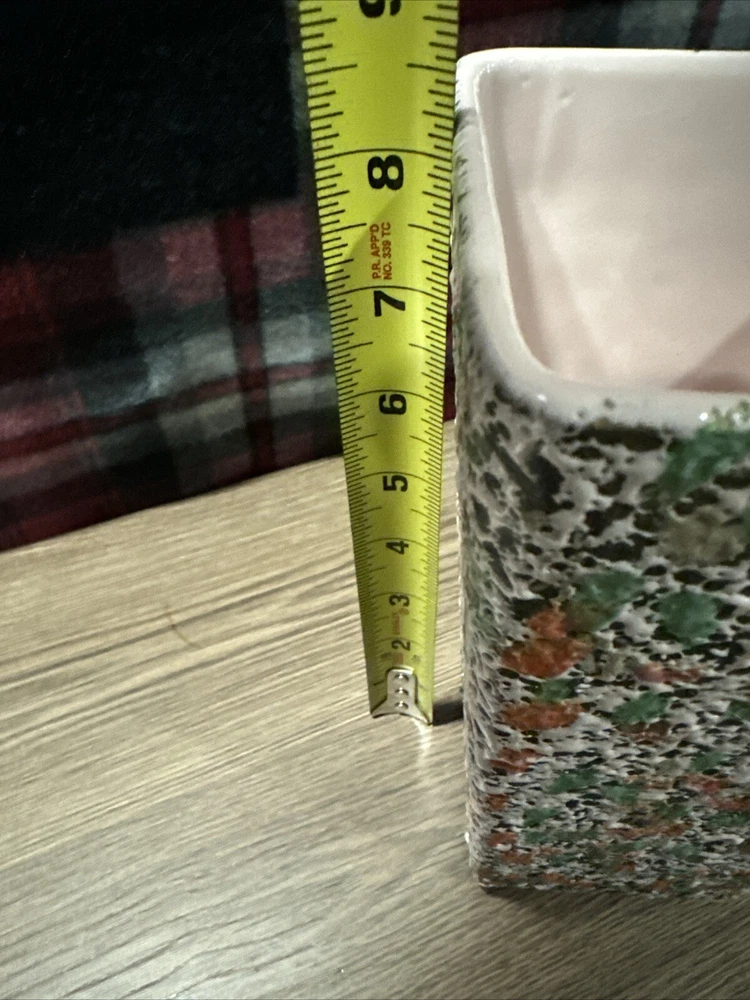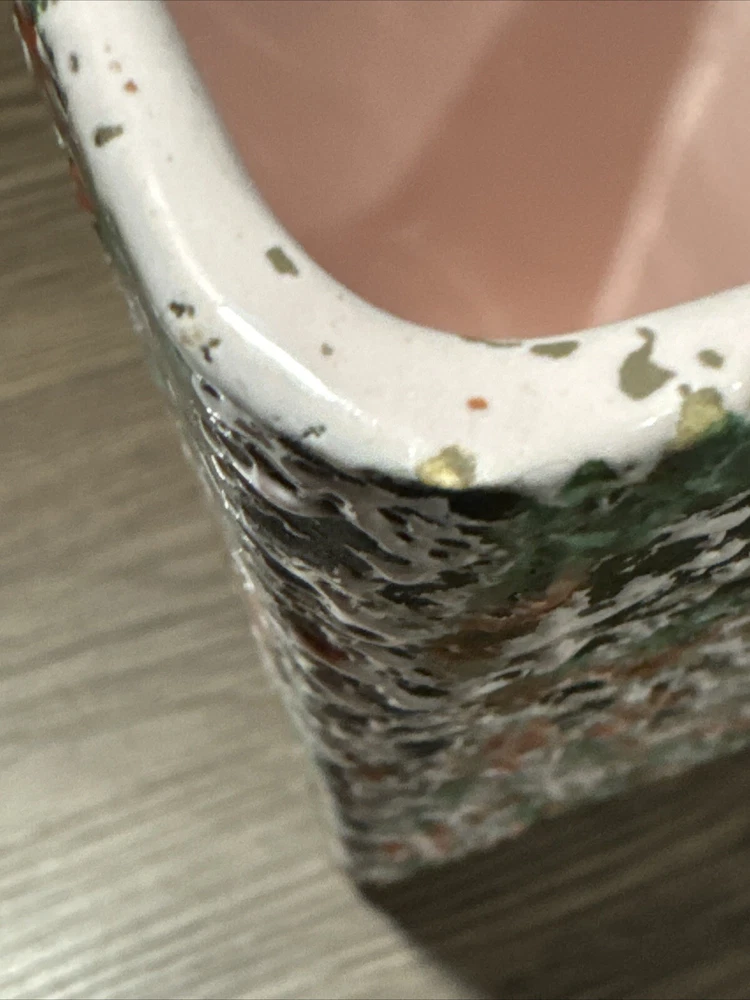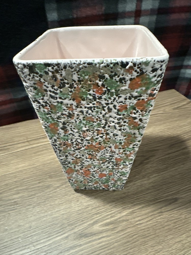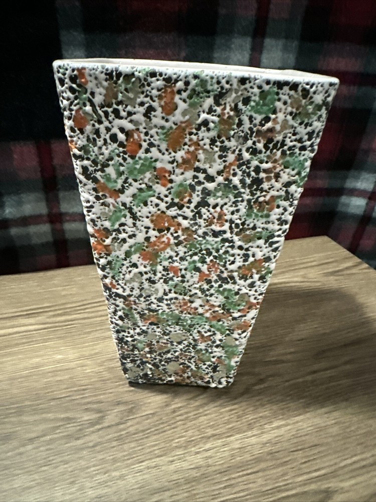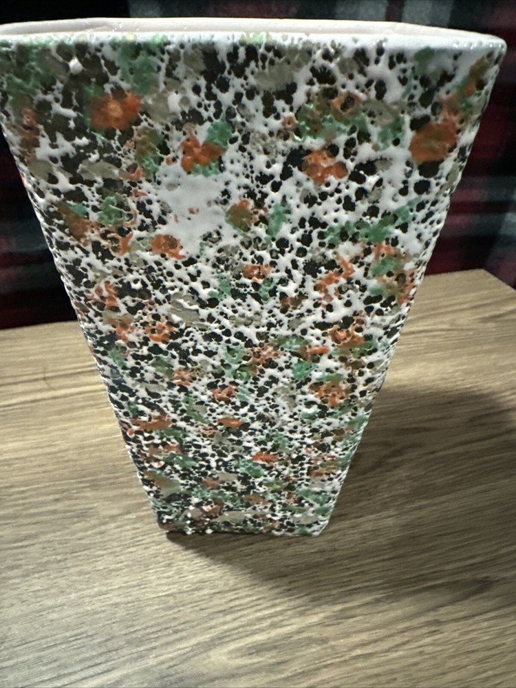 About 4.5” opening across the top(see photos). 8.5” tall. Great mid- century modern colors. There’s one spot where the splatter is different but it just gives it character. There’s one small bite and some rough areas along the top rim. It looks like the glaze didn’t pull together on most of them except for the one bite. See last photos. Please look at all photos. They are part of the description. Payment is due at time of purchase. Items are shipped within 3 days of cleared payment. Holidays can affect shipping. If you are wanting to buy more than one item please provide the item information and your zip code and I will give you a shipping cost. I do not ship outside the USA. I do not except returns unless the item is damaged or wrong item is sent. If you are buying cloth ing or shoes know your size. Thank you. - [ ]