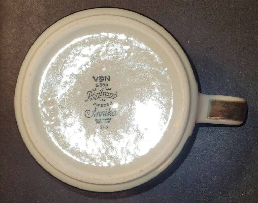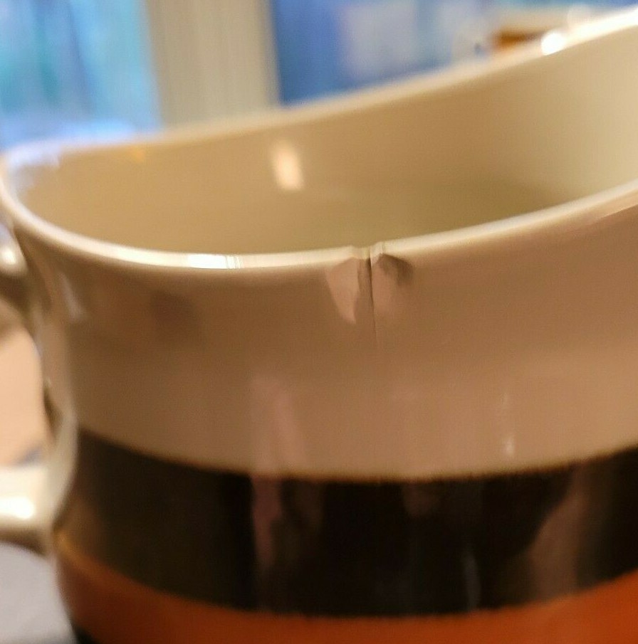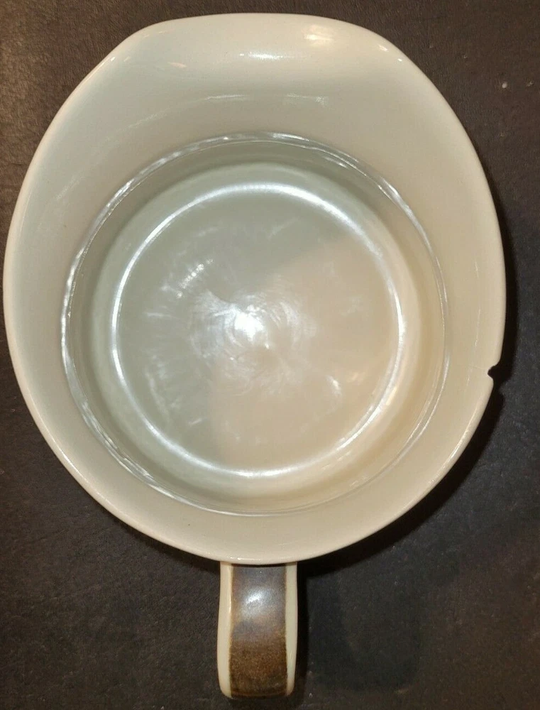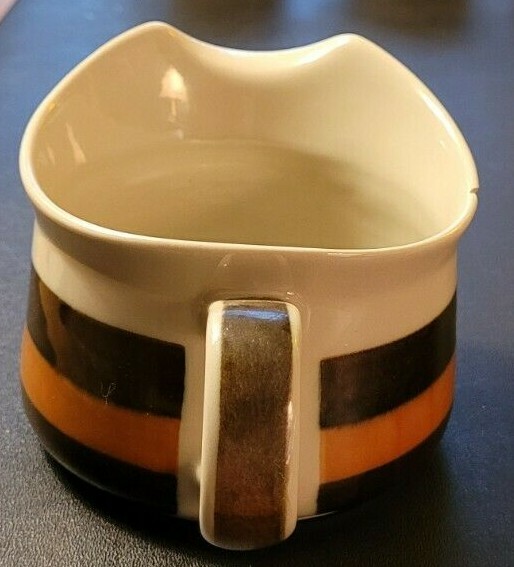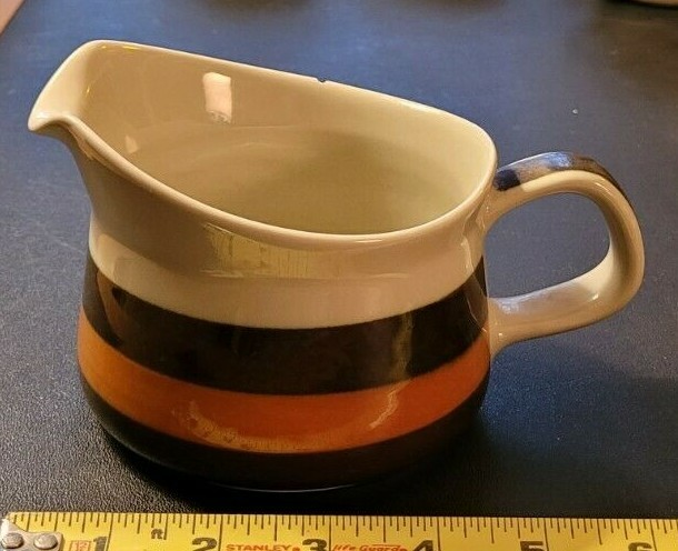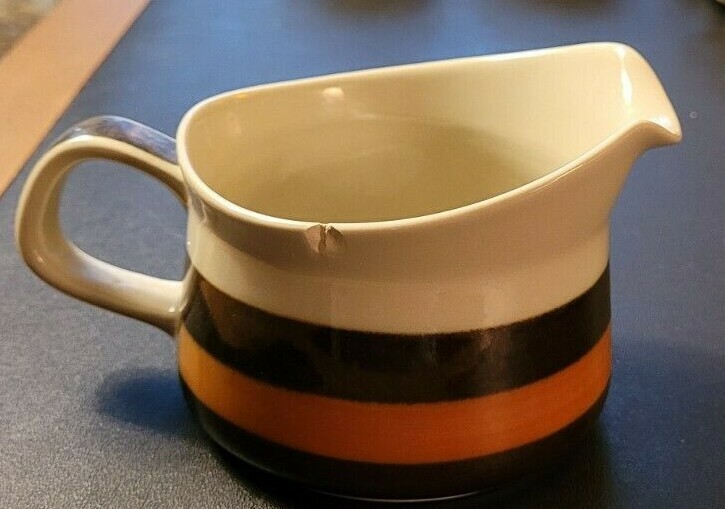 Rorstrand Annika Brown/Orange Stoneware Gravy Boat #731 4.5" diameter One chip on rim - see photos Mid-Century Swedish design. Beige with hand-painted brown and orange stripes - glossy glaze Designed by Marianne Westman - 1972 Made in Sweden Bought in Copenhagen, 1972 One owner Shipping to US only