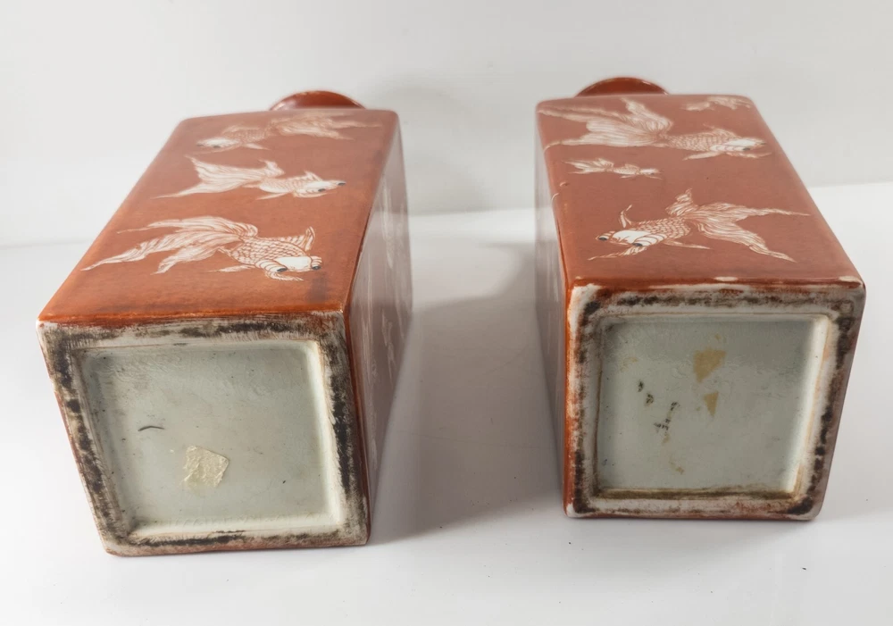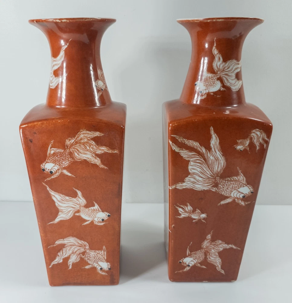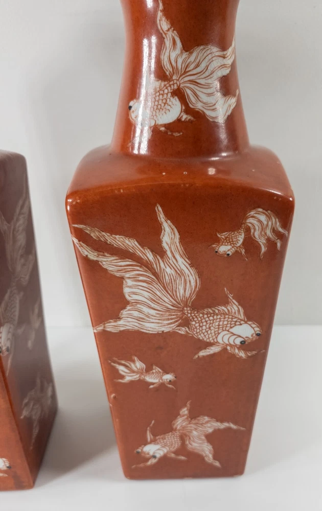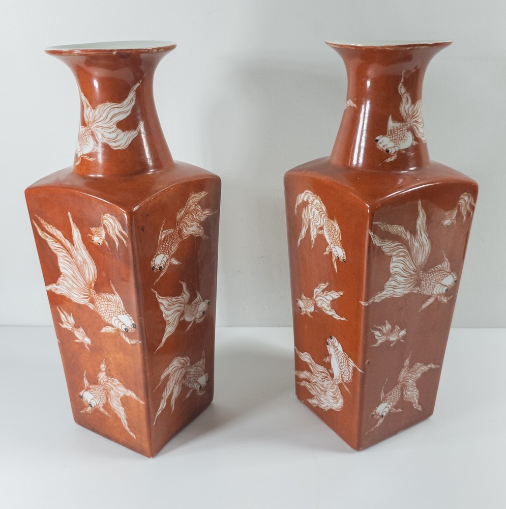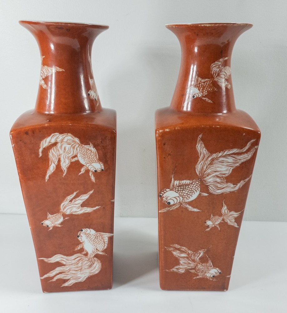 Vases We are selling this pair of Chinese Iron red glazed transferware vases with goldfish or koi decoration. The vases appear to be late 20th century circa 1980 or 1990 but have nice decorative appeal. Condition: Good vintage contemporary condition. Dimensions: Height 14 7/8 Inches 37.8 cm Width 5 1/8 Inches 13.1 cm Depth 5 1/8 Inches 13.1 cm Some items we offer have age and wear, this wear due to age may include breaks, repairs, repainting, or restoration, we try to call this damage as well as possible but please refer to the photography for a full description. We try to identify and describe our items to the best of our ability however we are not experts and our estimates of age, period or attribution should be taken as speculation and not fact.Our descriptions are solely there to assist buyers finding the items and are not an accurate description of the item in all cases. Ultimately the pictures we take serve as our description. This fine antique is offered with a fair and reasonable fixed price, I trust my descriptions and photos detail this item to justify the asking price. If you do need information I have neglected to include, make an offer, or additional photos, please don't hesitate to ask, I will do my best to comply. If you desire to have your purchases insured, I am happy to do so if you request it. If you do not instruct me to insure for you,my responsibility will end when the USPS delivers to your mail service. Good Luck! Thank you for looking!