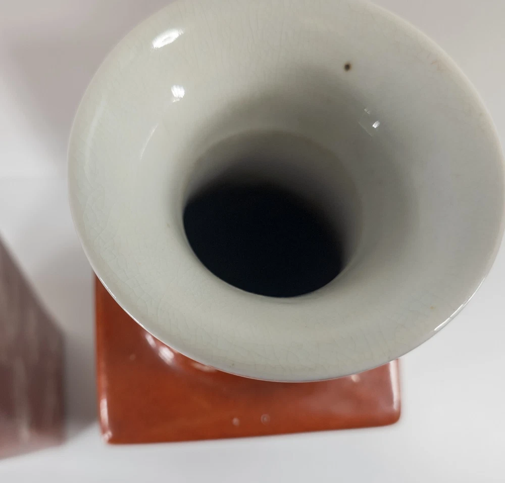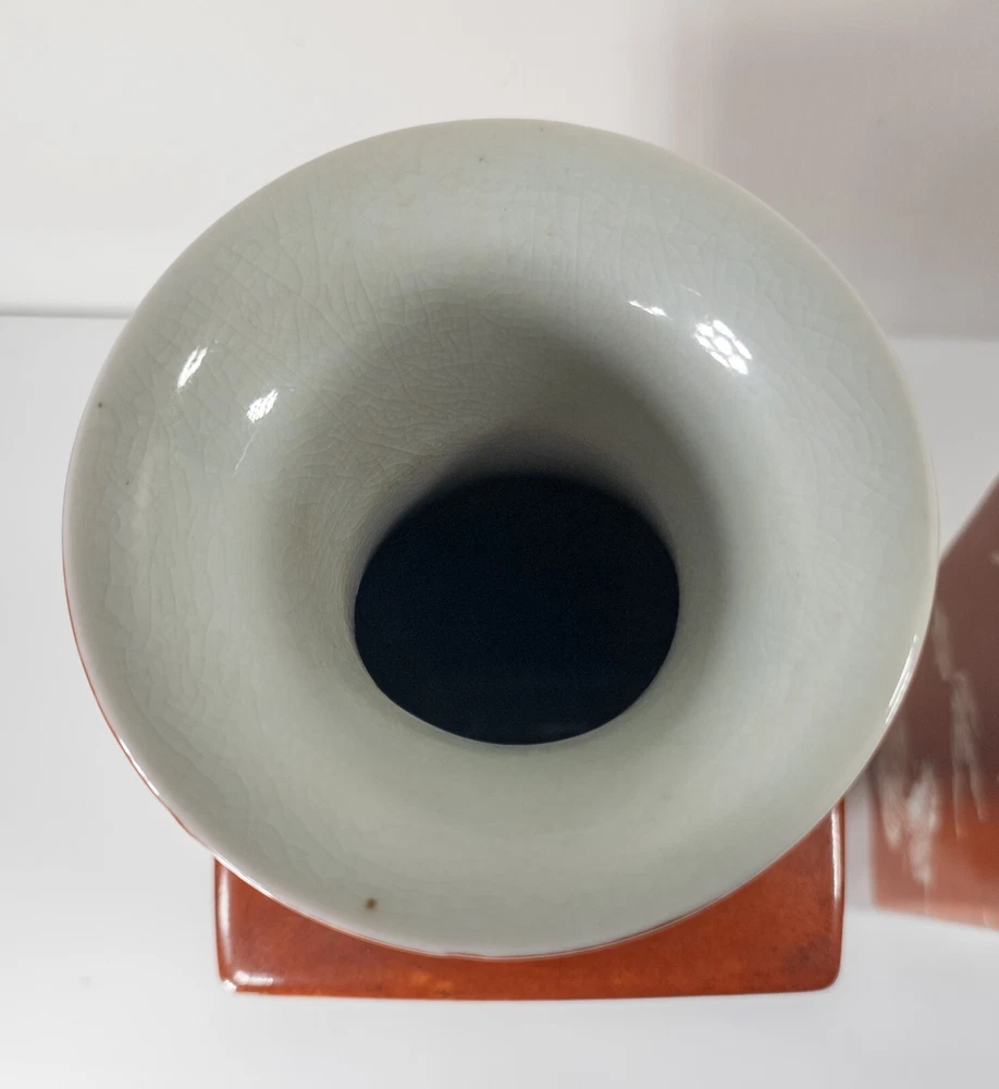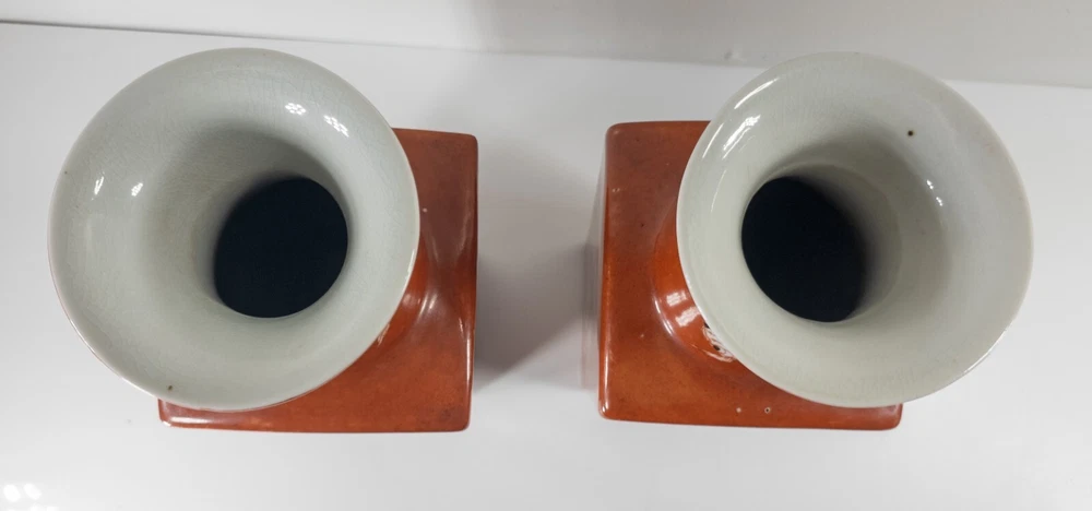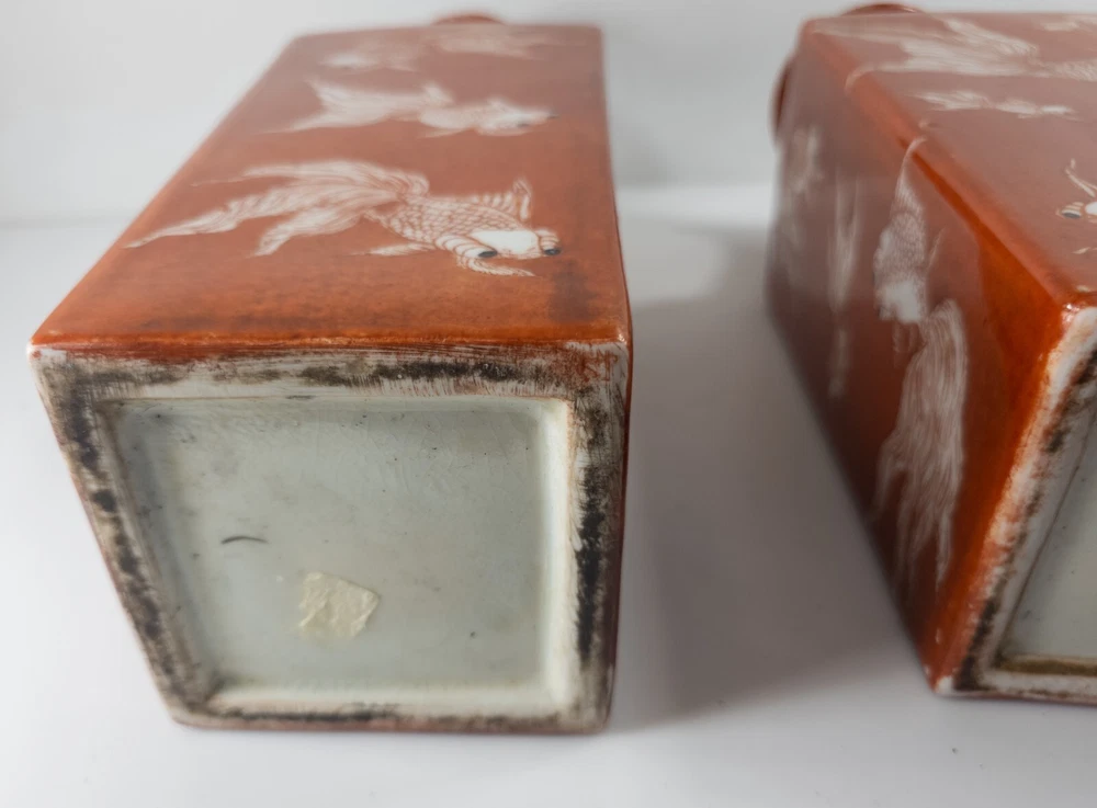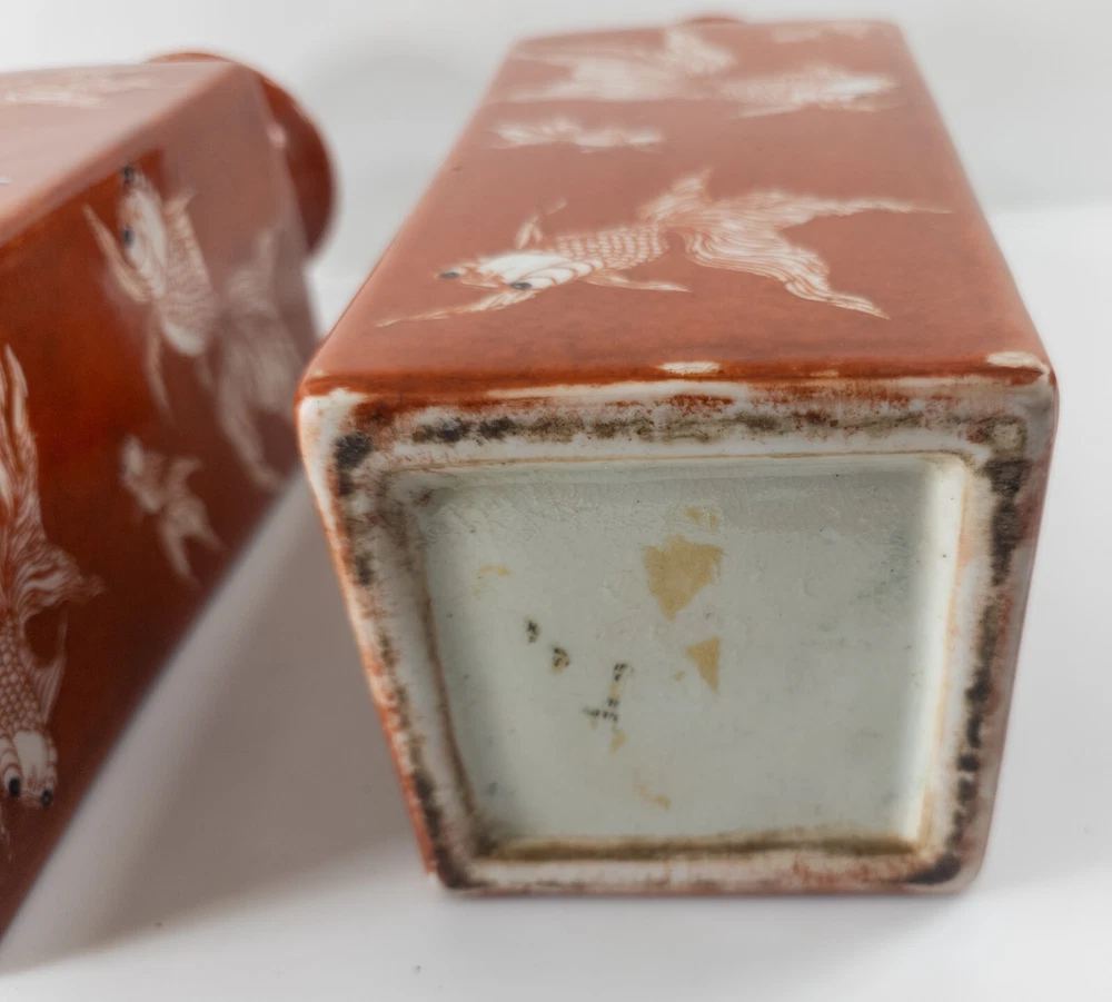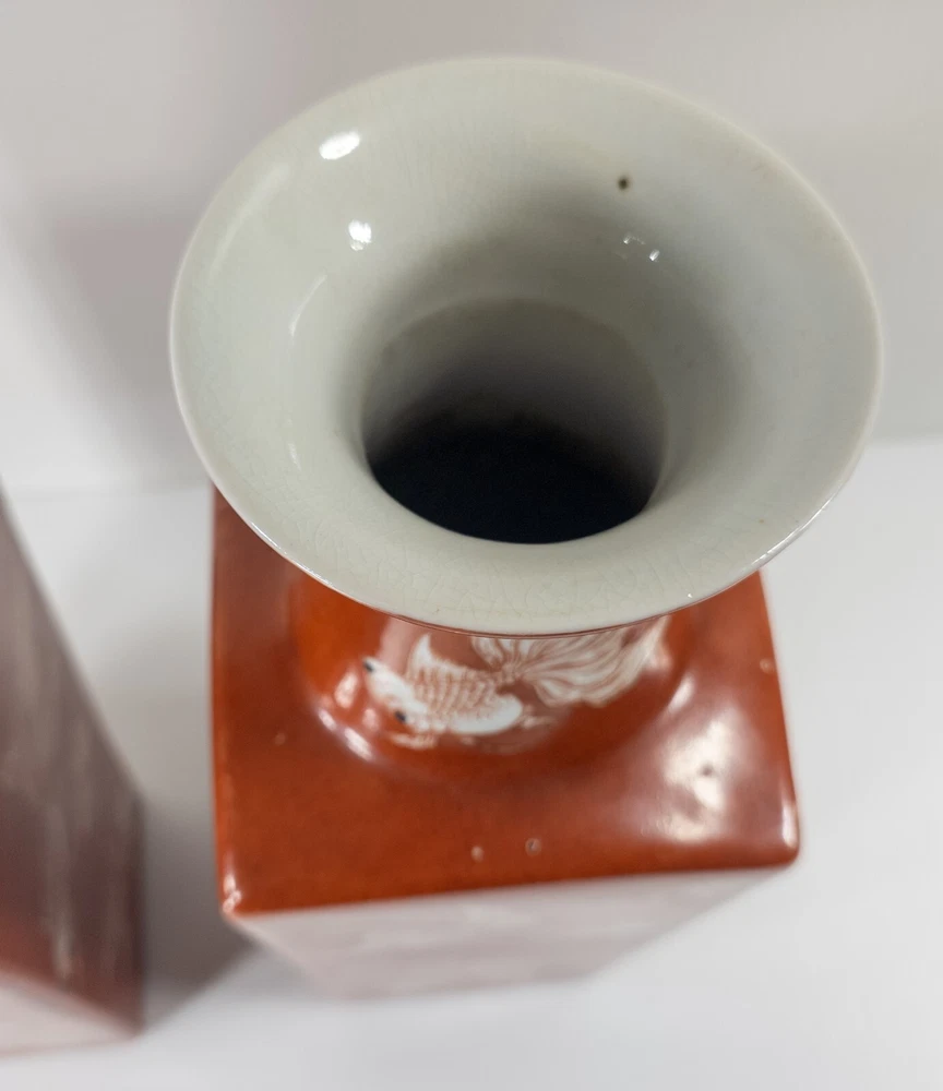 Vases We are selling this pair of Chinese Iron red glazed transferware vases with goldfish or koi decoration. The vases appear to be late 20th century circa 1980 or 1990 but have nice decorative appeal. Condition: Good vintage contemporary condition. Dimensions: Height 14 7/8 Inches 37.8 cm Width 5 1/8 Inches 13.1 cm Depth 5 1/8 Inches 13.1 cm Some items we offer have age and wear, this wear due to age may include breaks, repairs, repainting, or restoration, we try to call this damage as well as possible but please refer to the photography for a full description. We try to identify and describe our items to the best of our ability however we are not experts and our estimates of age, period or attribution should be taken as speculation and not fact.Our descriptions are solely there to assist buyers finding the items and are not an accurate description of the item in all cases. Ultimately the pictures we take serve as our description. This fine antique is offered with a fair and reasonable fixed price, I trust my descriptions and photos detail this item to justify the asking price. If you do need information I have neglected to include, make an offer, or additional photos, please don't hesitate to ask, I will do my best to comply. If you desire to have your purchases insured, I am happy to do so if you request it. If you do not instruct me to insure for you,my responsibility will end when the USPS delivers to your mail service. Good Luck! Thank you for looking!