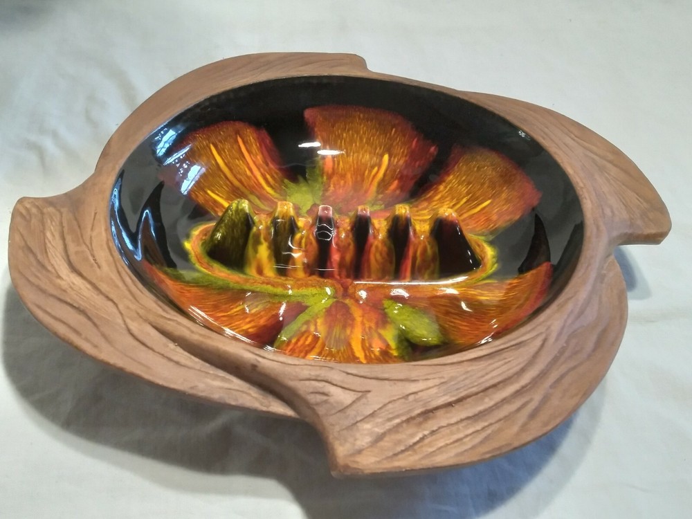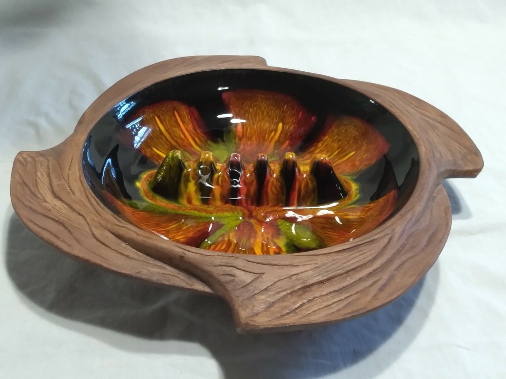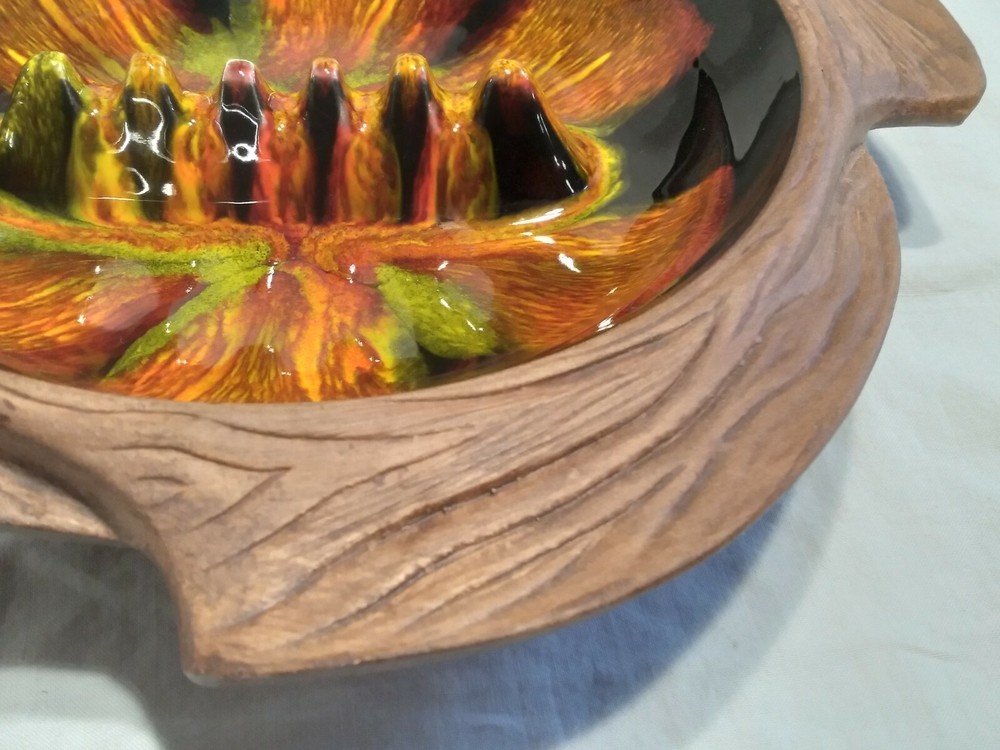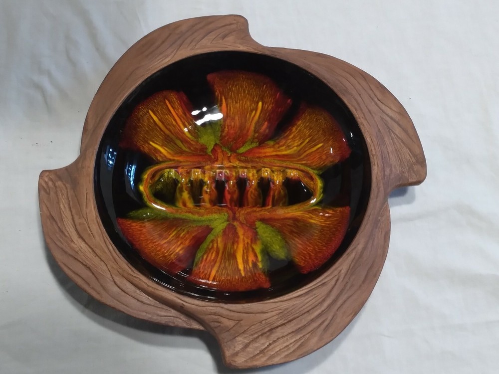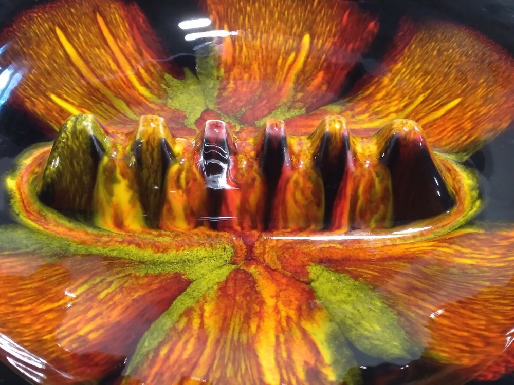 Mid-century Atomic Orange Lava Ashtray California Pottery Pristine Rare. Super piece, great design and in pristine condition shows no sign of prior use. All four green felt feet are even intact. The glaze work is truley fantastic. Ashtray measures 10.5" inches in diameter and 2" inches tall. A real mid-century treasure of a piece!