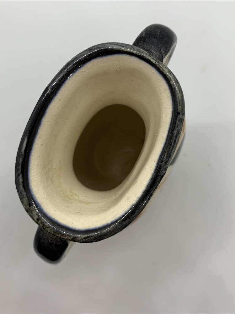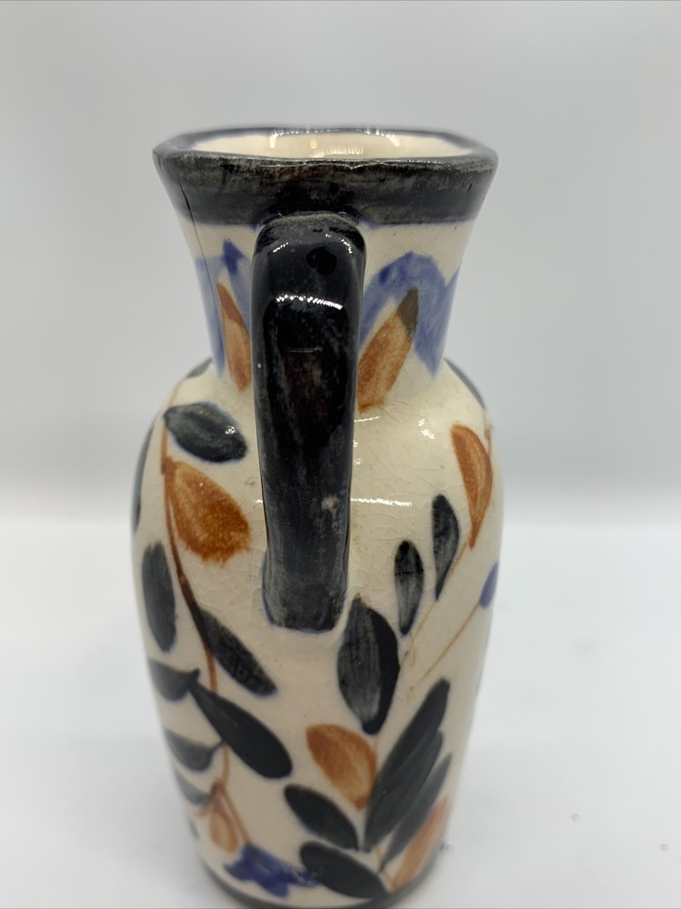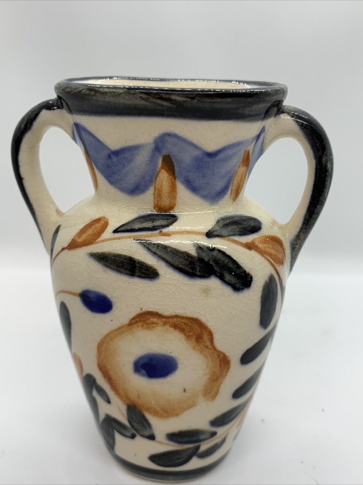 Mid-century Japan Blue Orange Black Ivory Floral Two-Handled Vase. 4-3/4” tall 4”” across 2” wide