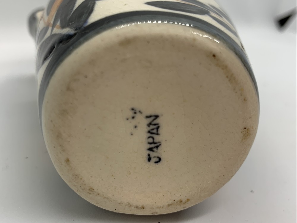 Mid-century Japan Blue Orange Black Ivory Floral Two-Handled Vase. 4-3/4” tall 4”” across 2” wide...