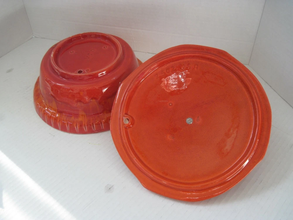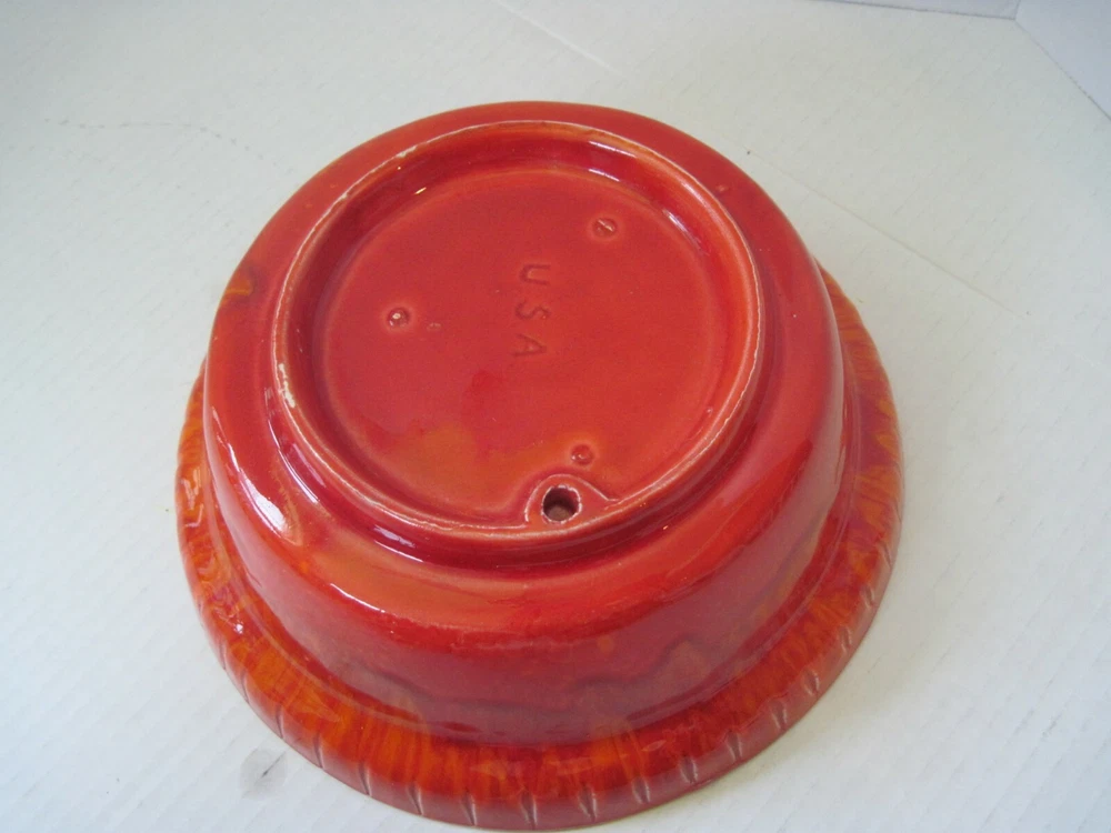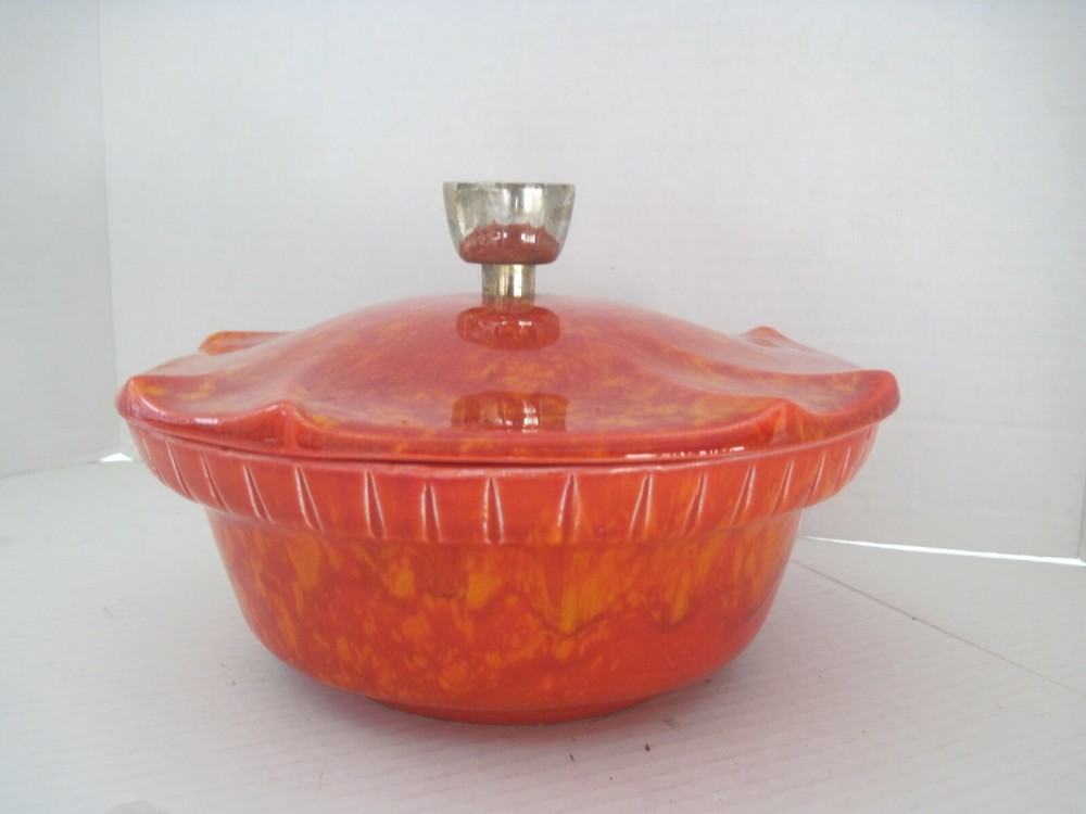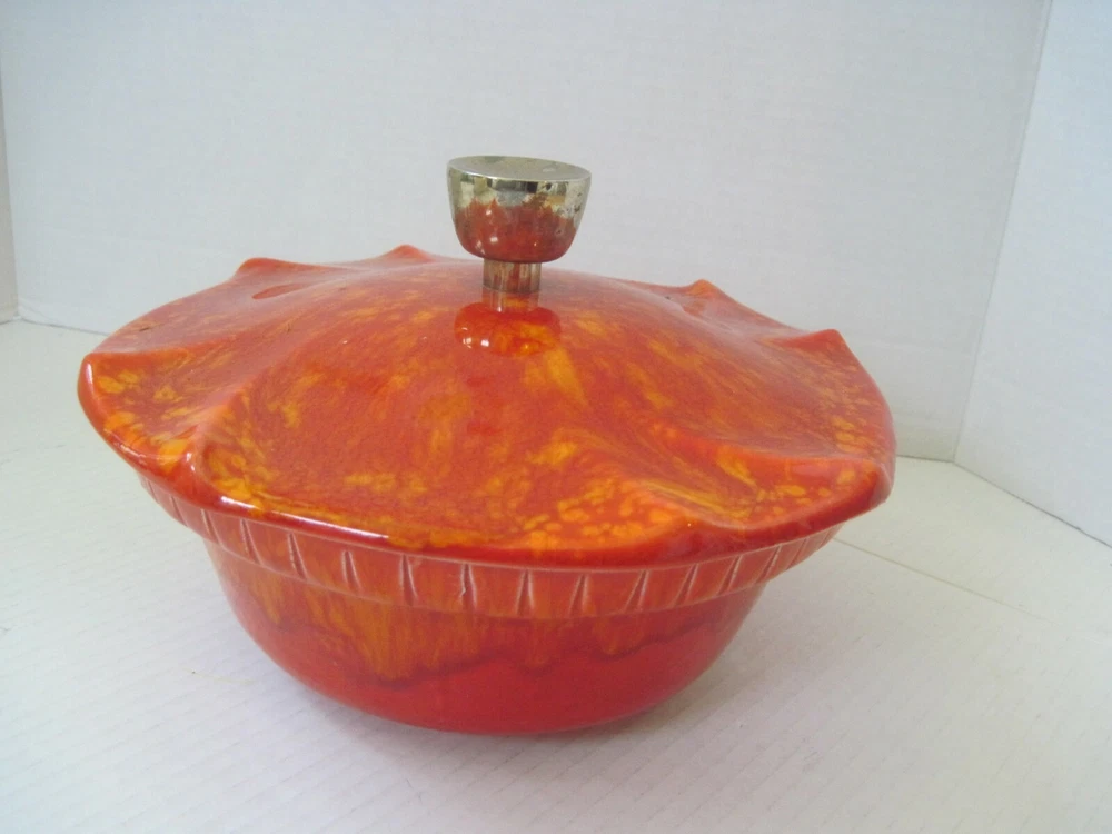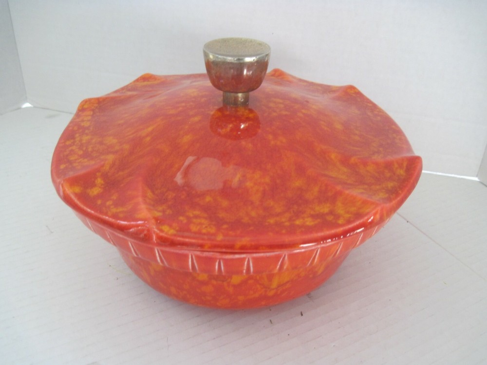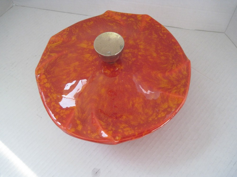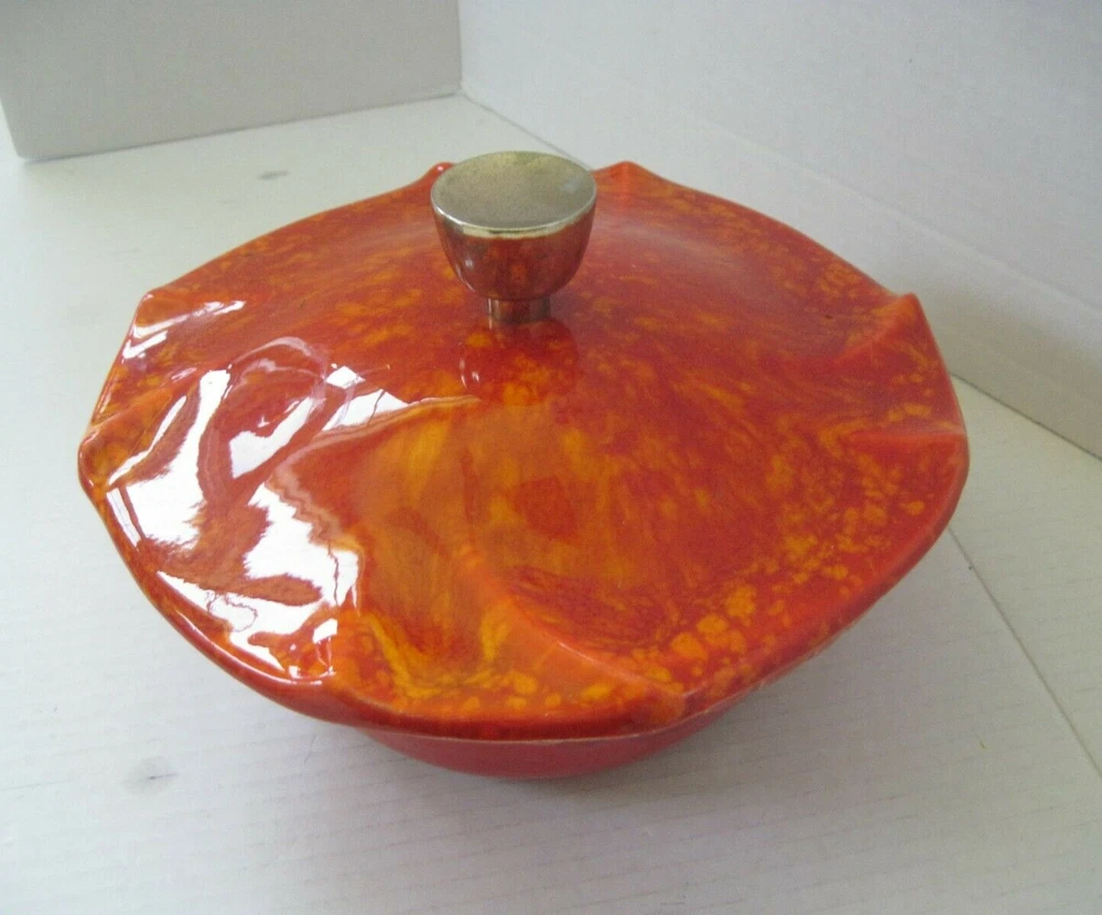 DESCRIPTION Midcentury Mid Century Pottery Fire Orange Red Yellow with Lid 1960s Color: Red, Orange and Yellow Blend Handmade Ceramic Gold Lid Know Ideal for Nuts, Candy and more! Marks Bottom2505 USA MEASUREMENTS Height 4nches Dimensions Across Top 8.25x8.25 Circumference Around 26 inches CONDITION Perfect Condition! No Damage, Hairlines or Chips! FAST SHIPMENTS FREE SHIPPING for this listing is ONLY for DOMESTIC Bidders inside the USA International bidders must pay postage and any other expenses for this purchase such as duties, taxes, and customs clearance fees.