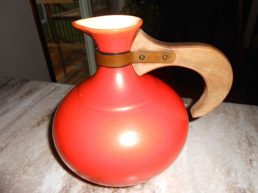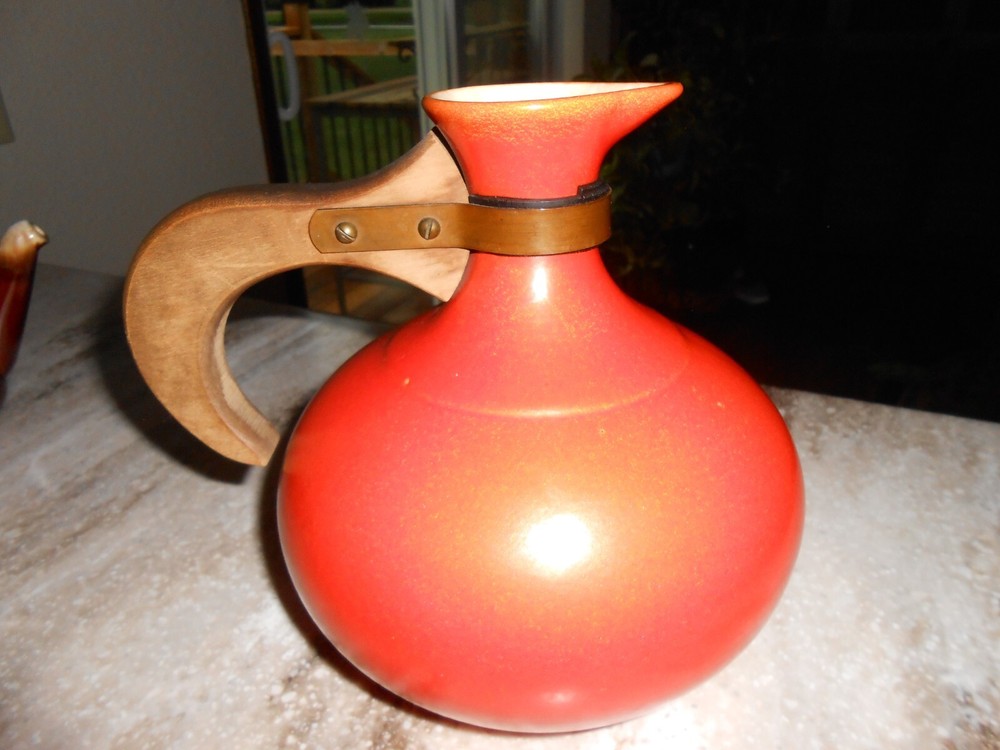 Listed is a Los Angeles Ceramics pitcher/carafe #565. It is about 8.5" with handle, 7.5" tall, x and the pot is about 6" around. It is a rare find and due to its age, it does have crazing inside the s...
