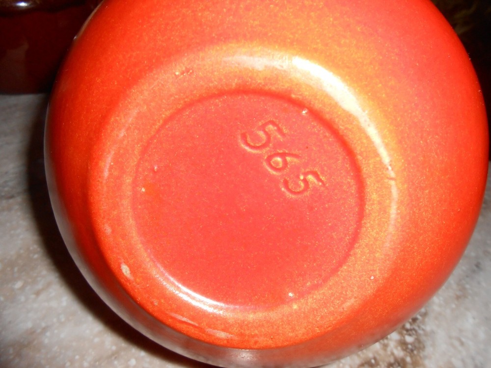 Listed is a Los Angeles Ceramics pitcher/carafe #565. It is about 8.5" with handle, 7.5" tall, x and the pot is about 6" around. It is a rare find and due to its age, it does have crazing inside the spout and neck.